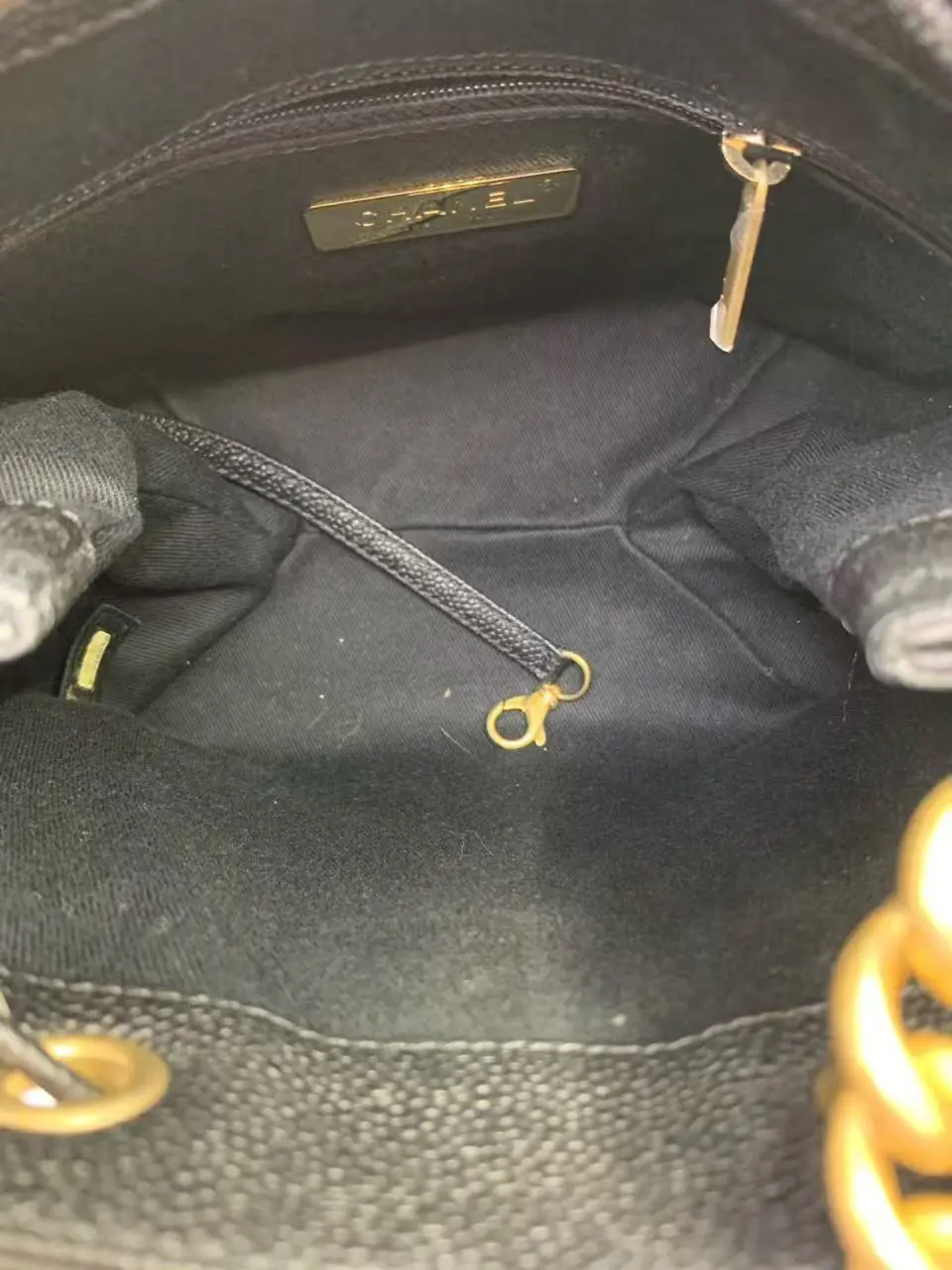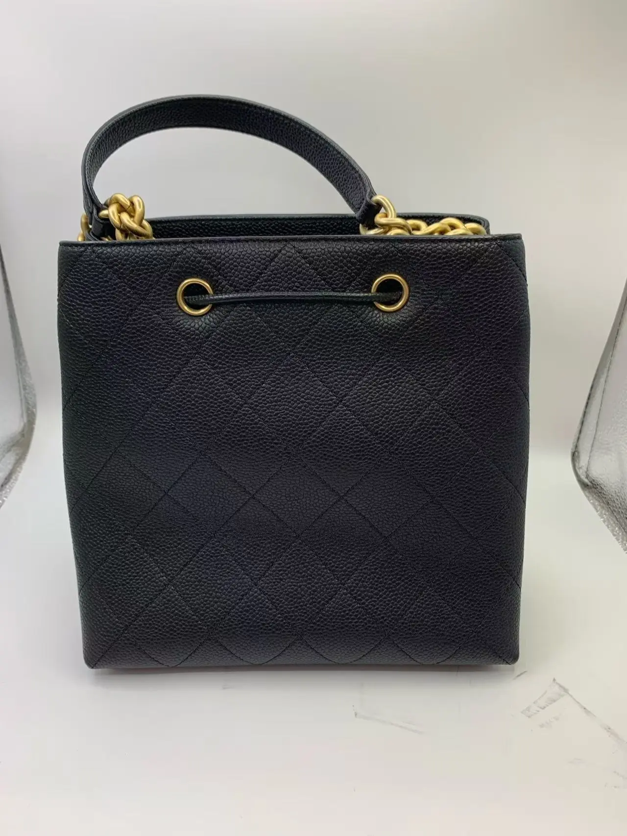 Pre-owned CHANEL Black Caviar Calfskin “Greek Series” Bucket Bag, Gold Hardware,27 series(2018 2019), Dimensions: 20 × 19 cm