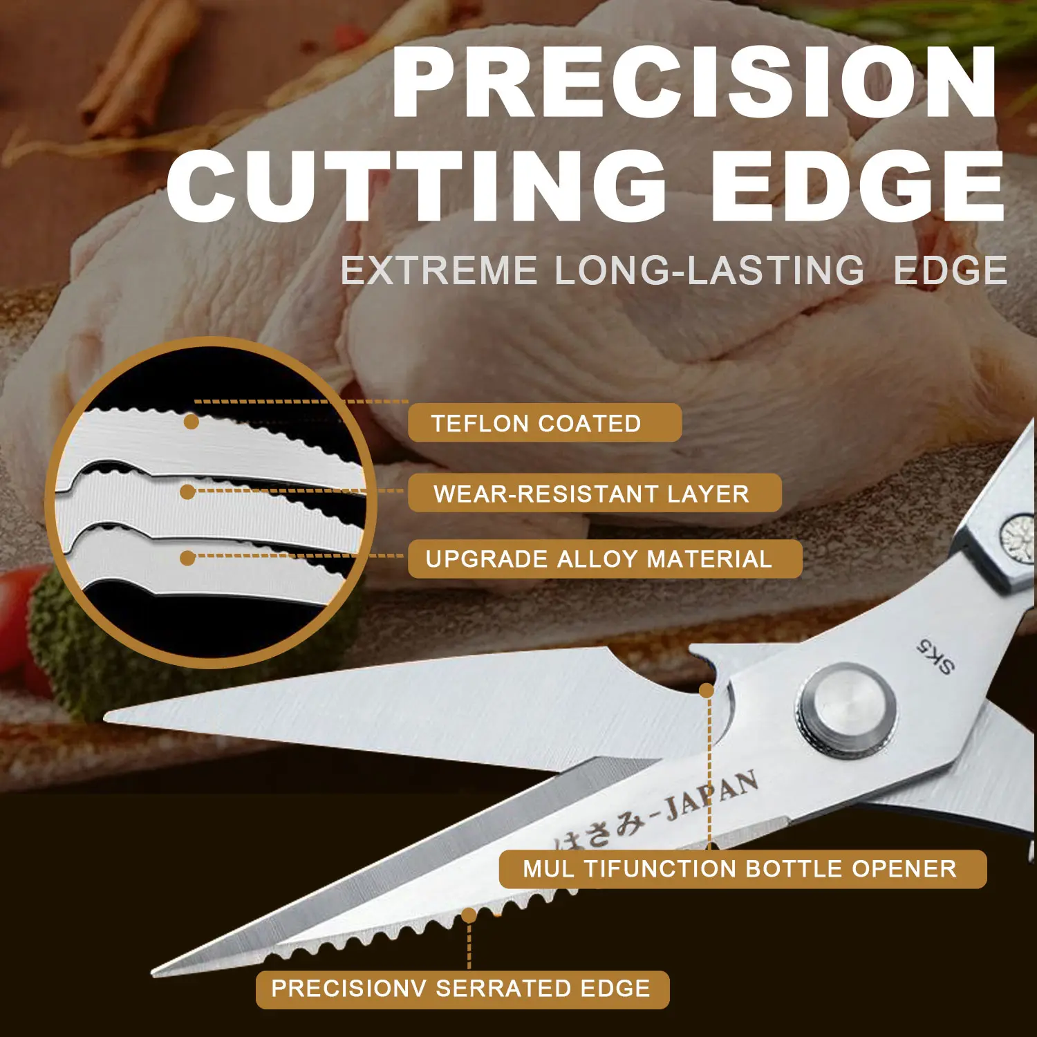 Premium 2.0mm stainless steel blades deliver long-lasting sharpness for everyday kitchen tasks. These heavy duty kitchen scissors easily cut poultry joints, fresh herbs, vegetables, and packaging. Mirror-polished finish adds a sleek, professional look to any modern kitchen.