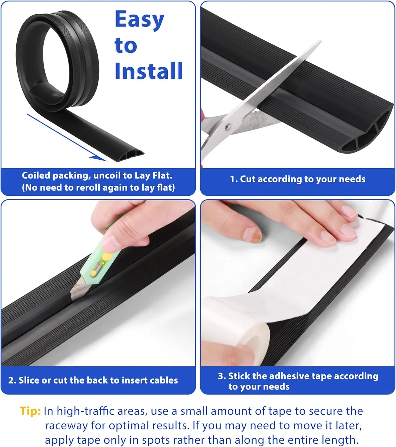 ·Easy to Use: You can easily cut it to your desired length with scissors, slice open the back to insert the cables. The floor cord protector is designed with a non-slip base, no need to apply adhesive tape to secure it to the floor. You can also use adhesive tape for complete fixation, each ZhiYo floor cord management kit comes with a roll of strong adhesive tape, suitable for any home or workspace