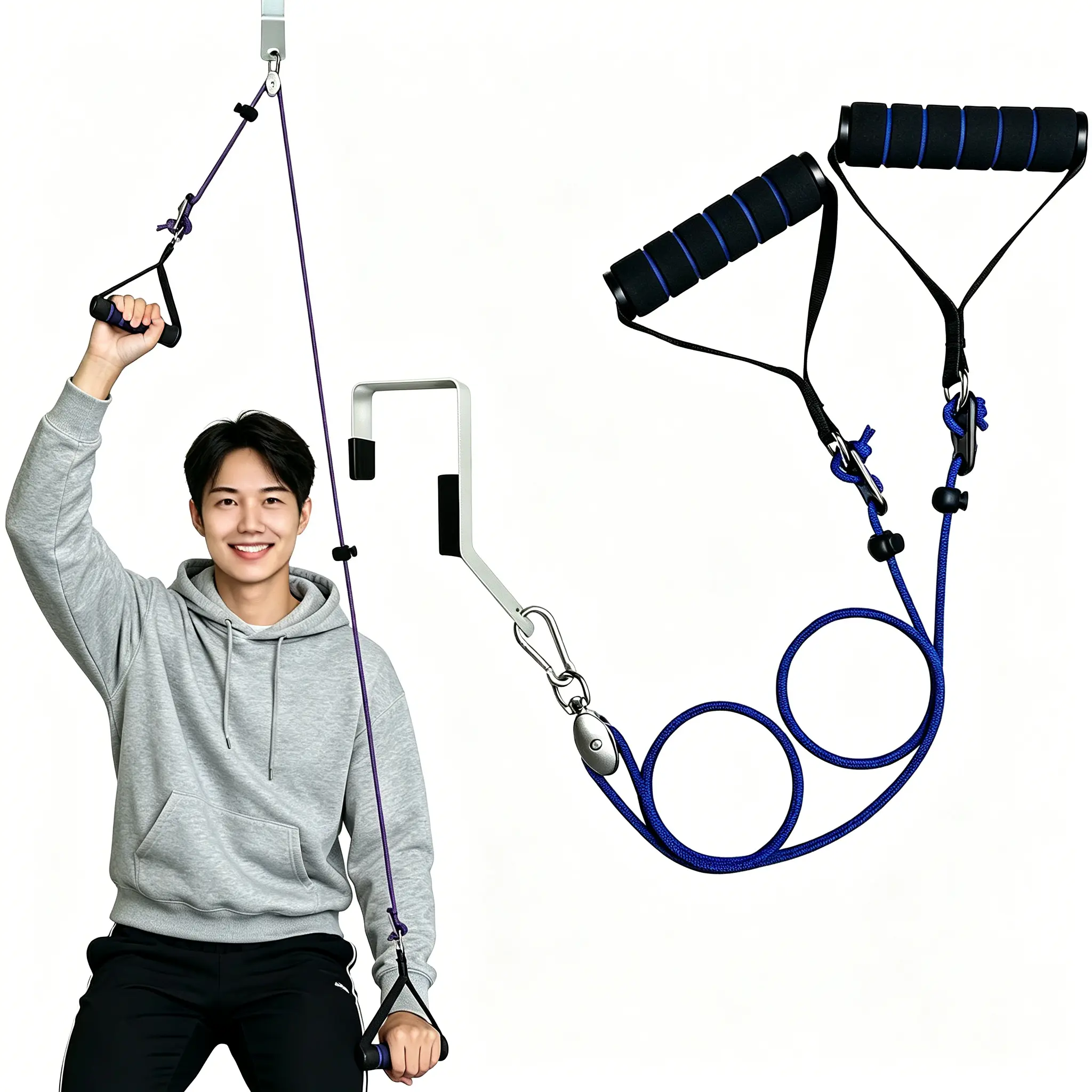 ADJUSTABLE ROPE LENGTH – This shoulder pulley is designed for practical use. The rope length can be conveniently adjusted using the three-hole button mechanism.