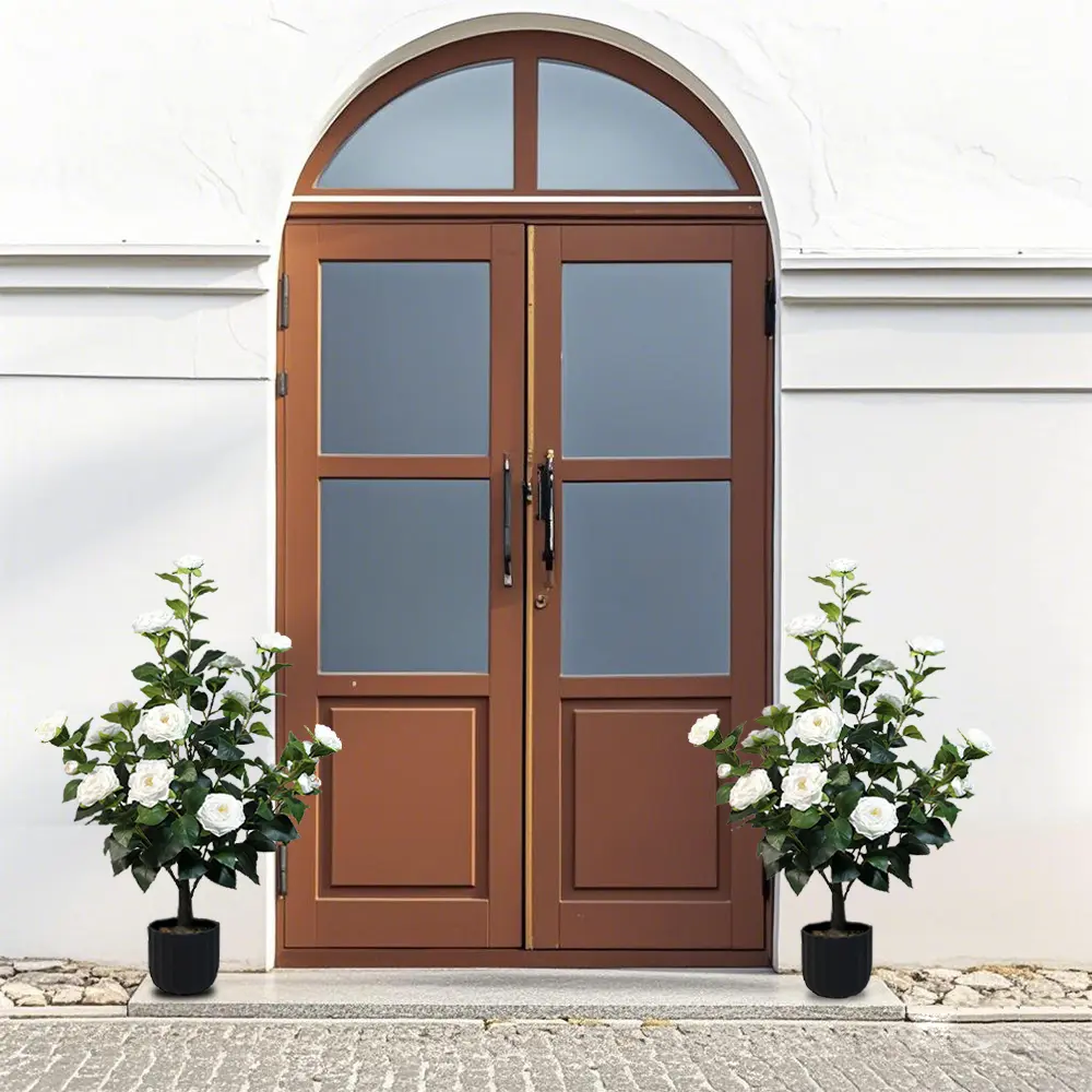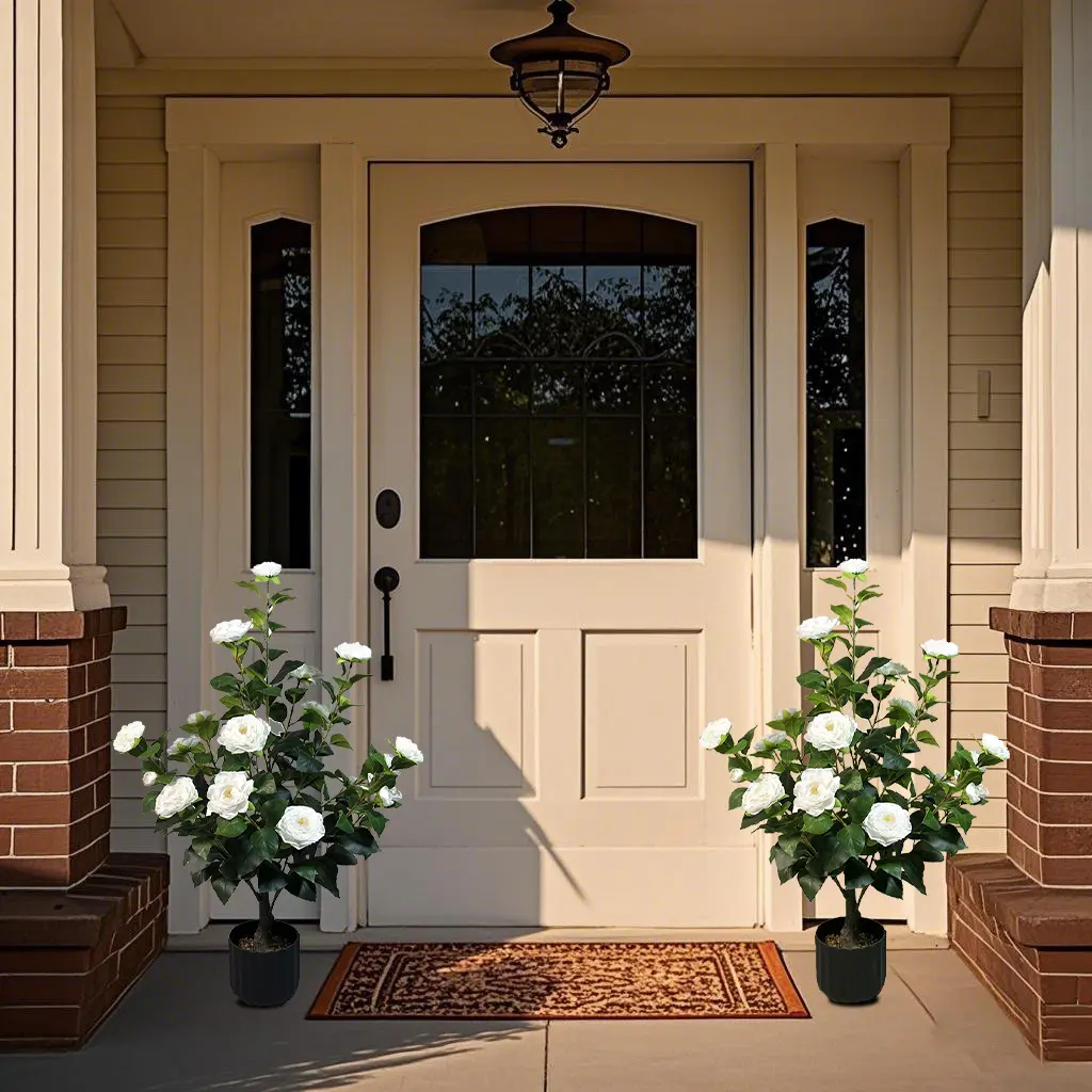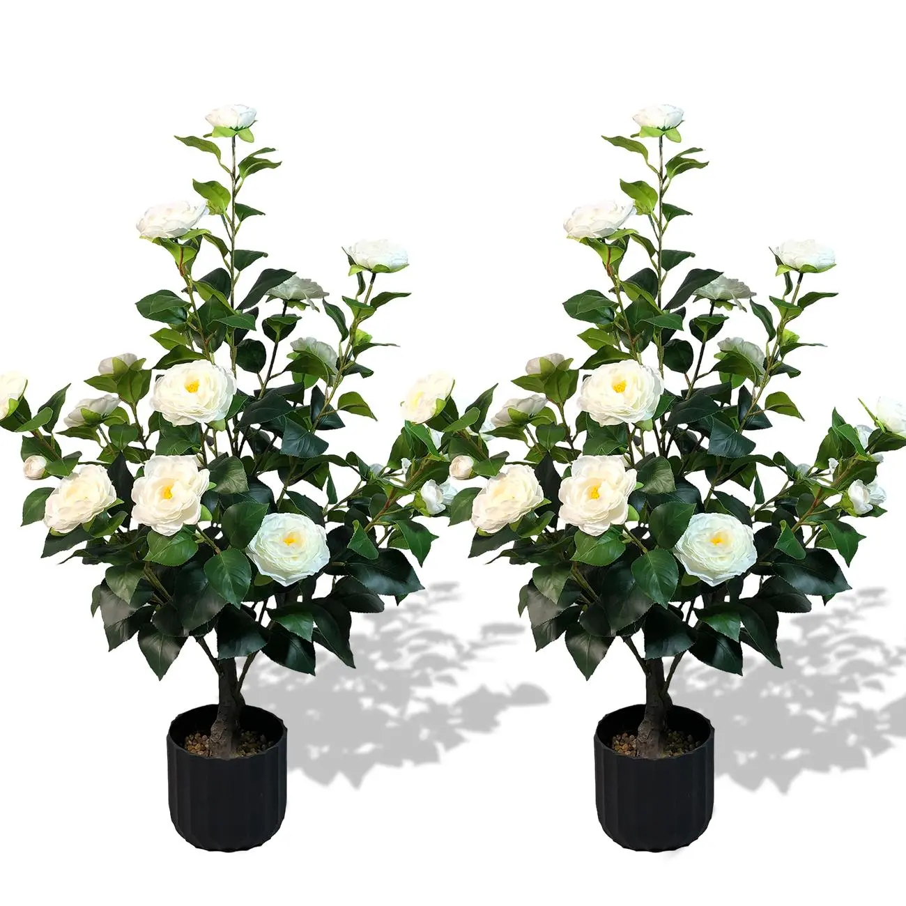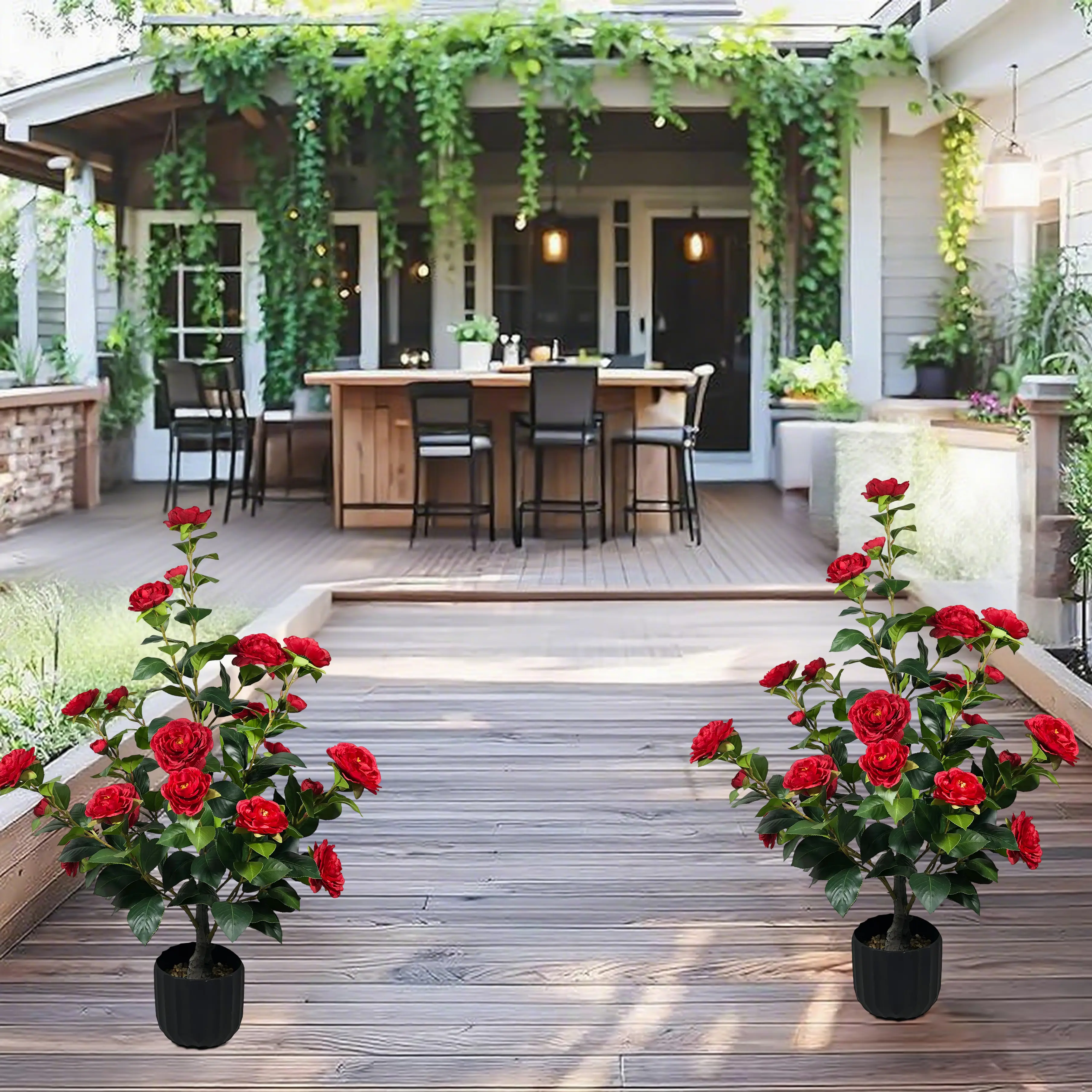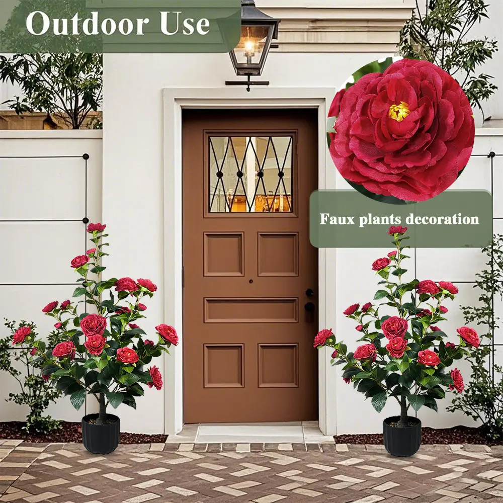 2 Pcs 3ft Artificial Camellia Trees bring a touch of nature indoors and out. This set includes 24 realistic flowers, 188 leaves, decorative pebbles, and a planter, perfect for elevating the aesthetic of your home, office, or courtyard.