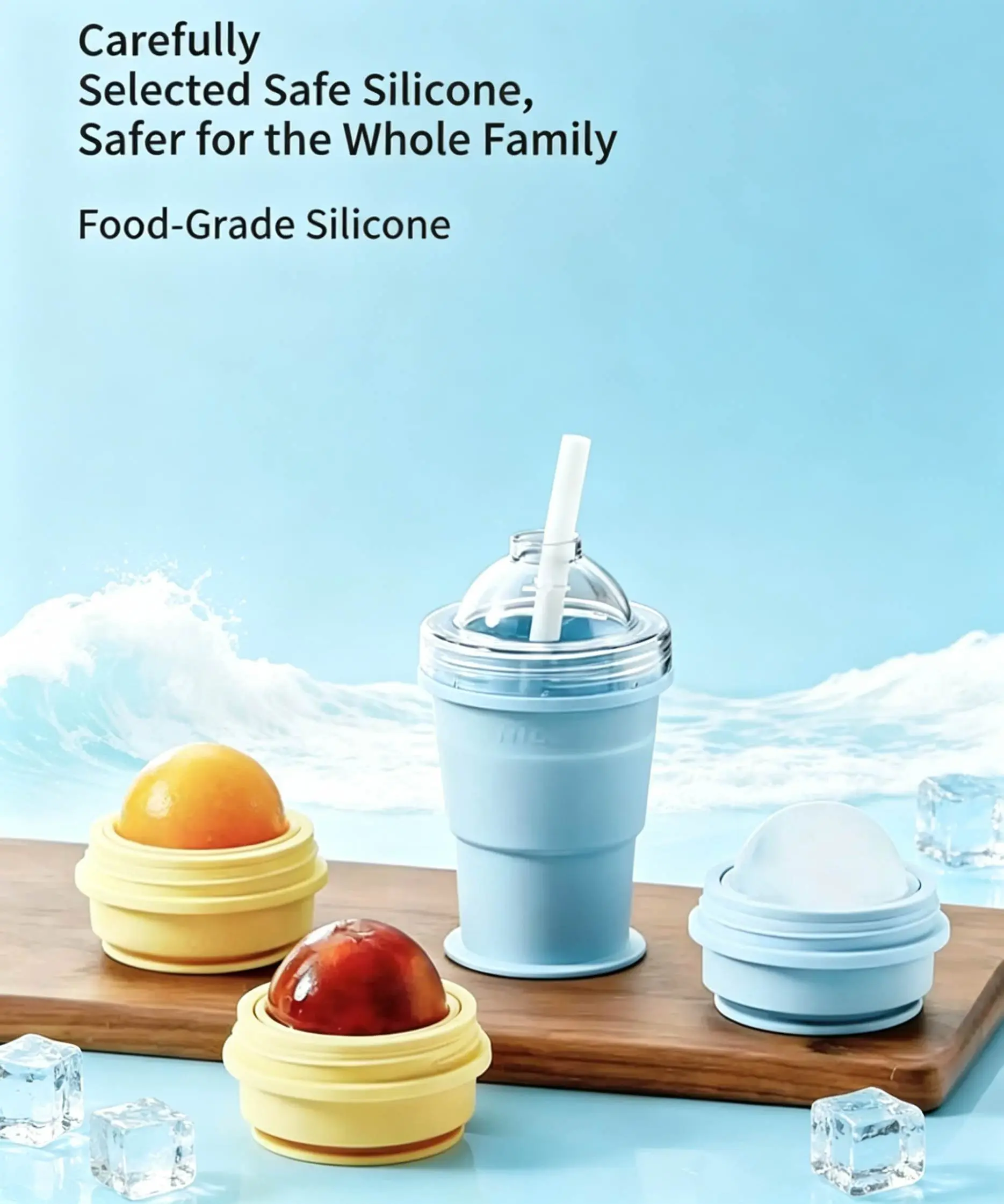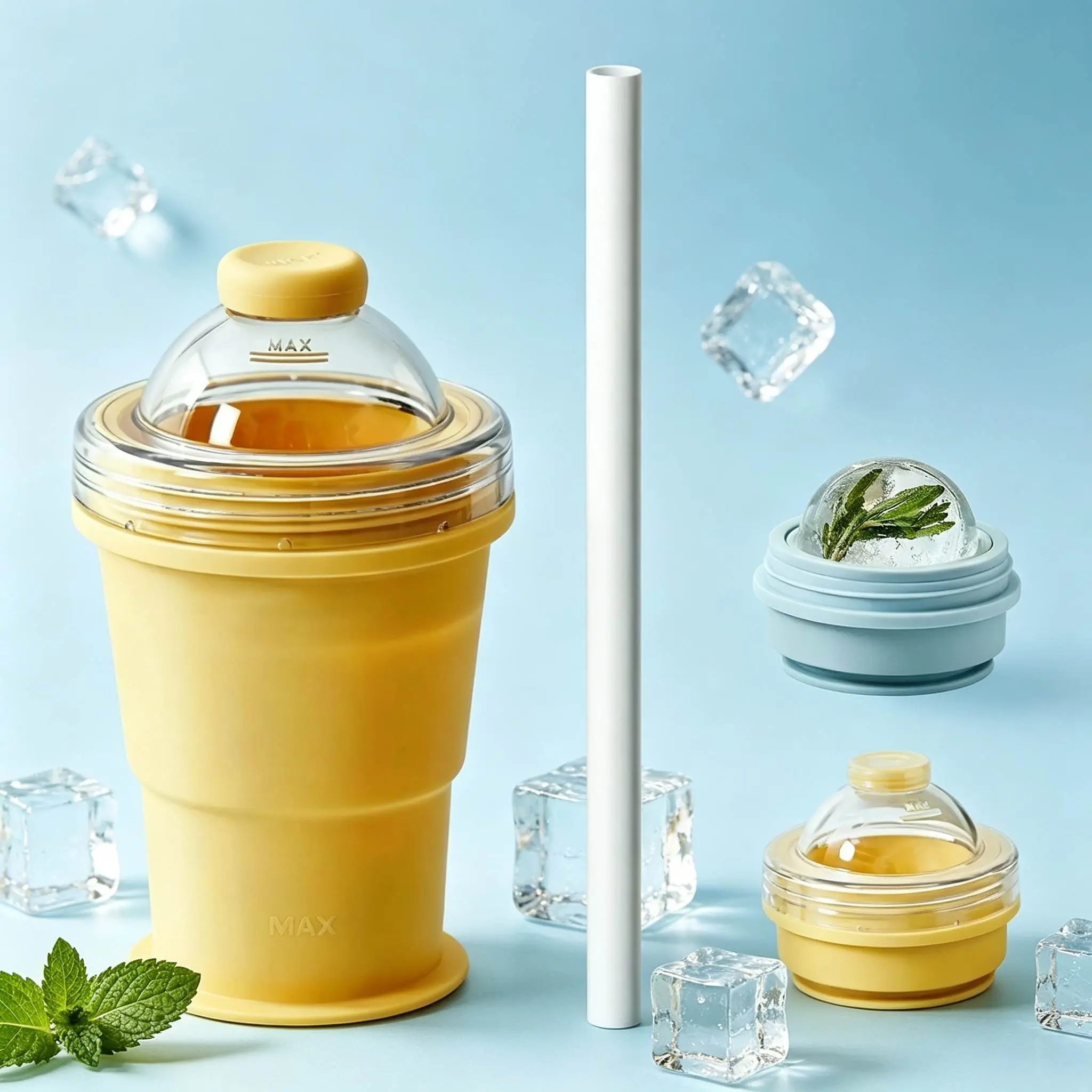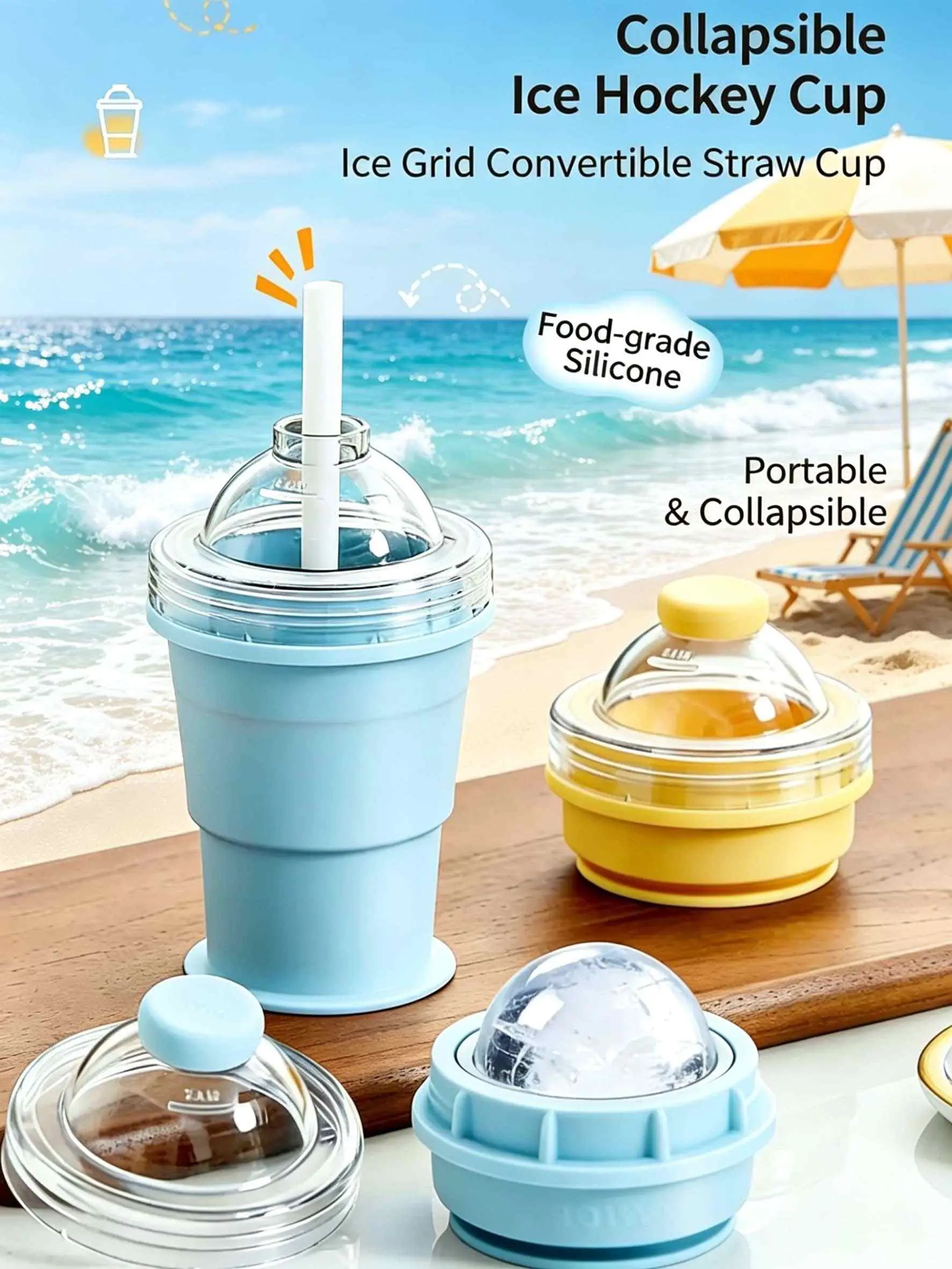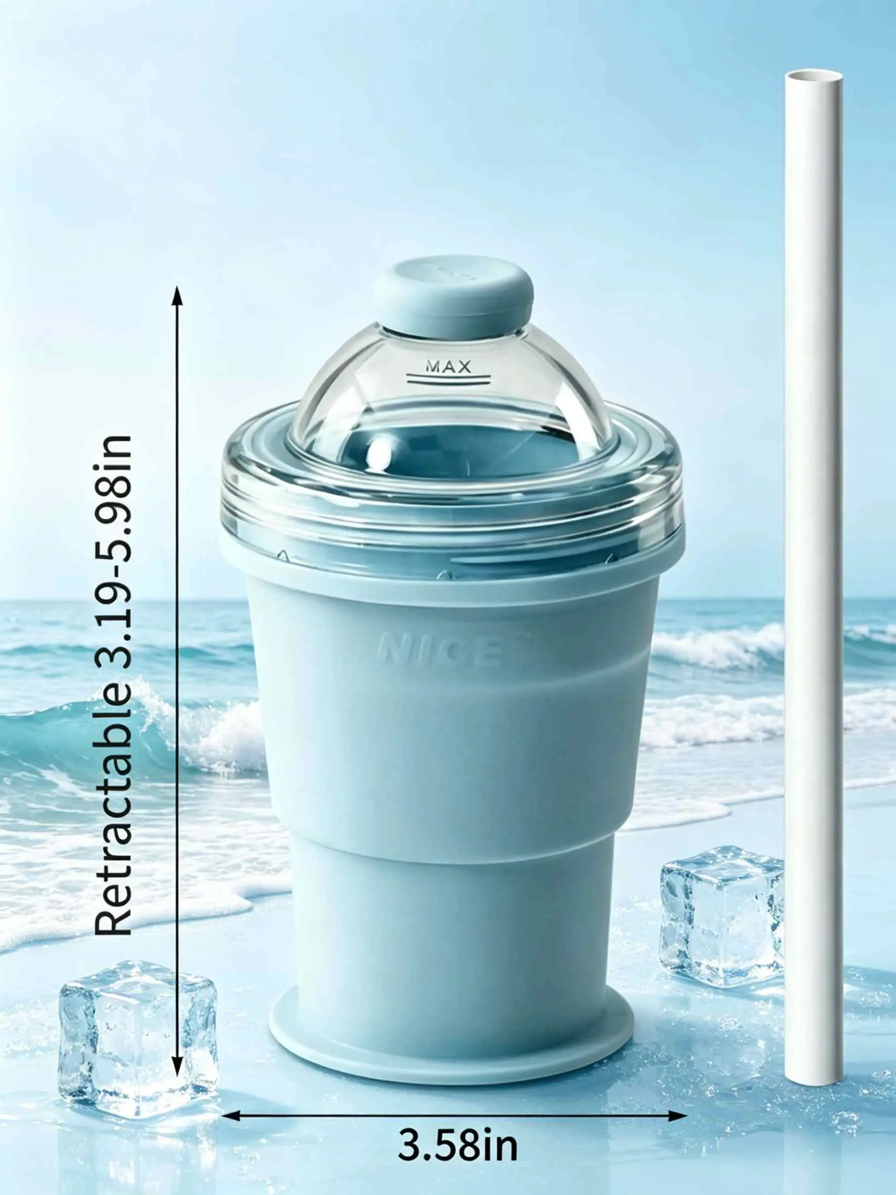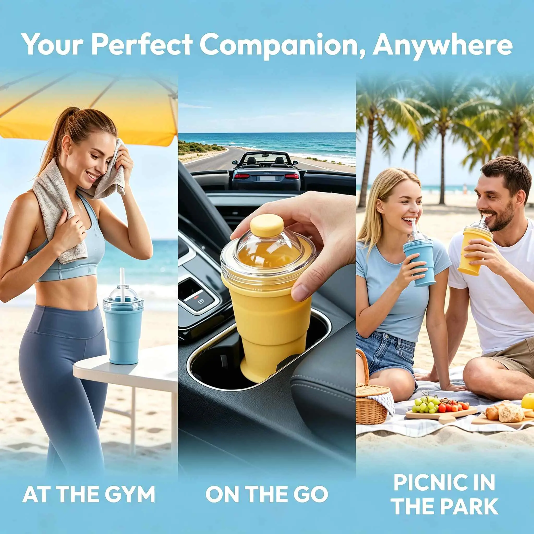 Portable foldable silicone cup with built-in straw, reusable and lightweight. Heat-resistant, easy to clean and store, great for travel, hiking, camping, office and daily outdoor use.