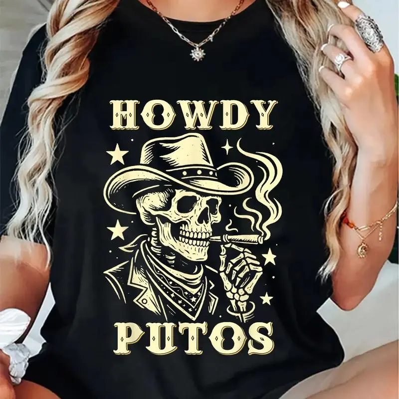 100% Cotton Howdy Putos Funny Western Cowboy Skull Spanish Slang T-Shirt