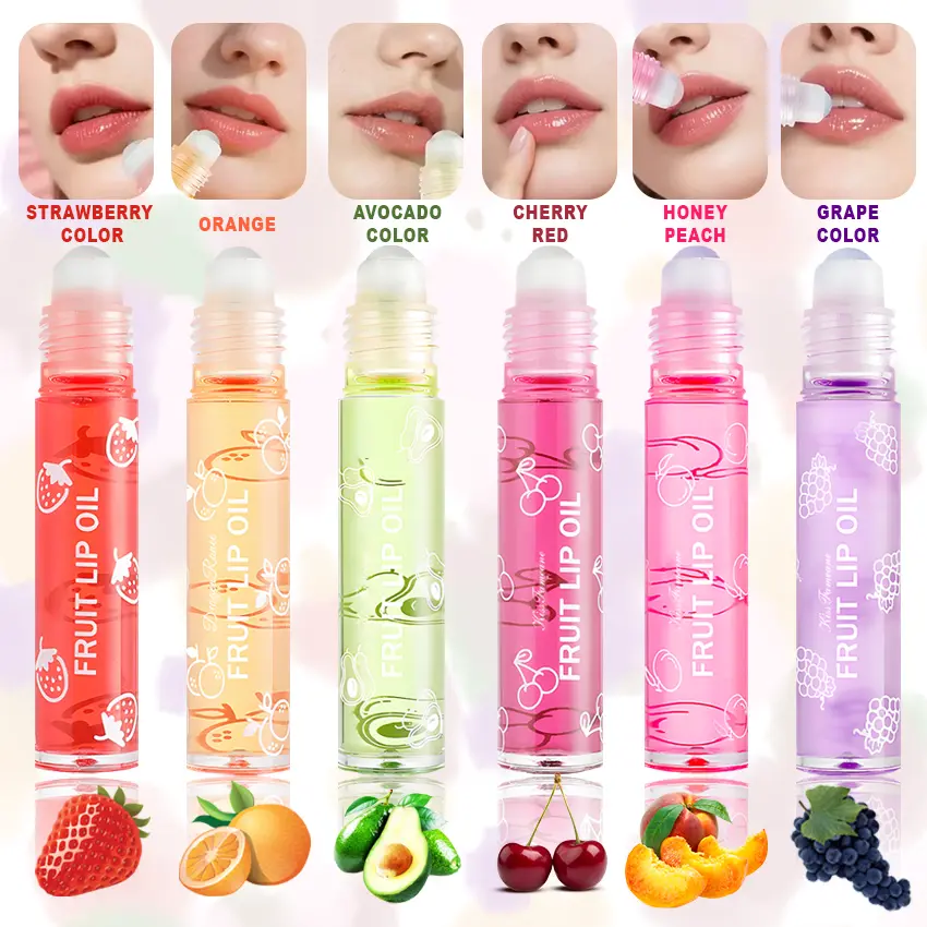 Hydrating Lip Oil Roller Gloss Juicy Glass Lips Non Sticky Moisturizing Lip Care Fruit Flavor Lip Gloss for Dry Lips Long Lasting Shine Strawberry Peach Grape Cherry