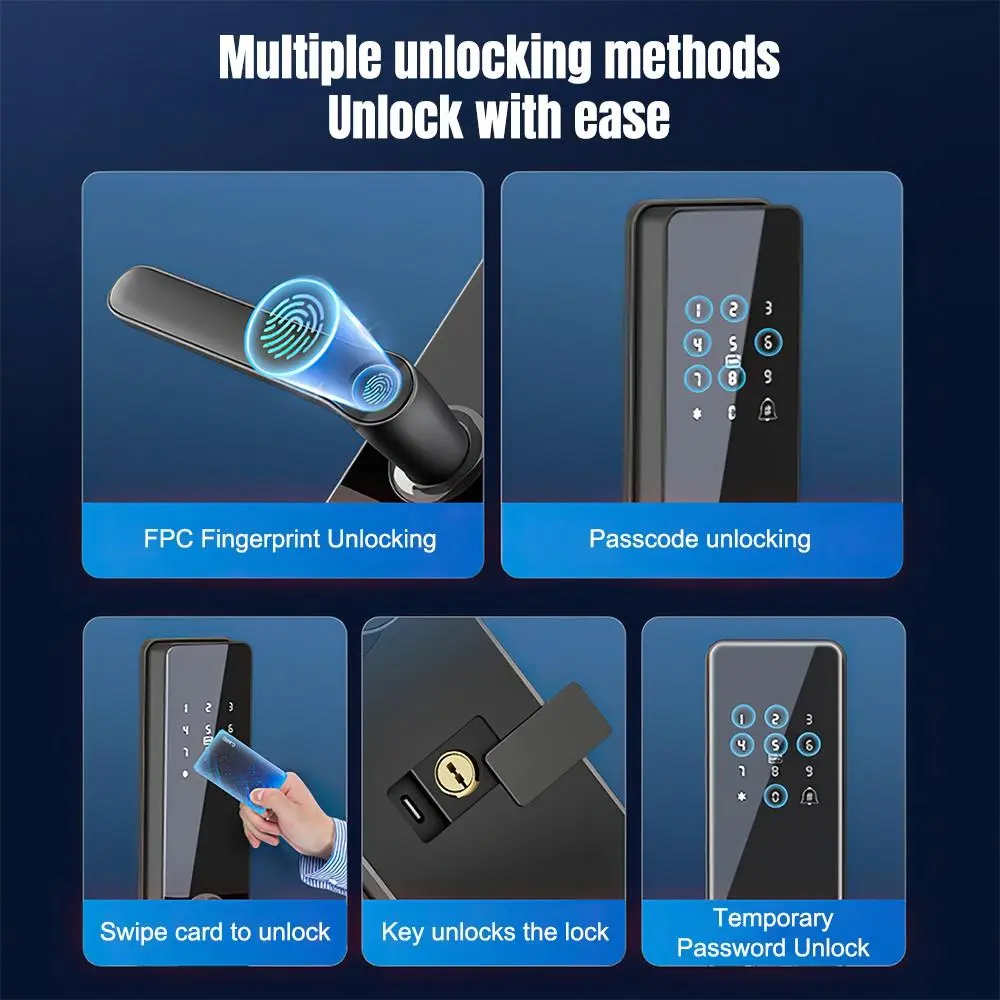 1. Multiple unlocking methods: This 7-in-1 smart door lock can be unlocked by TTLOCK WIFI remote control, fingerprint, anti-peep digital password, IC card, TTLOCK application, temporary password, and mechanical key. Front door lock with short response time, security and convenience are essential for a smart home.