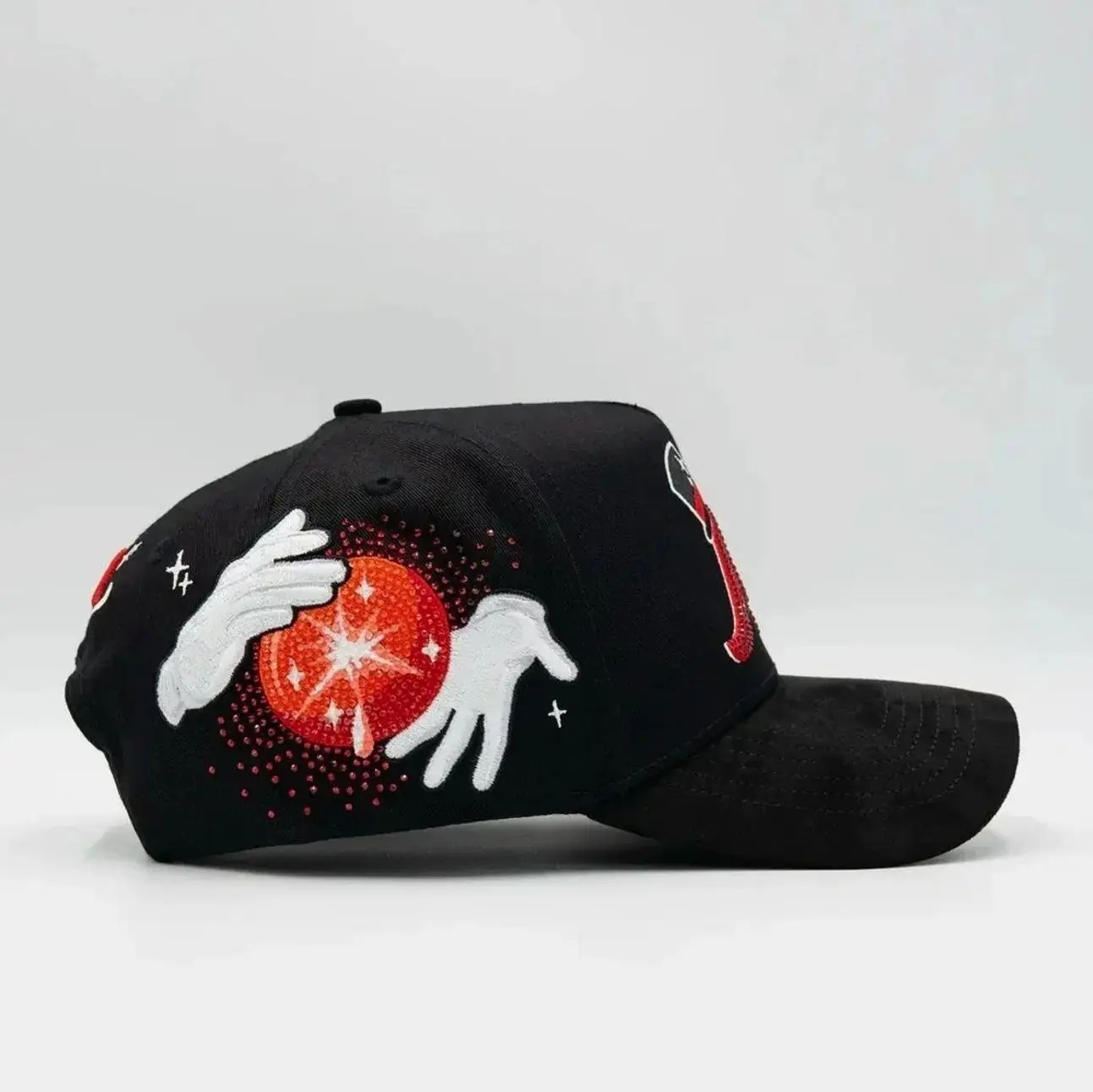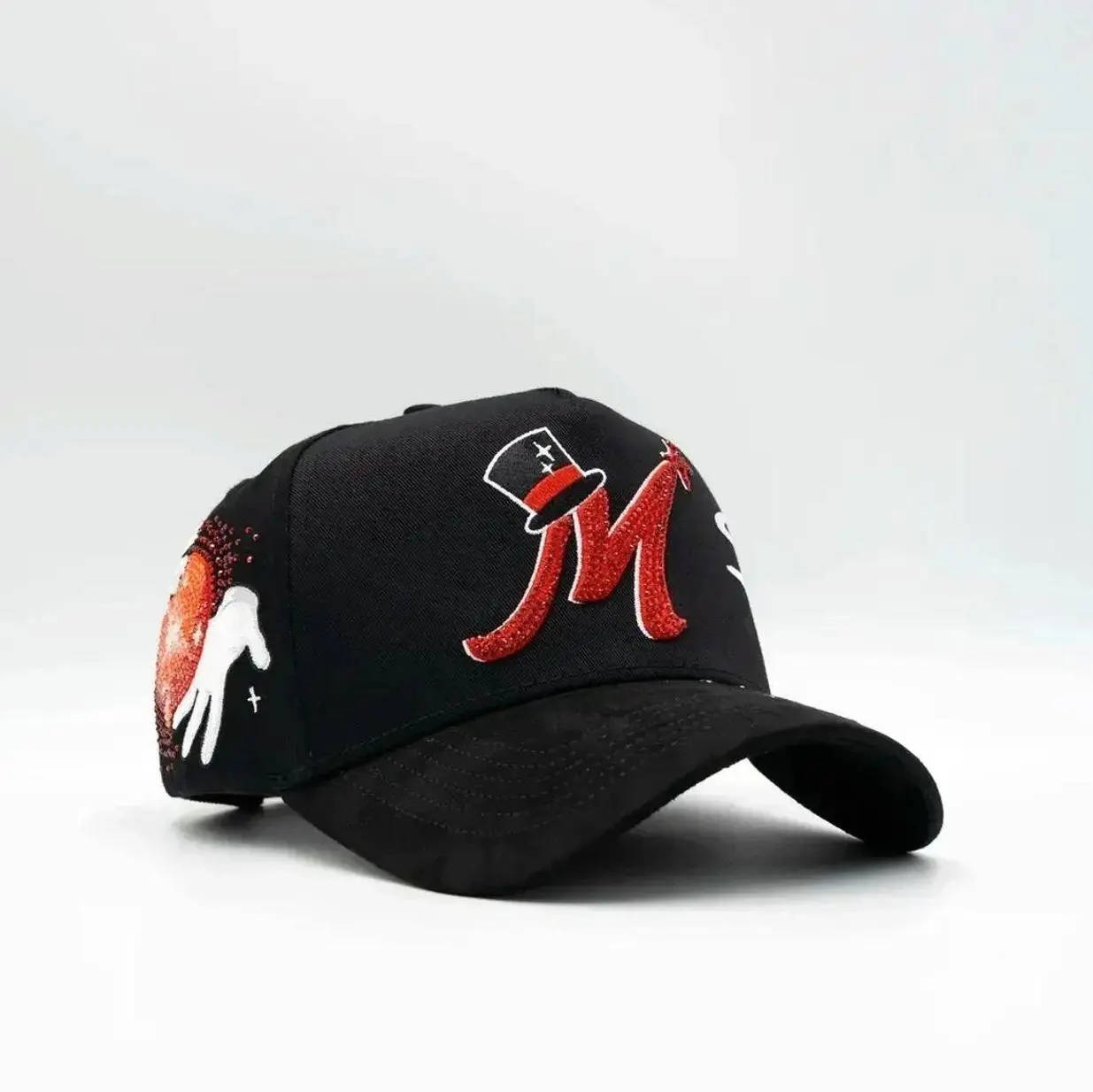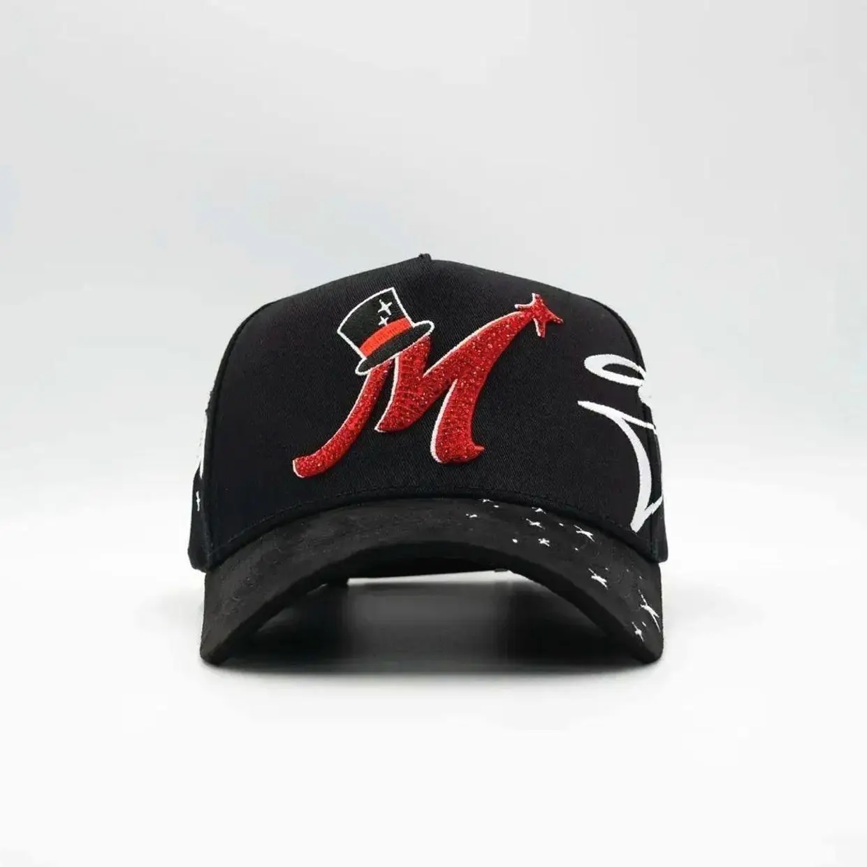This limited-edition cap showcases premium embroidery, a signature “M” logo with a magician’s hat, and glowing red details that give off a one-of-a-kind mystic vibe.