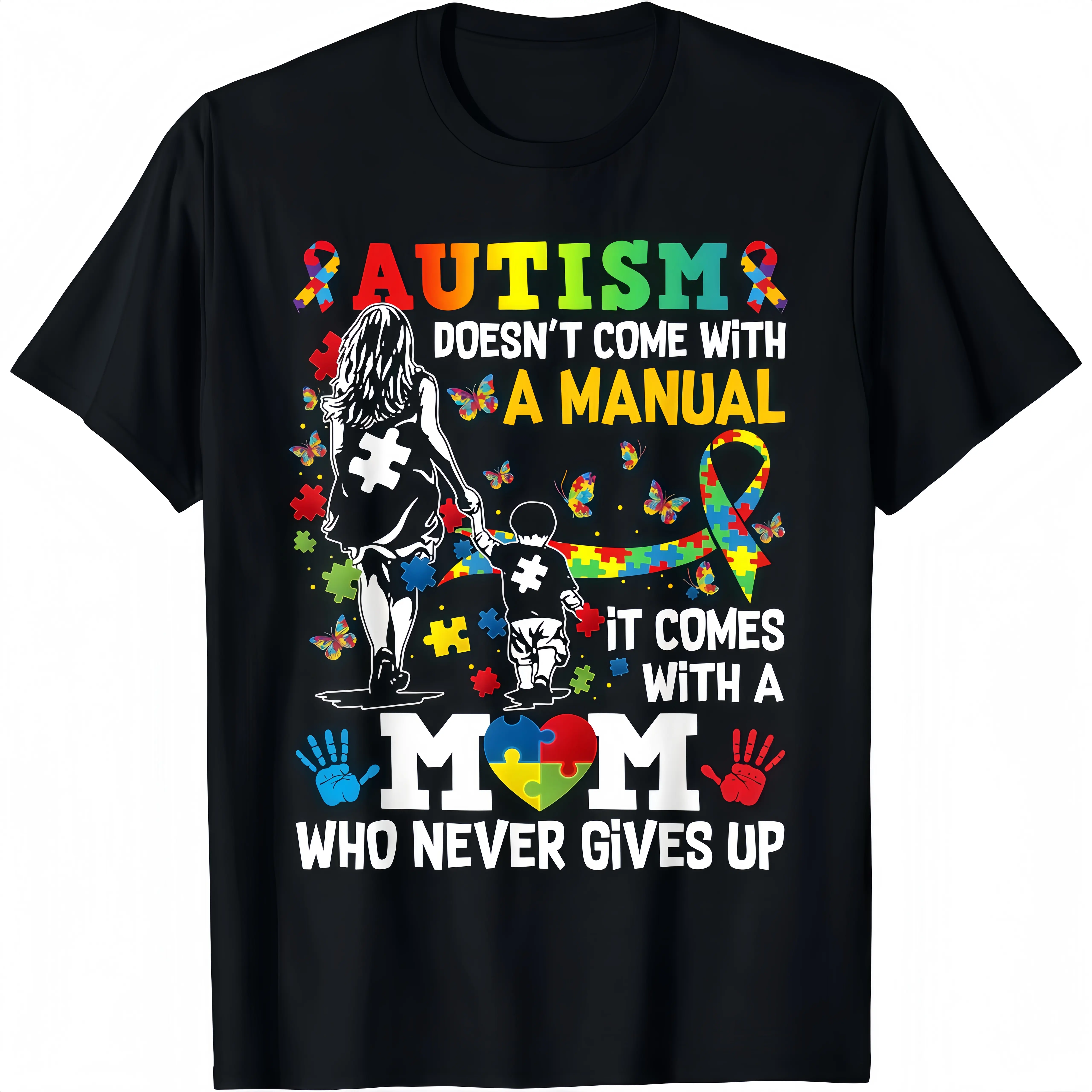This T-shirt is a statement piece for autism awareness. It features the phrase "Autism Mom Doesn't Come With A Manual," highlighting the unique journey of autism mothers. Perfect for women who want to show support and awareness. The design is simple yet impactful, making it a versatile addition to any wardrobe.
