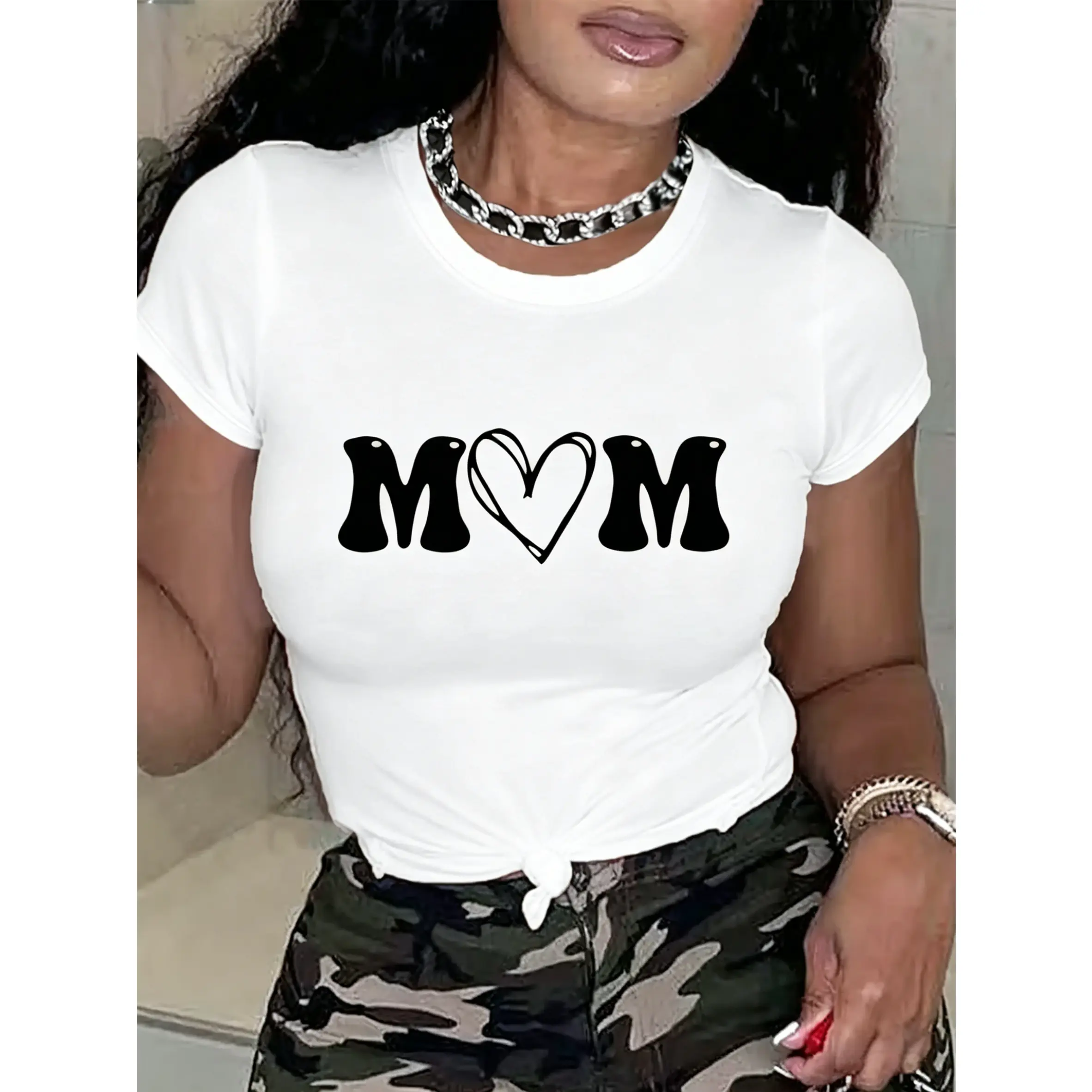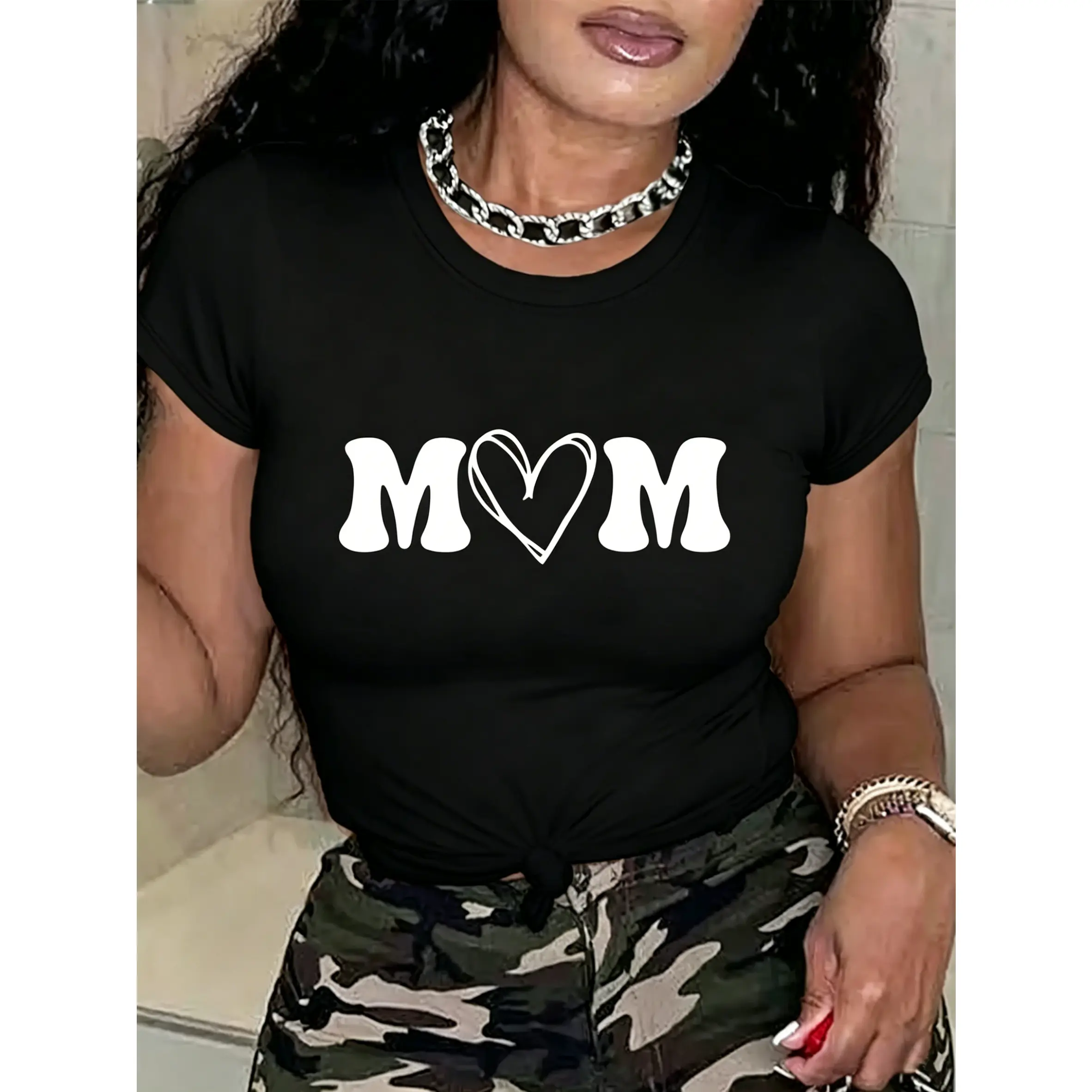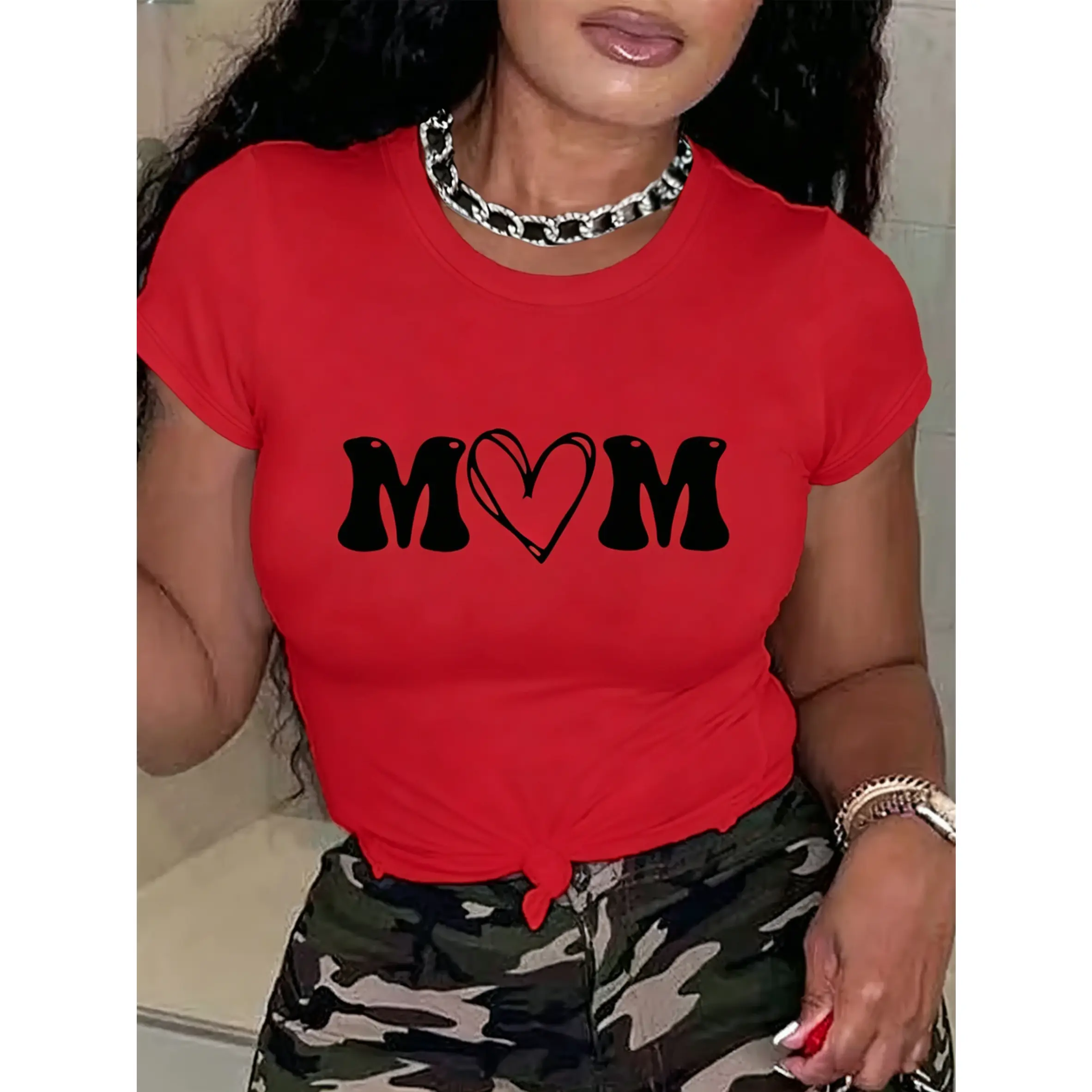 100% cotton women's short-sleeve top with "MOM" letter print and heart design, round neck, machine washable, comfortable, soft, breathable, loose fit, casual, stylish, suitable for daily wear and versatile