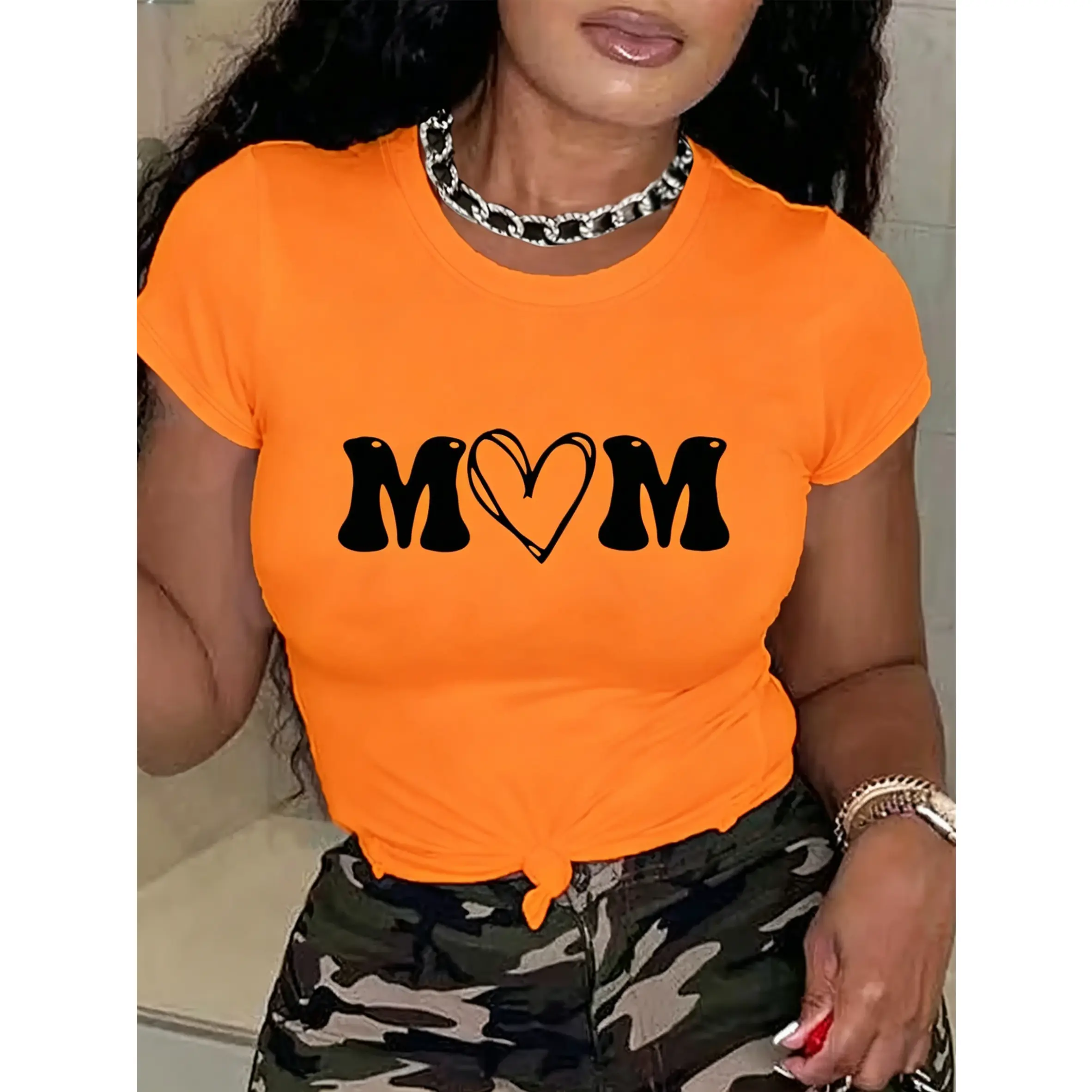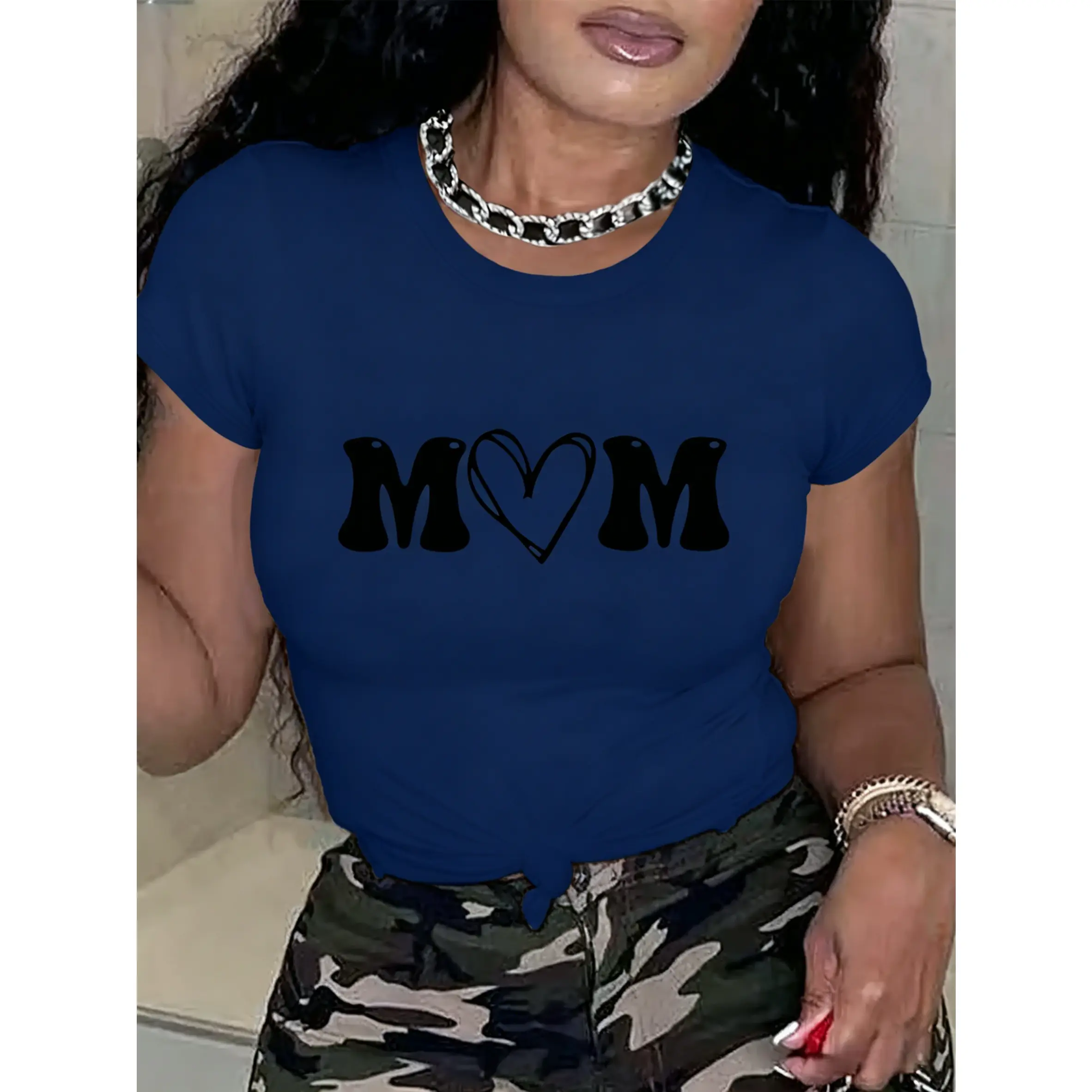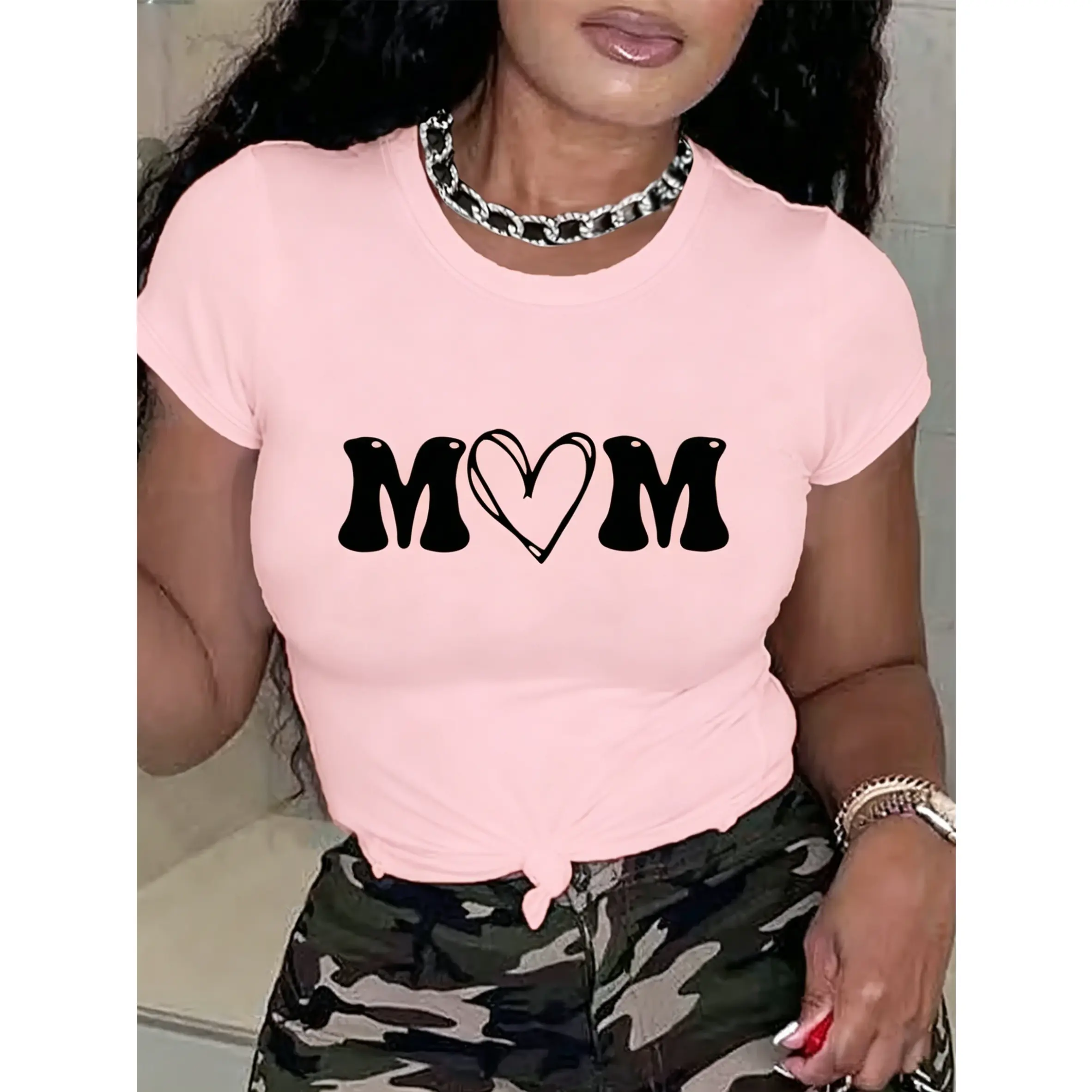 100% cotton women's short-sleeve top with "MOM" letter print and heart design, round neck, machine washable, comfortable, soft, breathable, loose fit, casual, stylish, suitable for daily wear and versatile
