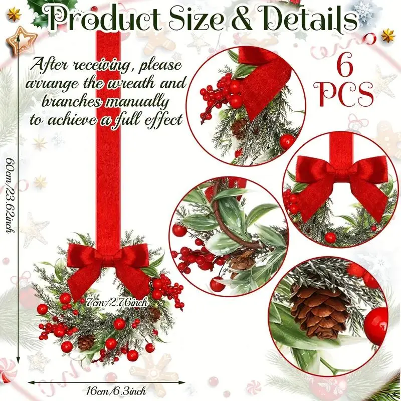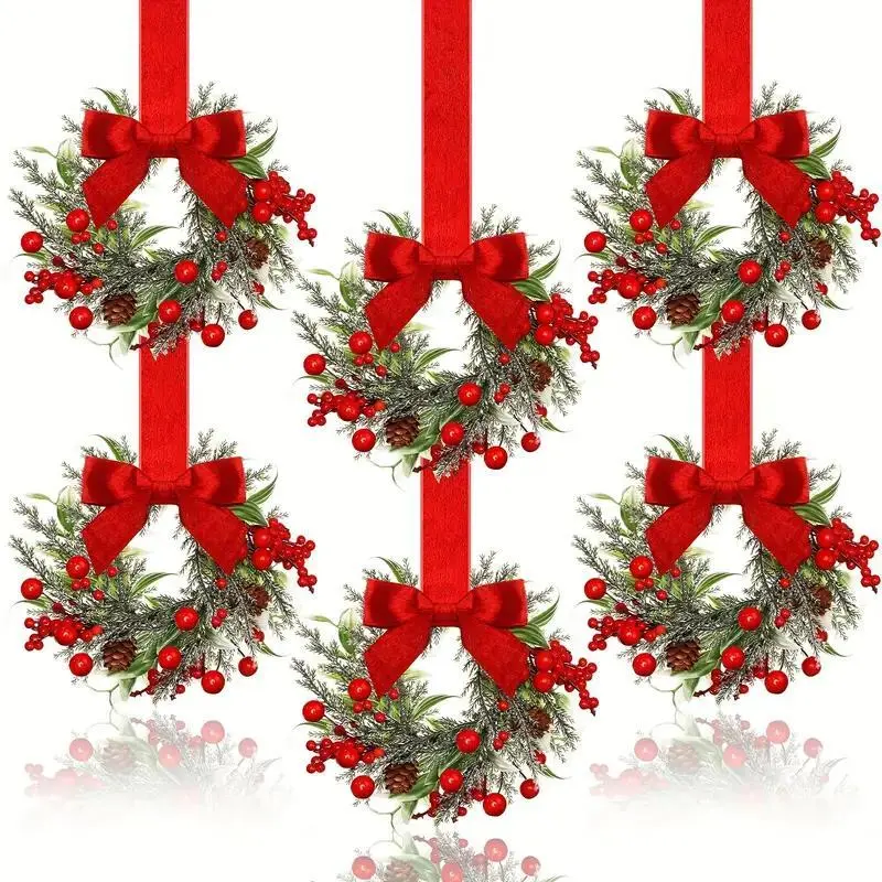 6-Pack Christmas Mini Window Wreaths with Ribbon Bows & Red Berries - Small Cabinet Hangers, Farmhouse Style Kitchen Door Decor for Christmas Party Arrangements
