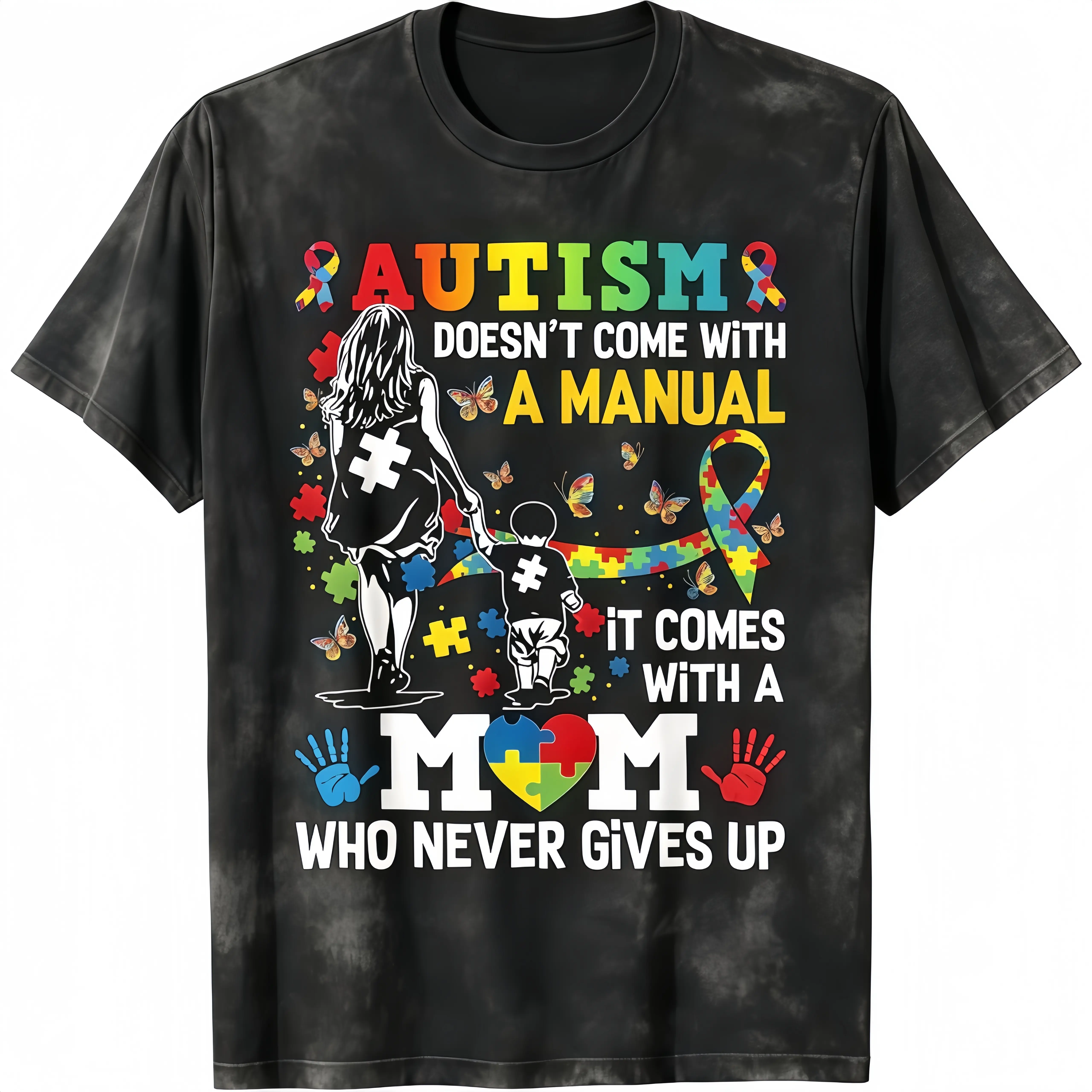 This T-shirt is a statement piece for autism awareness. It features the phrase "Autism Mom Doesn't Come With A Manual," highlighting the unique journey of autism mothers. Perfect for raising awareness, it's a versatile addition to any wardrobe.