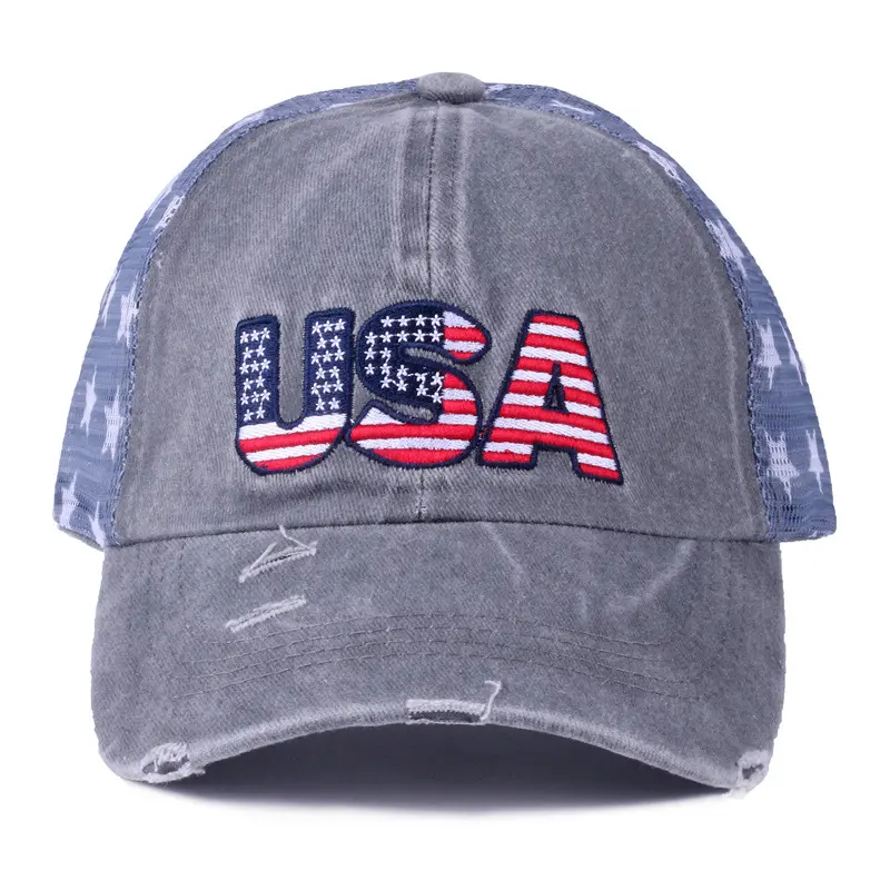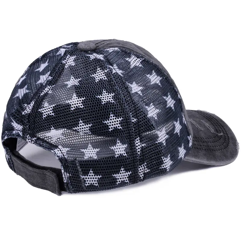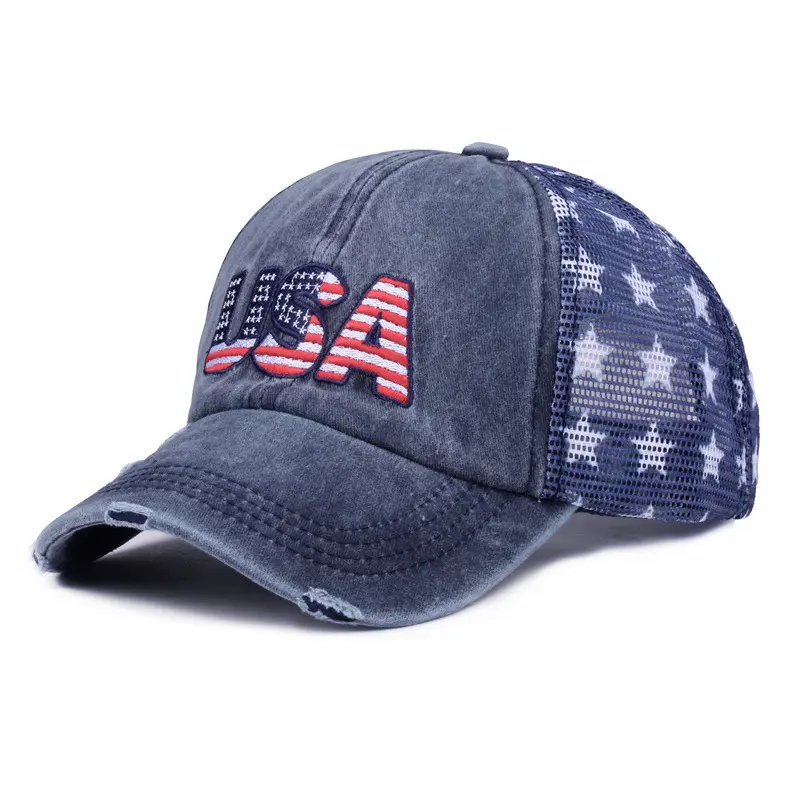 Washed cotton vintage baseball cap with embroidery, American flag embroidered cap, mesh cap, five-pointed star mesh cap