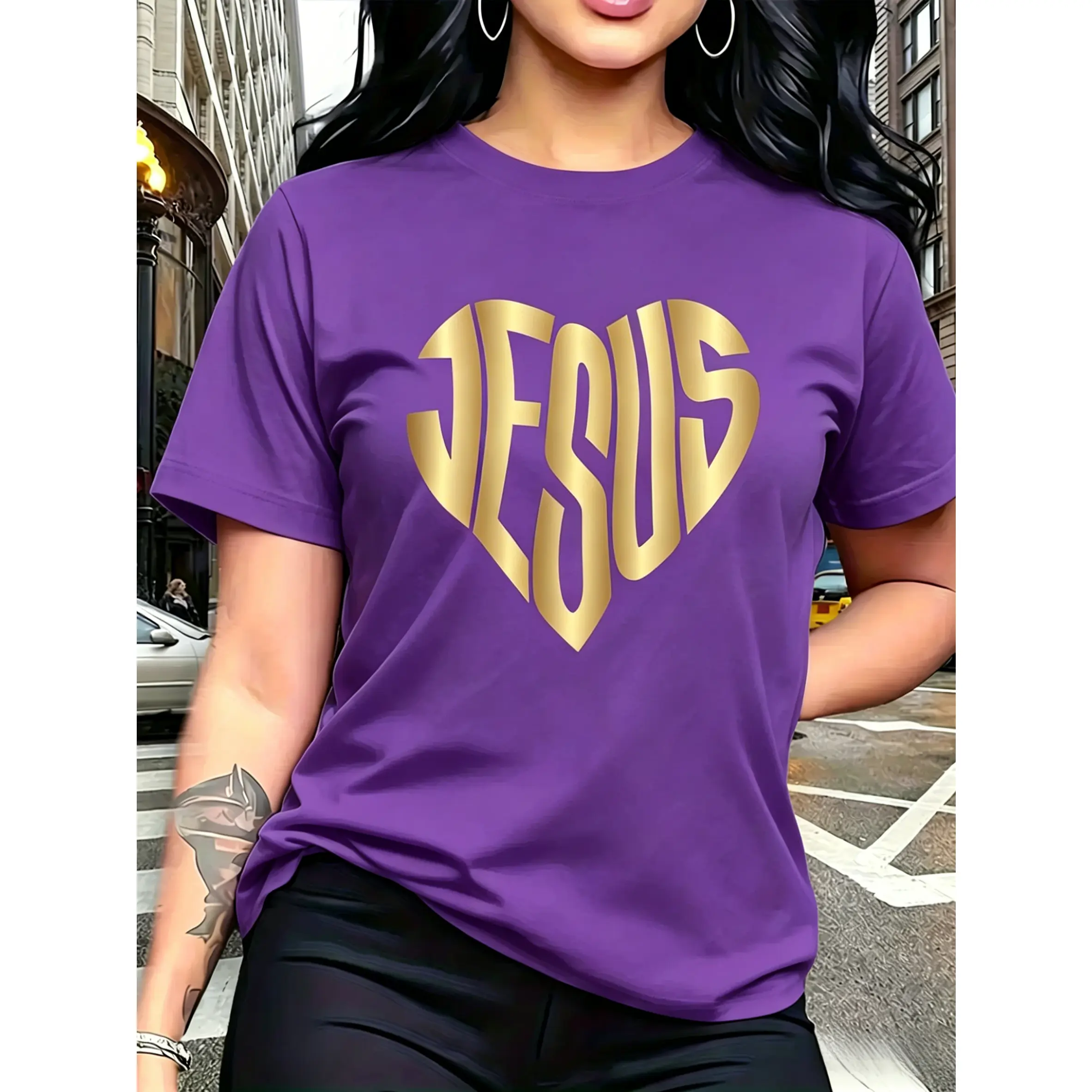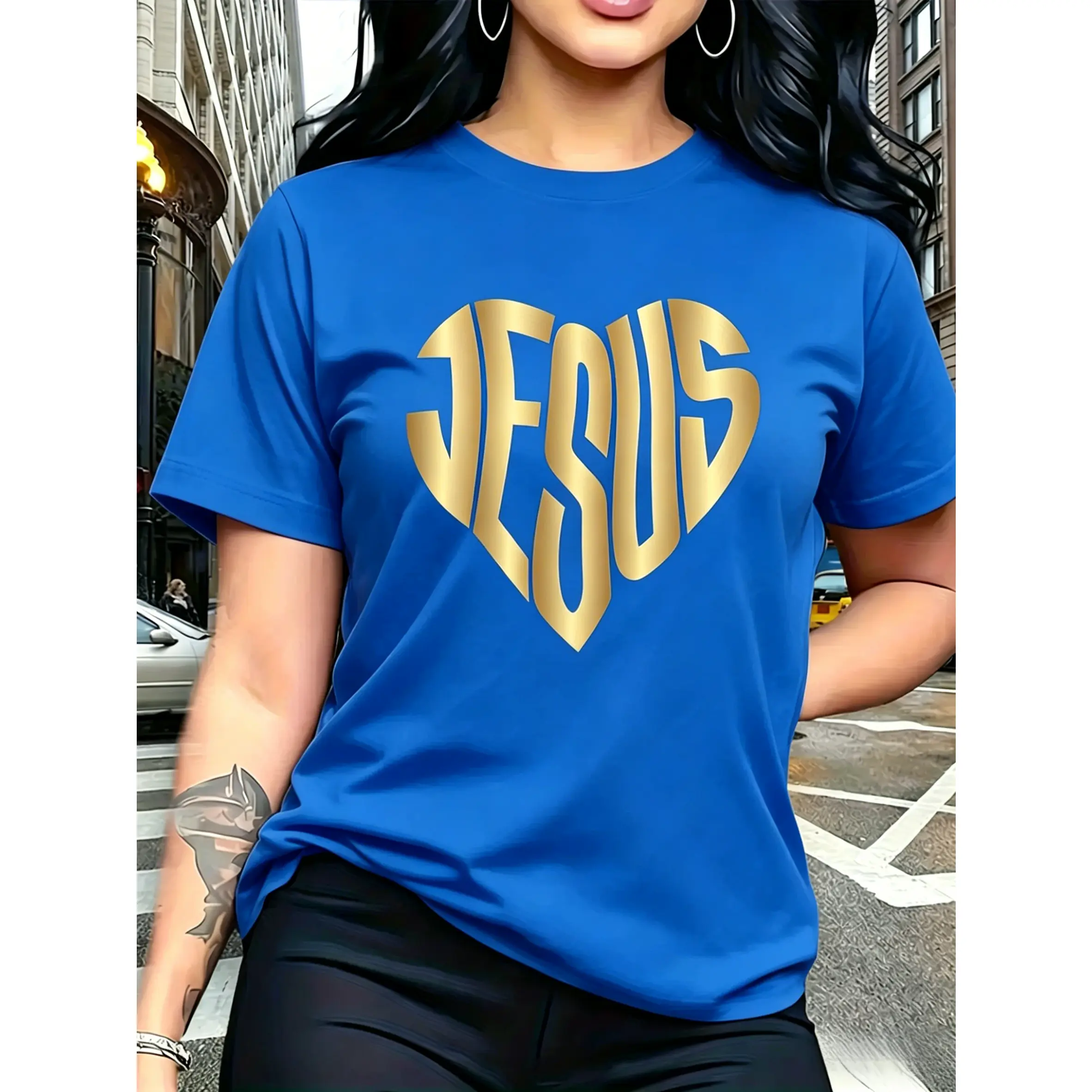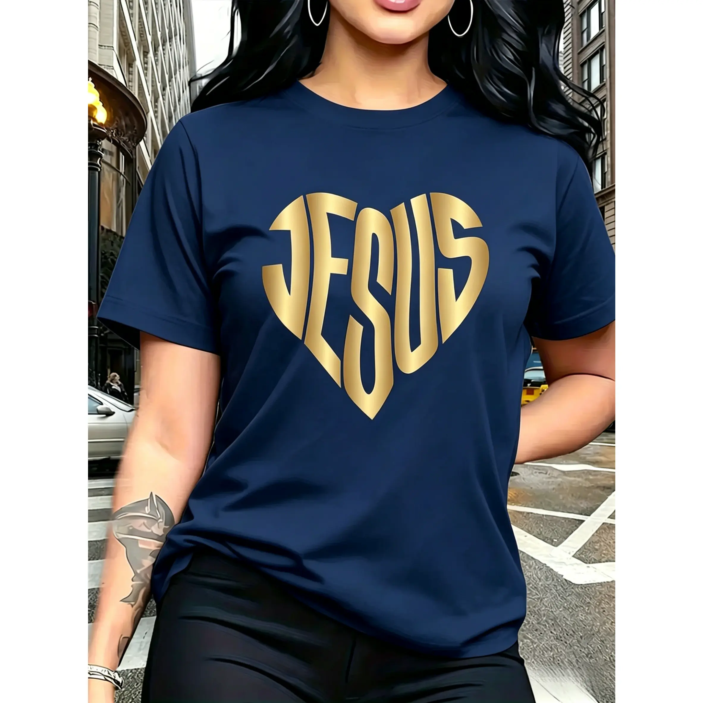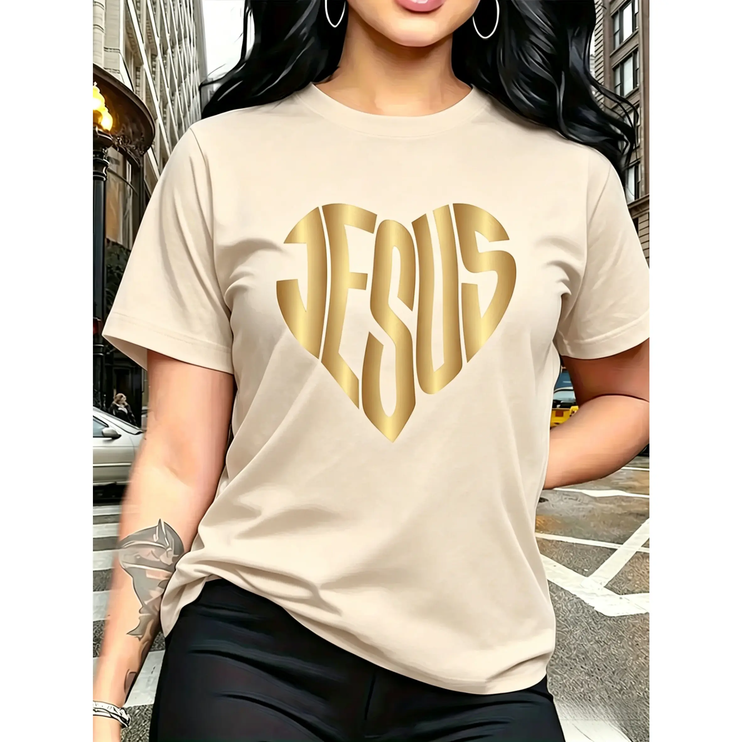 100% cotton, with a gold JESUS heart-shaped pattern print, trendy and fashionable, simple round neck, casual and versatile short-sleeve women's T-shirt suitable for leisure, travel, vacation, and other activities