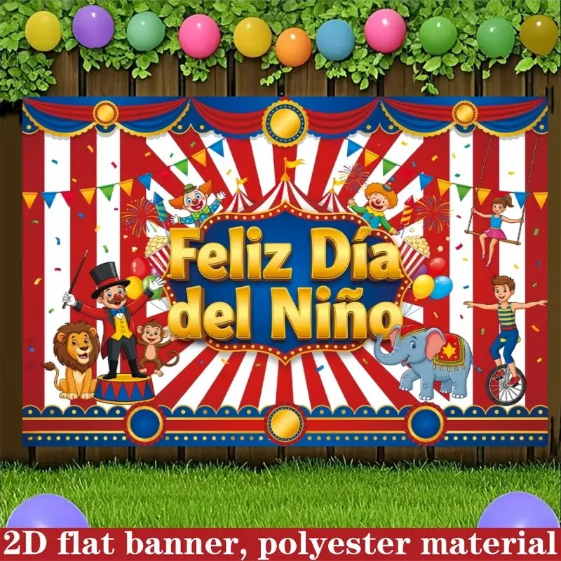 2D Flat Banner, Spanish 'feliz Día Del Niño,' Polyester, Circus Theme, Home Wall Outdoor Garden Party Decor, Large Garage Party Banner