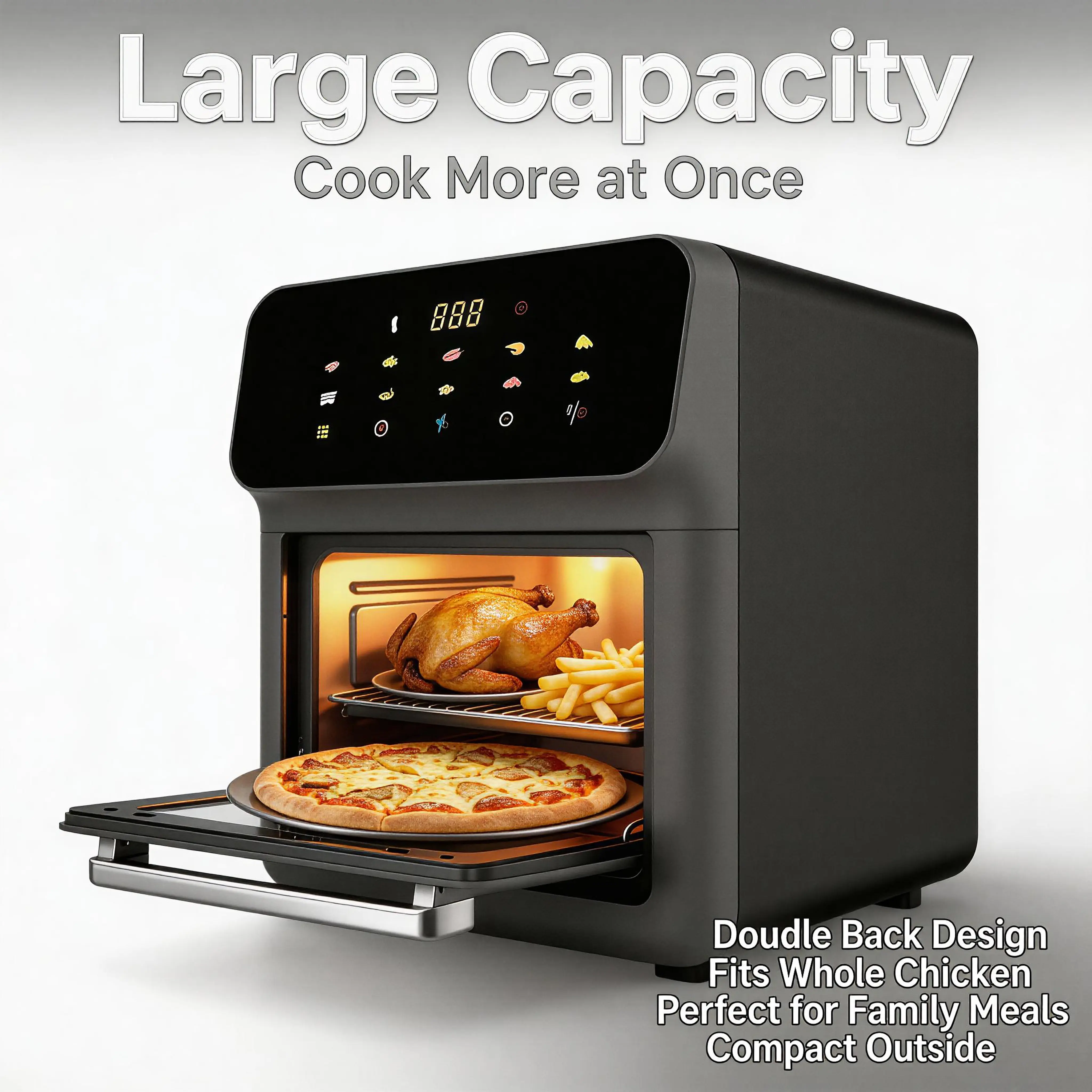 Upgrade your kitchen with our 13L large-capacity air fryer oven, the ultimate all-in-one cooking solution designed to simplify mealtime for busy households. Equipped with a responsive touchscreen and over a dozen one-touch preset menus, this air fryer takes the guesswork out of cooking, letting you prepare restaurant-quality meals with just a single tap. Featuring precise multi-level temperature control, it delivers crispy, golden results without the excess oil, fat, and calories of traditional deep frying, making it the perfect choice for health-conscious families. With a spacious 13L interior, it easily handles family-sized portions, while its non-stick, detachable design ensures effortless cleaning after every use. Whether you’re a busy professional rushing to make dinner, a mom juggling household tasks, or a home cook looking to streamline your kitchen, this air fryer is your new go-to kitchen essential.