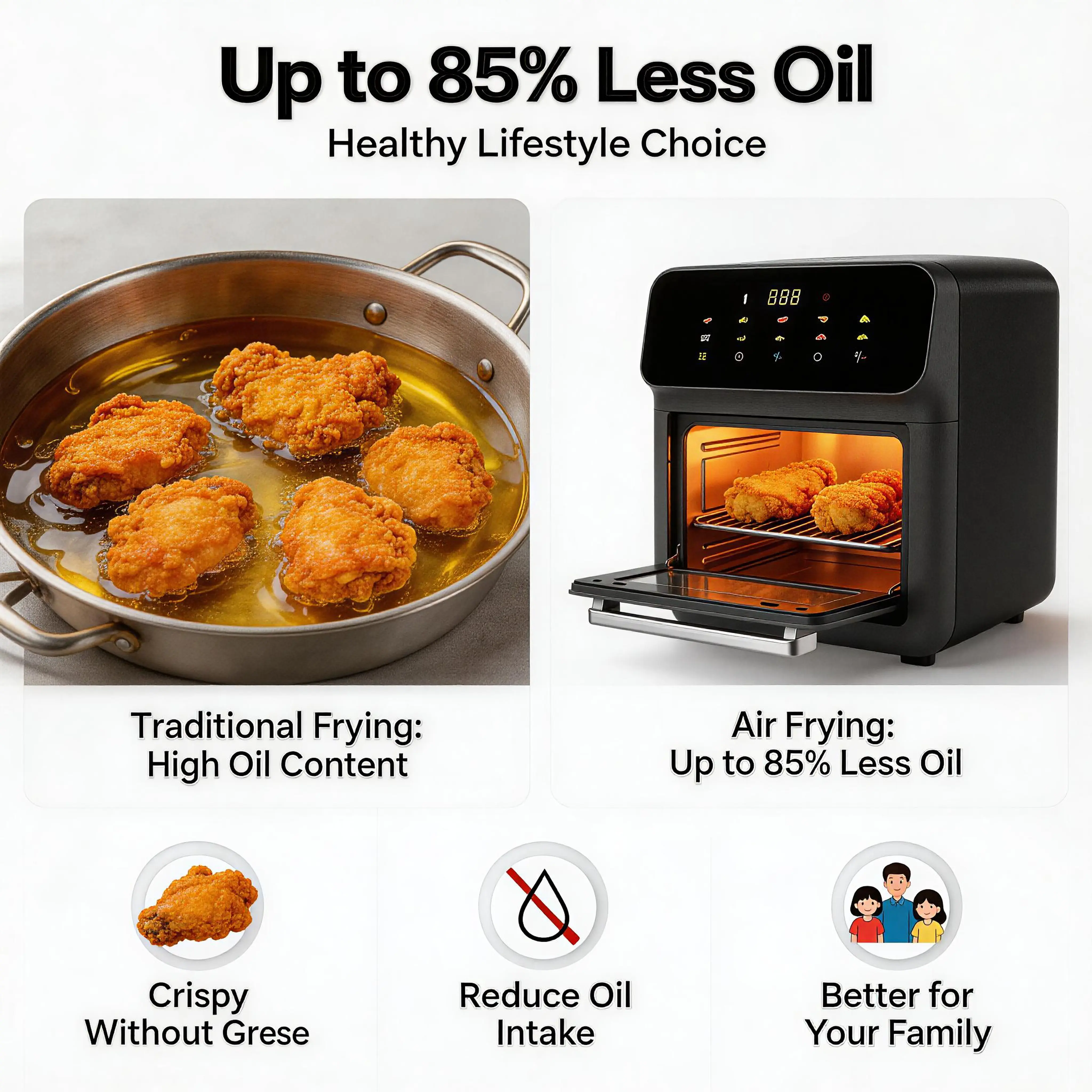 Enjoy all your favorite fried foods without the guilt! This air fryer uses rapid hot air circulation technology to cook food with little to no oil, cutting up to 80% of the fat and calories found in traditional deep frying. It’s the perfect solution for health-conscious families, letting you indulge in crispy fries, juicy chicken wings, and crunchy snacks while sticking to your dietary goals. No more messy oil, no more unhealthy additives—just delicious, wholesome meals for you and your loved ones.