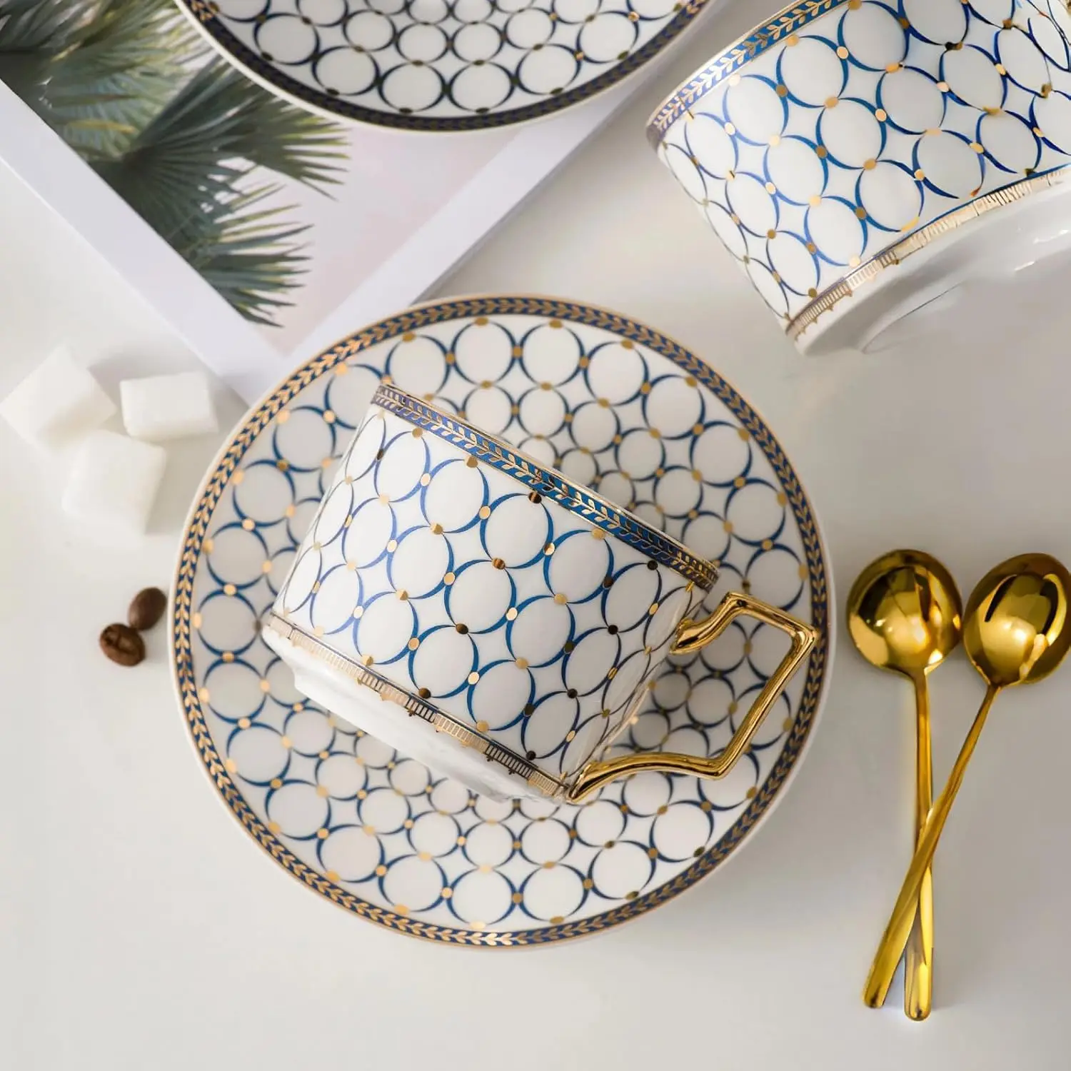 Elevate your tea time with this exquisite 7 oz bone china set. Perfect for cappuccino, latte, or MOCHA, it includes a golden spoon. The set is elegantly designed for a luxurious experience. Each piece is delicately crafted from high-quality porcelain clay, ensuring a lightweight and refined appearance. Ideal for elegant female suits, this set is a must-have for any tea lover.
