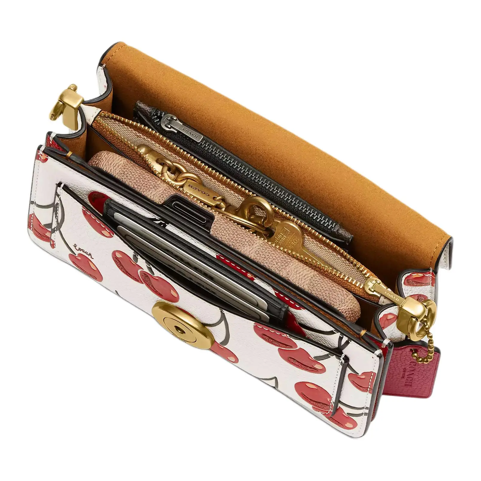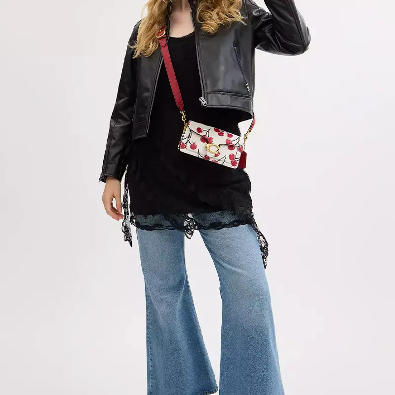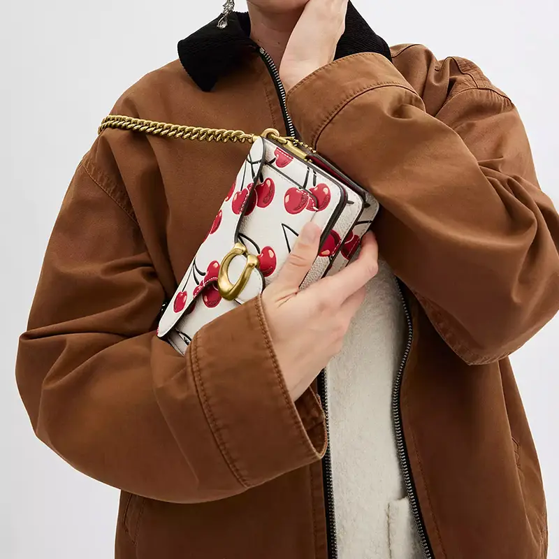 Design Concept: A fusion of vintage inspiration and contemporary utility. The compact silhouette features clean lines, a structured base, and playful cherry-printed leather—a nod to COACH’s tradition of joyful, story-driven motifs.