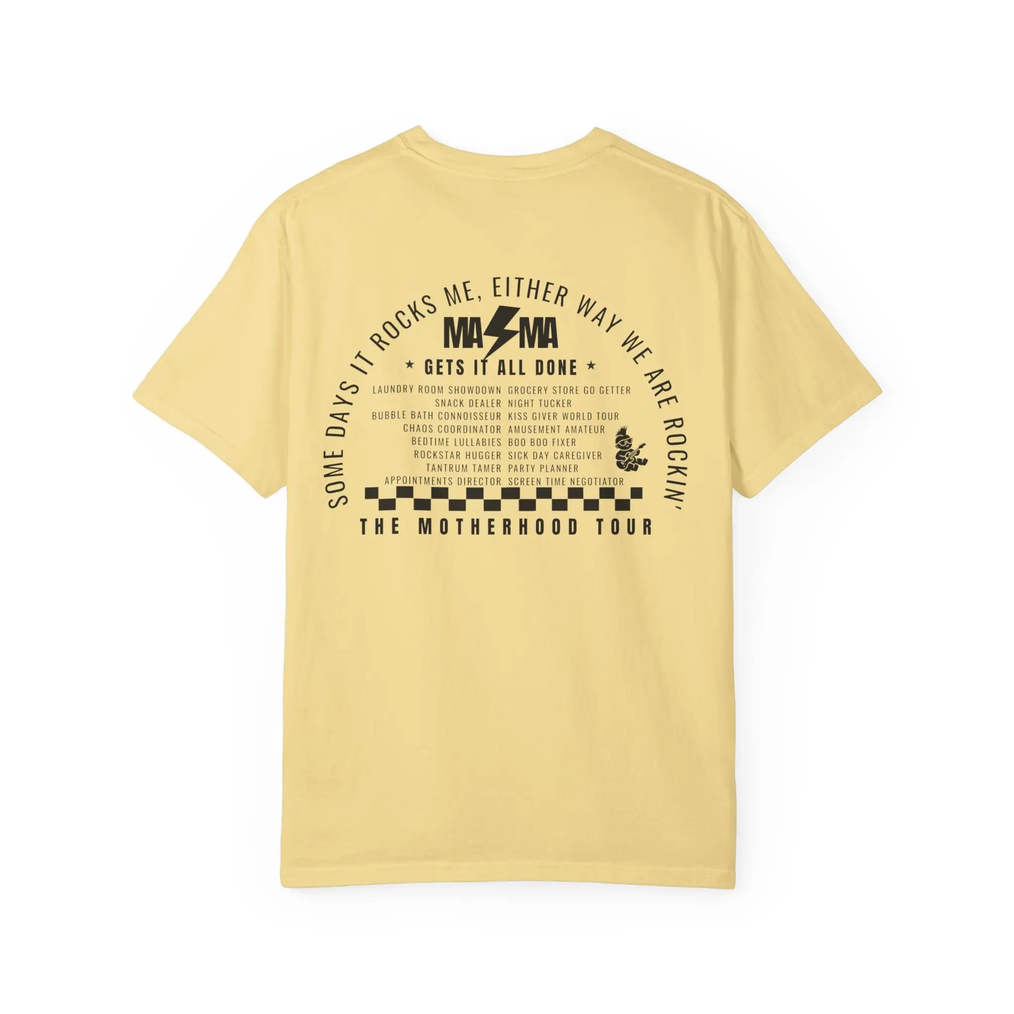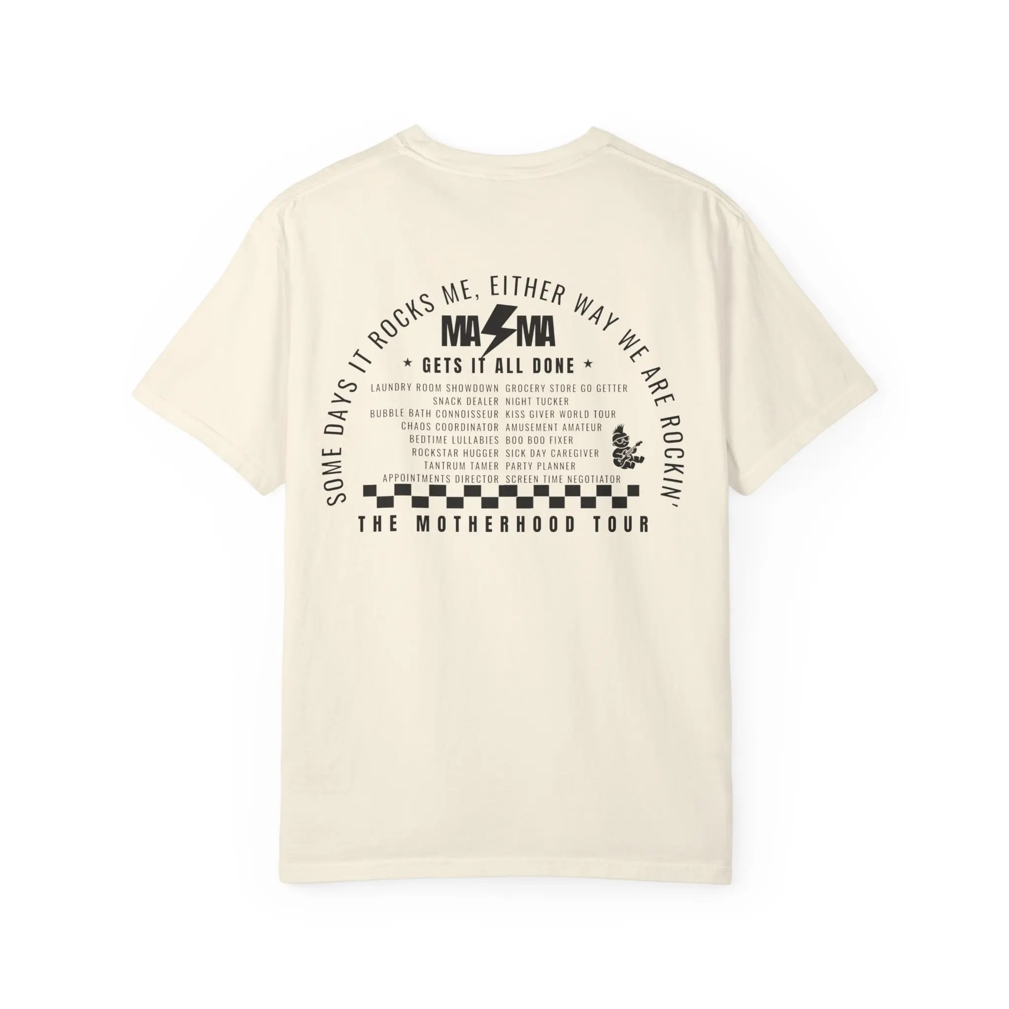 A soft, garment-dyed tee designed for days that are equal parts chaos and triumph. This heavyweight cotton shirt settles into your routine with a lived-in feel and a relaxed silhouette that moves with you — from school runs to late-night feedings and everything in between. The subtle front emblem and typographic, tour-style back print read like a badge of solidarity: honest, slightly irreverent, and full of heart. It’s the kind of tee you reach for when you want comfort without losing personality, a quiet companion that holds up wash after wash while wearing its story on the back.