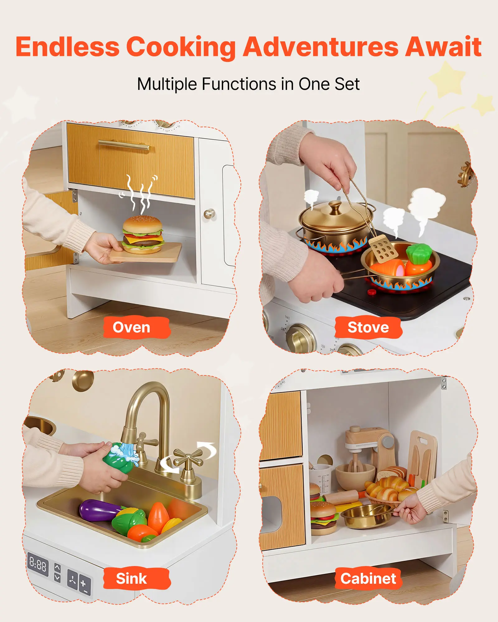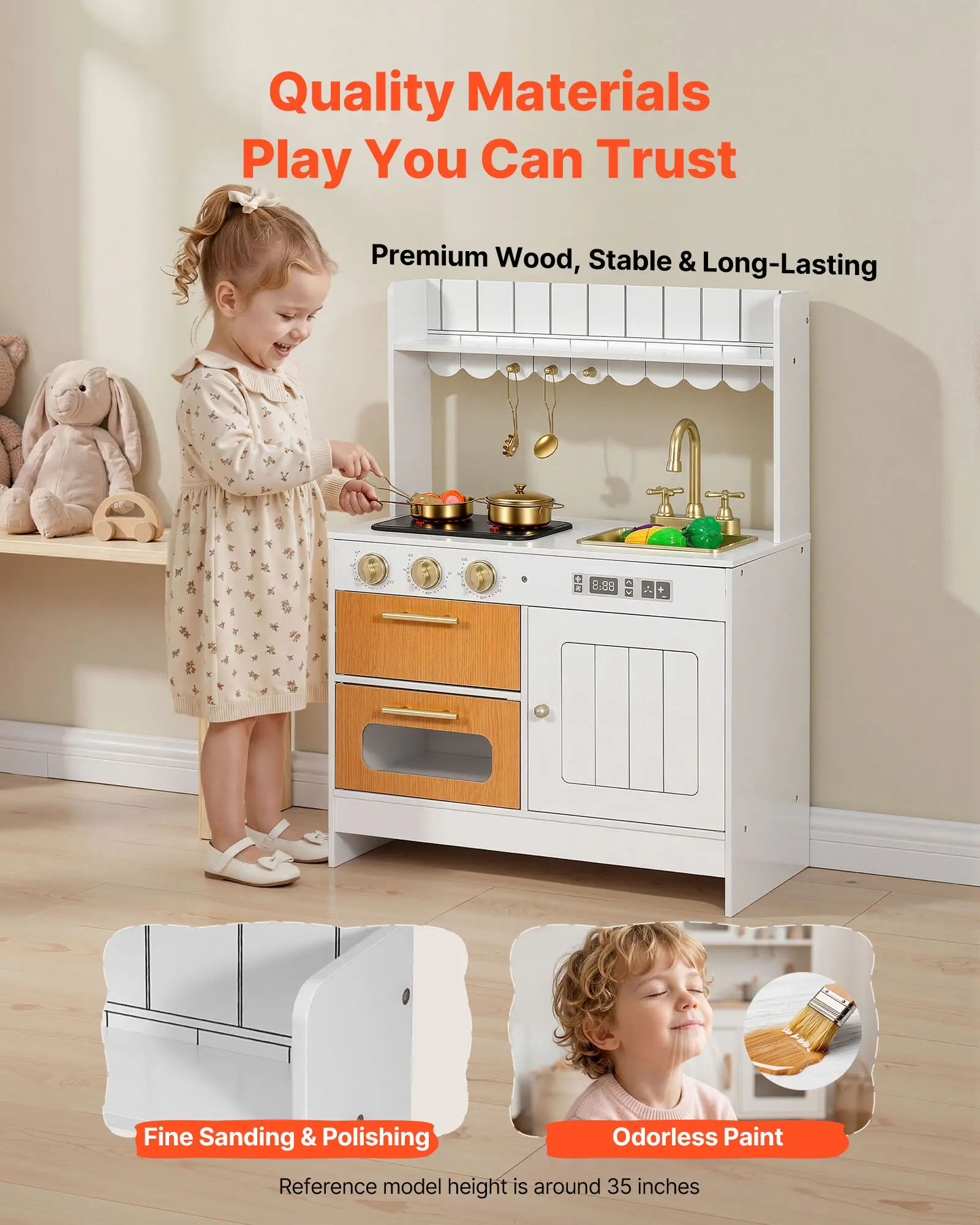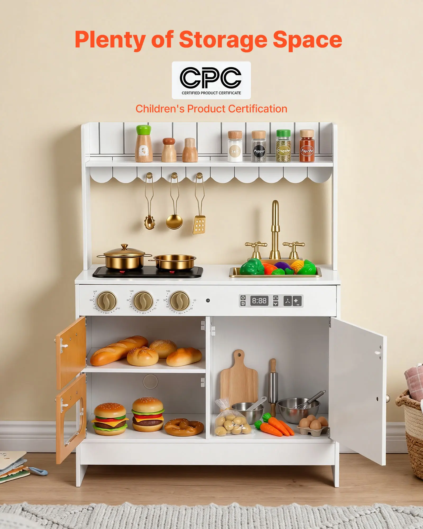 ·Quality Materials, Built to Last: Crafted from premium MDF and solid wood, this play kitchen for kids ensures lasting use. With odorless paint and BPA-free plastic components, it provides dependable quality that parents appreciate for kids' play