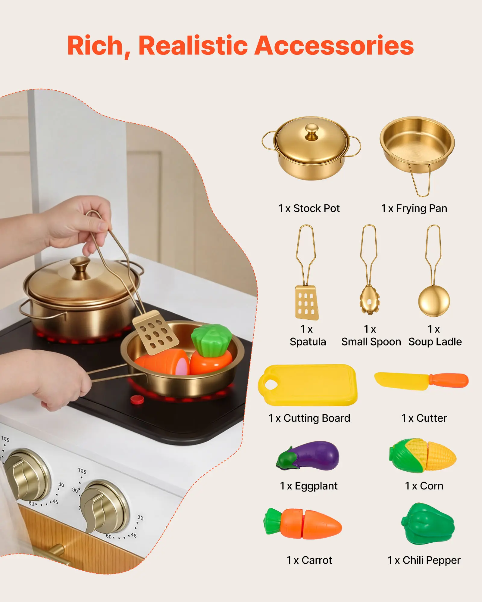 More than just a play kitchen, it supports hand-eye coordination, imagination, creativity, social interaction, and cognitive development. This children's kitchen playset also creates meaningful parent-child bonding moments through shared pretend play.