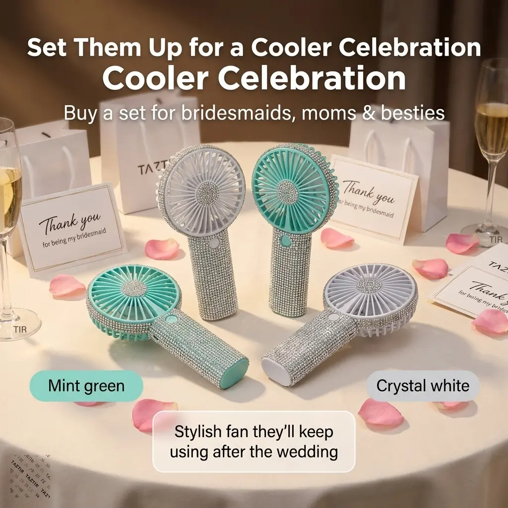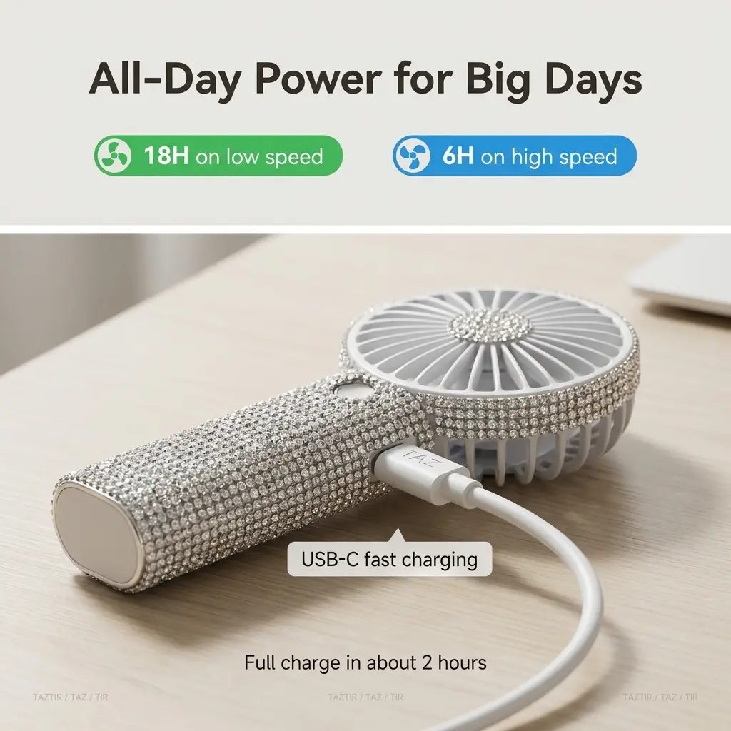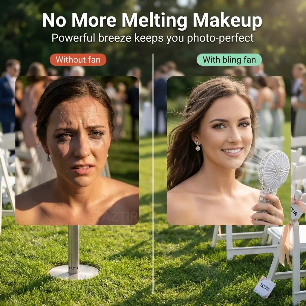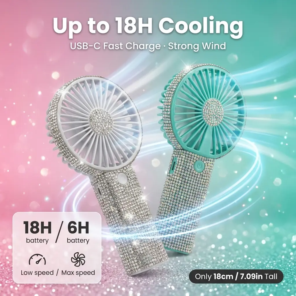 ·The dazzling crystal-style design instantly elevates your look, making it not just a fan but a stylish accessory that stands out in any crowd.