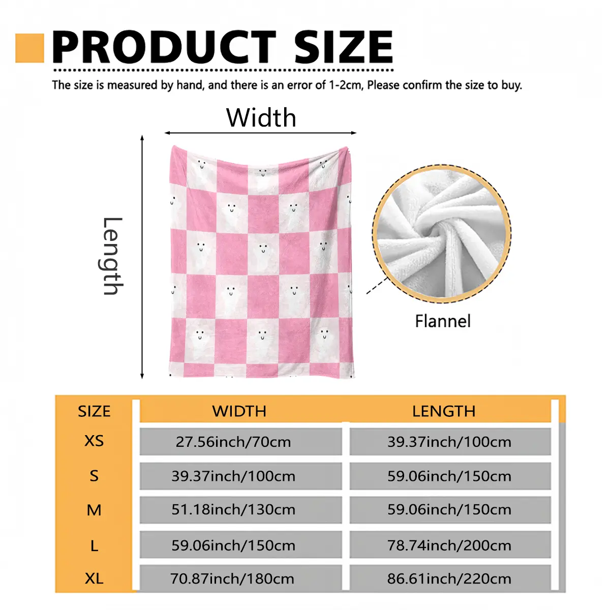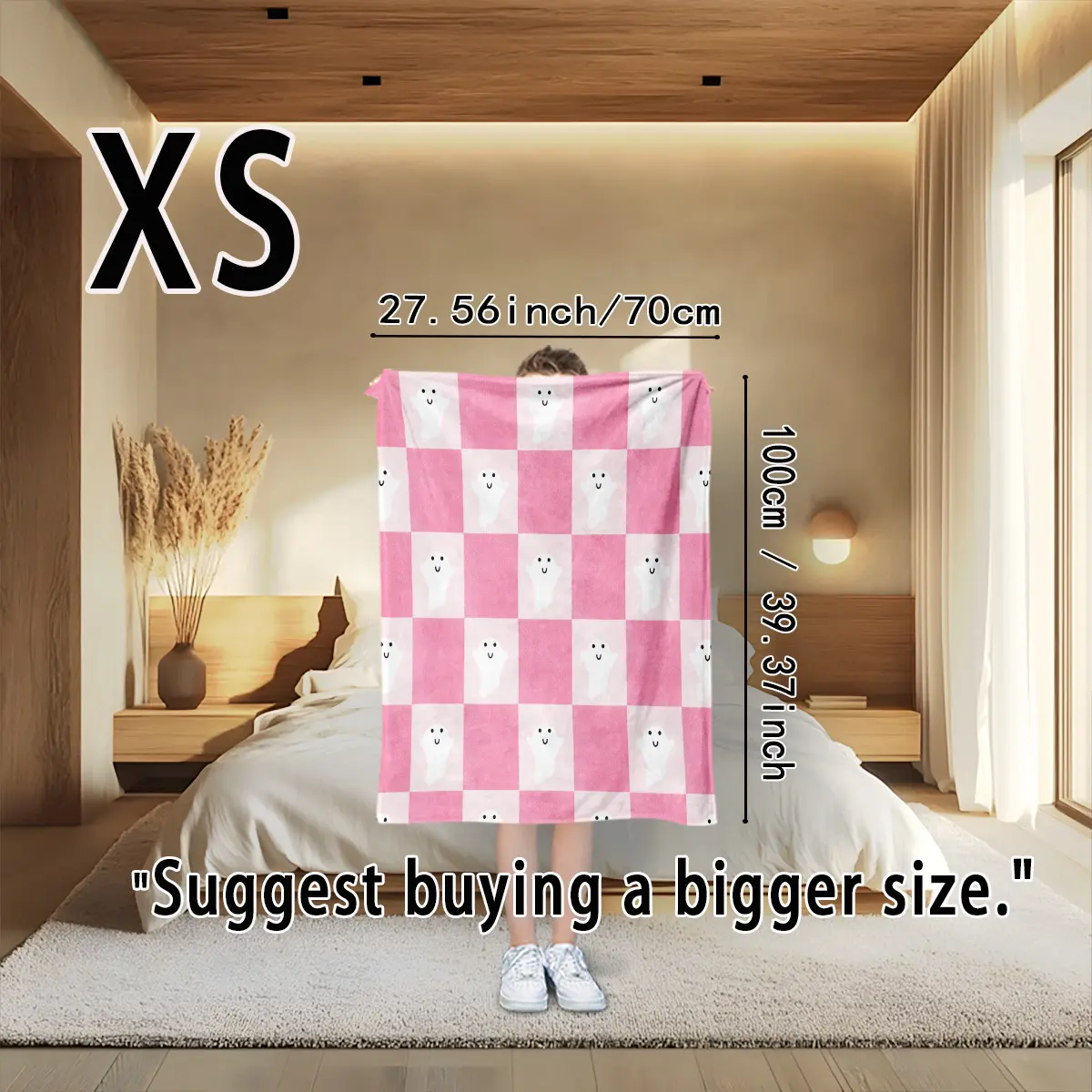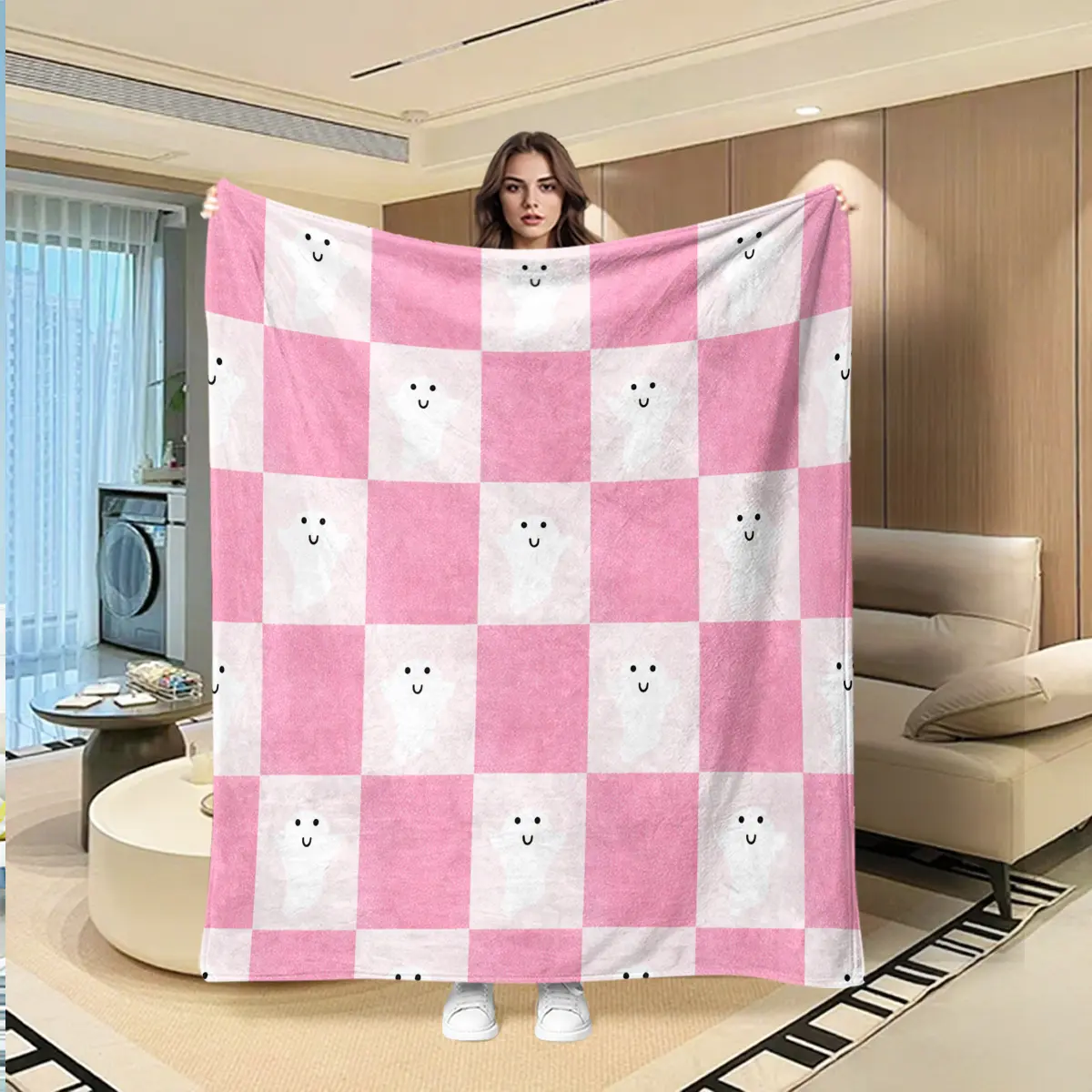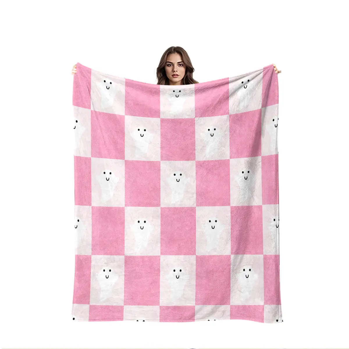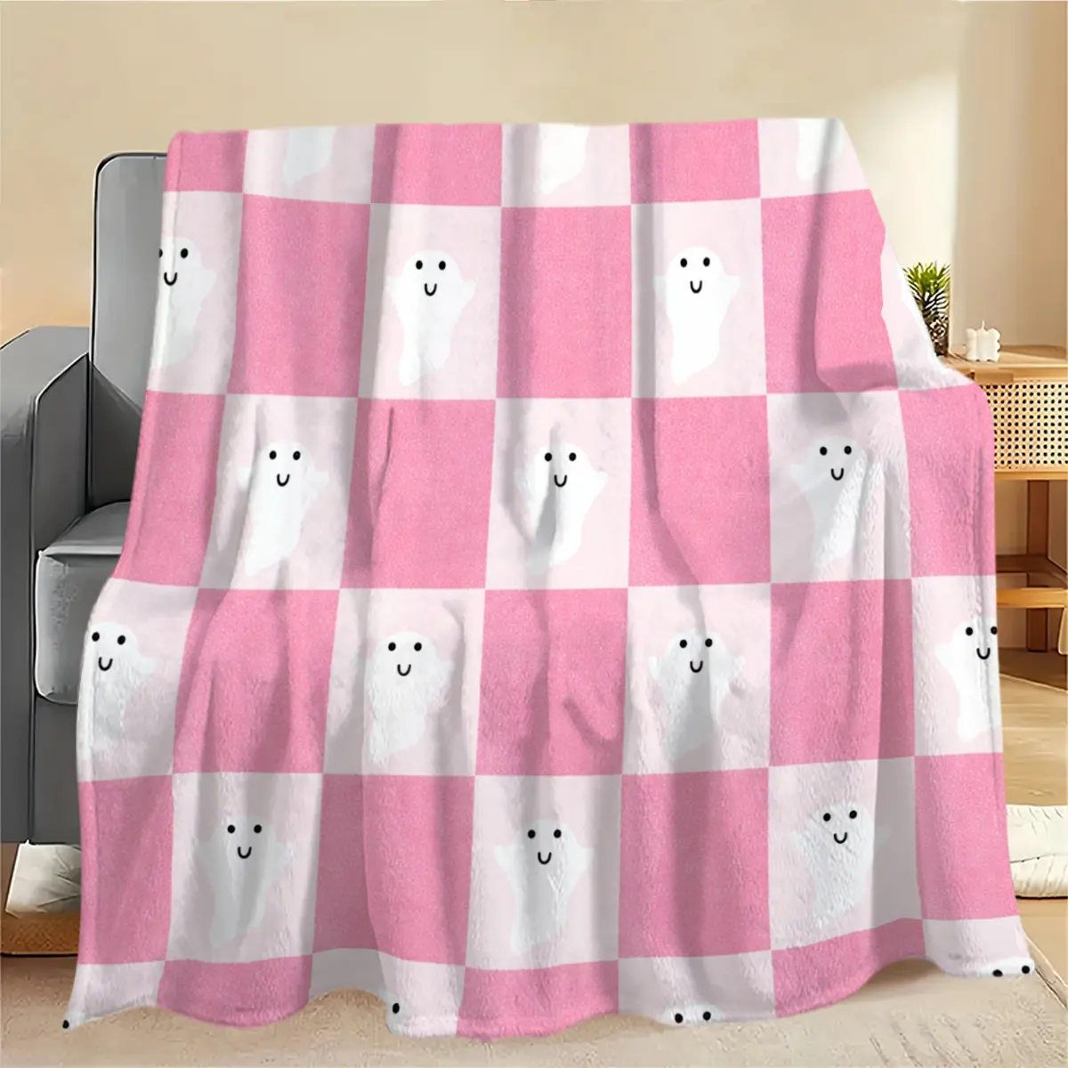 Cute ghost blanket with a pink-and-white checkered pattern that softens Halloween’s spooky feel while emphasizing healing and cute attributes. Suitable for young women and those who enjoy a girly aesthetic—ideal as a sofa throw, bedding decor, and office