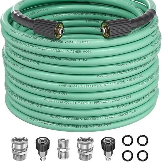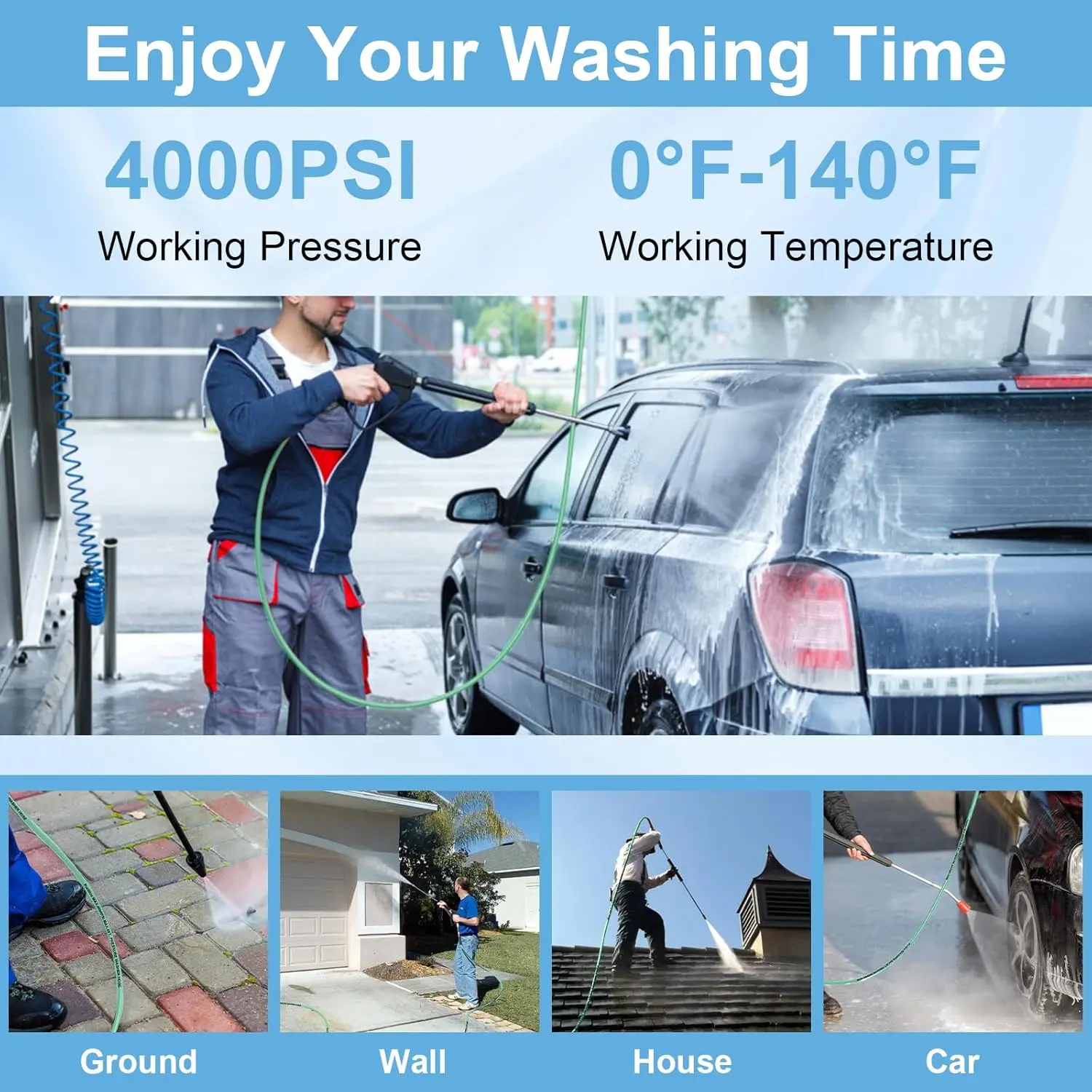 ·【100FT Pressure Washer Hose】4000 PSI maximum working pressure, 11000 PSI maximum burst pressure, 140℉/60℃ max working temperature. This 100FT pressure washing hose effortlessly handles complex cleaning demands, ensuring safe and reliable performance for diverse cleaning applications.