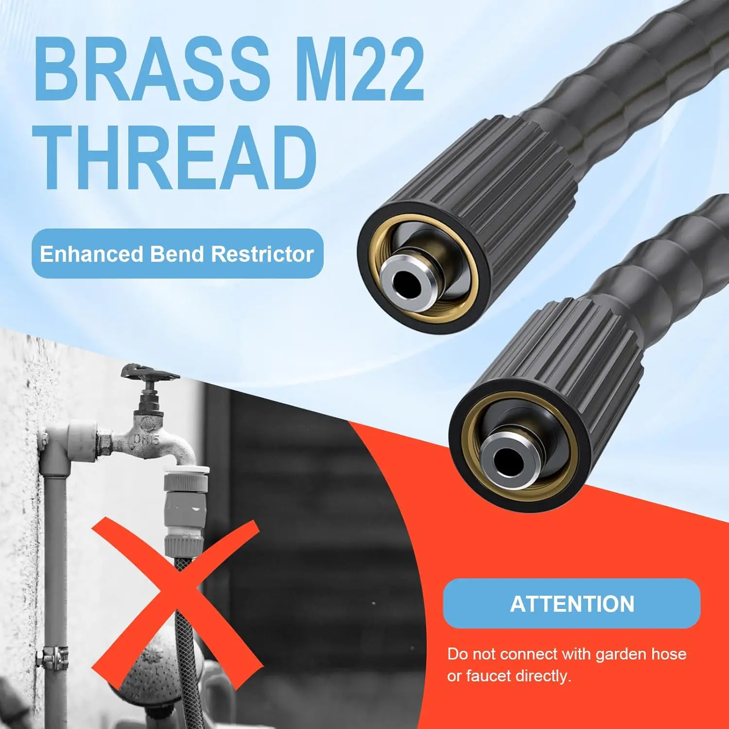 ·【M22 Universal Fitting】Equipped with standard M22-14mm female threaded connections, our hose is compatible with most gasoline and electric pressure washers. Designed for leak-proof and seamless integration, it is the ideal choice for high-pressure cleaning.