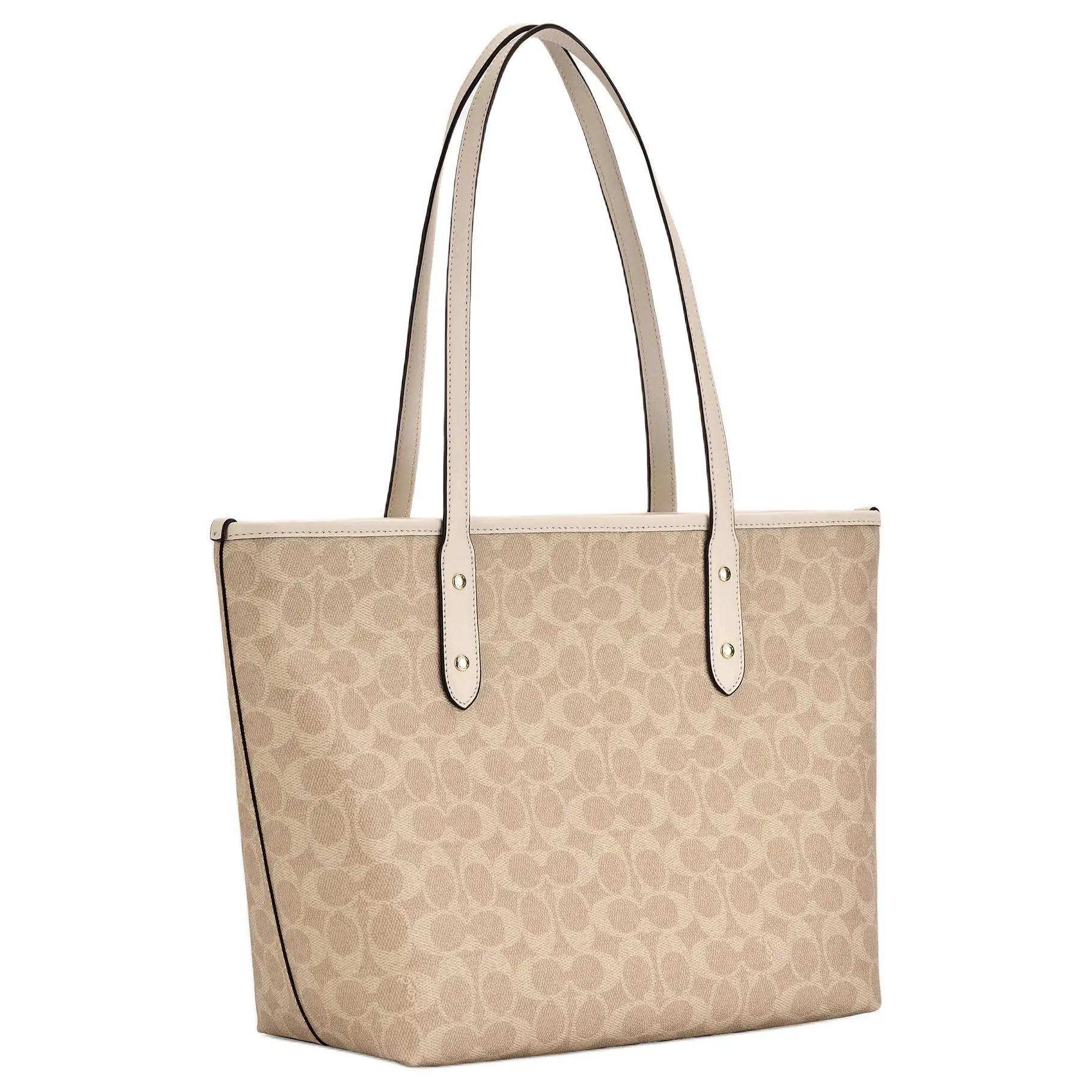 Materials: Outer shell crafted from durable, water-resistant coated canvas with genuine leather trim (handles, base, and strap). Lining is smooth, stain-resistant polyester with a subtle COACH logo print.
