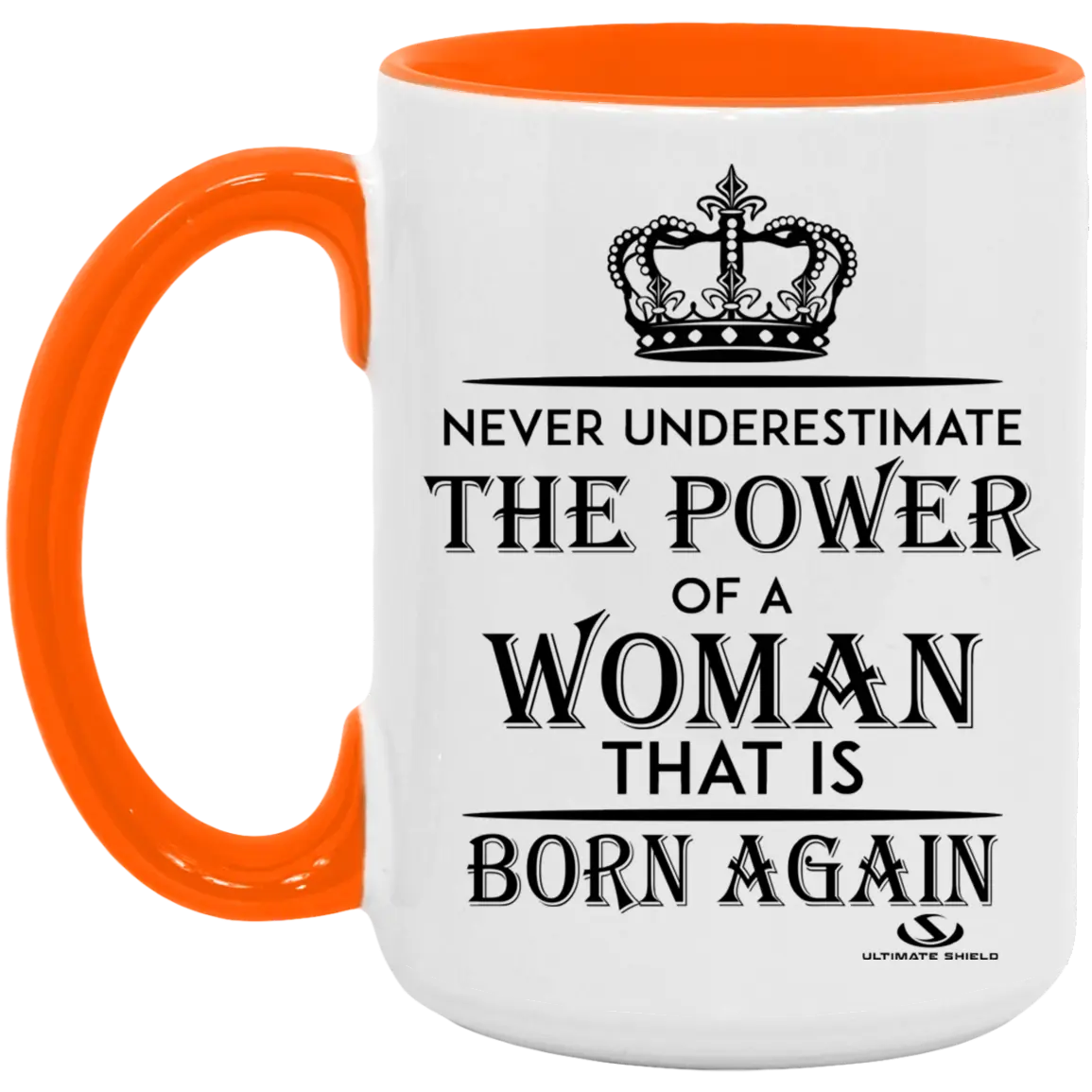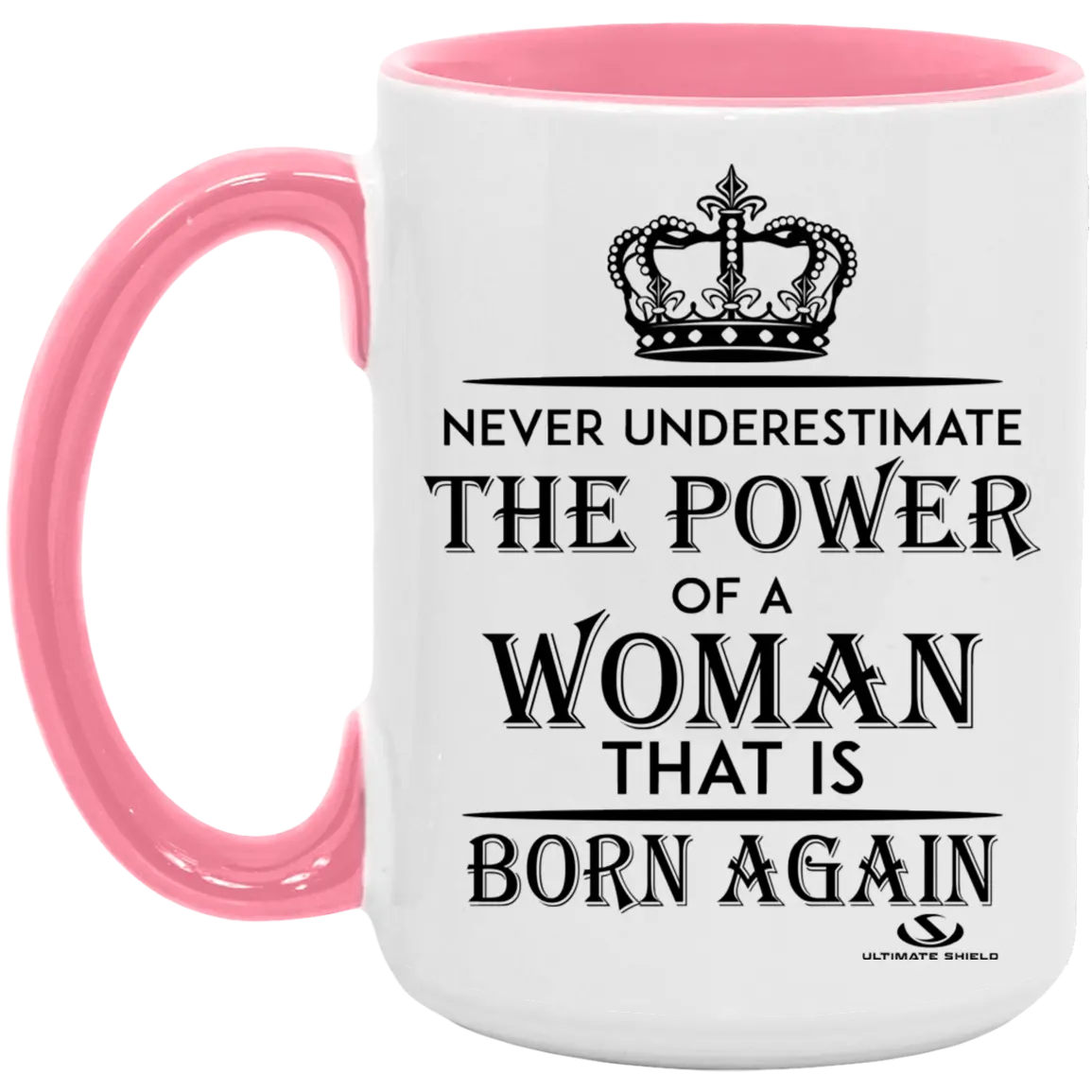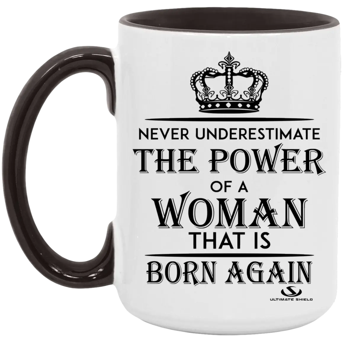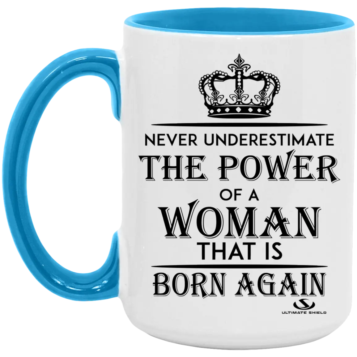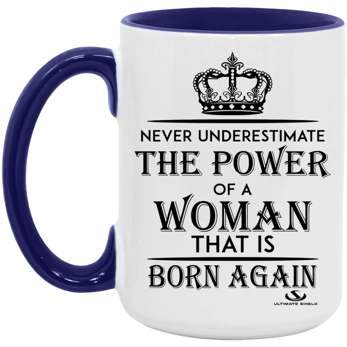 NEVER UNDERESTIMATE THE POWER OF A WOMAN THAT IS BORN AGAIN 15oz. Accent Mug