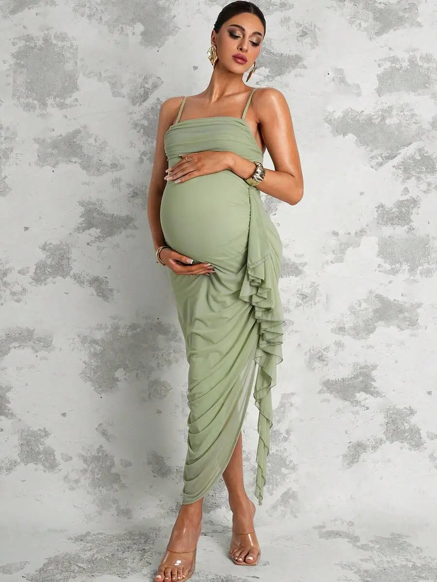 MISHELLA Maternity Summer Outfits Maternity Solid Color Spaghetti Strap Ruffle Hem Dress Photography Perfect For Vacation Baby Shower Party