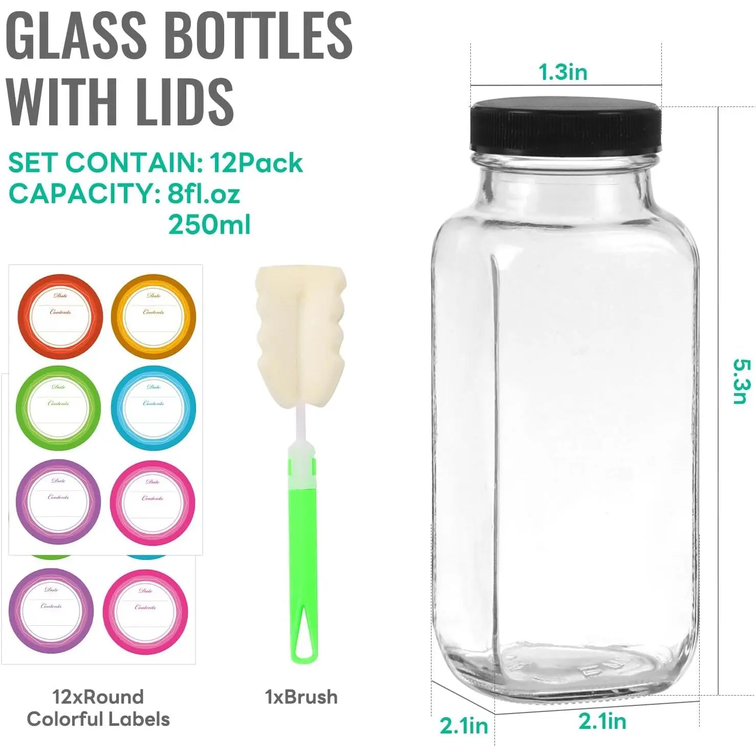 8 oz Glass Juice Bottles with Lids 12 Pack,Reusable Glass Drink Bottles,250ml Water Drinking Jars for Milk,Juicing,Kombucha,Ginger,Beverage Glassware,Juice Drinking Jars