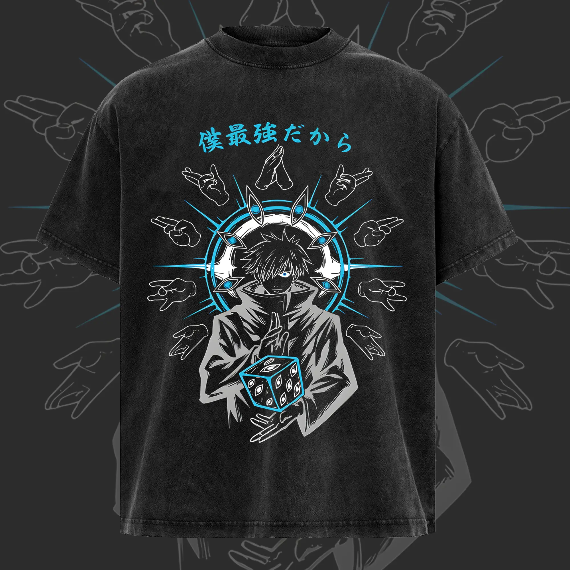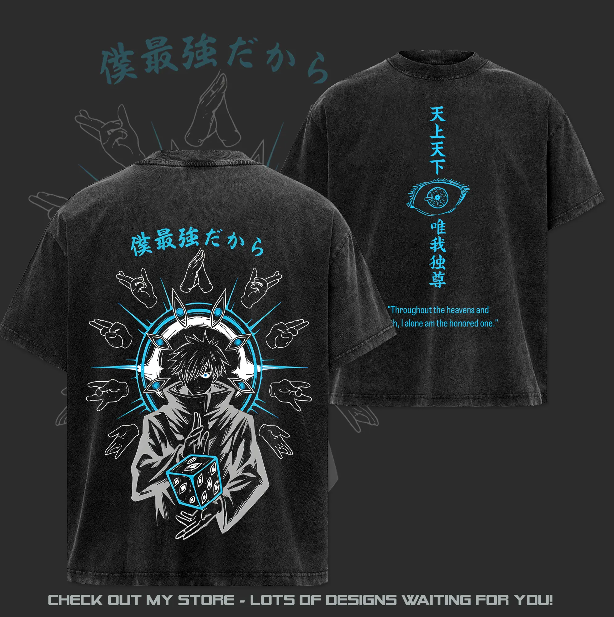 5. Gojo Satoru - Jujutsu Kaisen Washed Tee - Hoodie | Vintage Washed Anime Graphic Tee - Executioner Sword Judgement Court Dark Aesthetic Oversized Streetwear Shirt for Anime Fans, Summer Outfits, Gift For Him Her