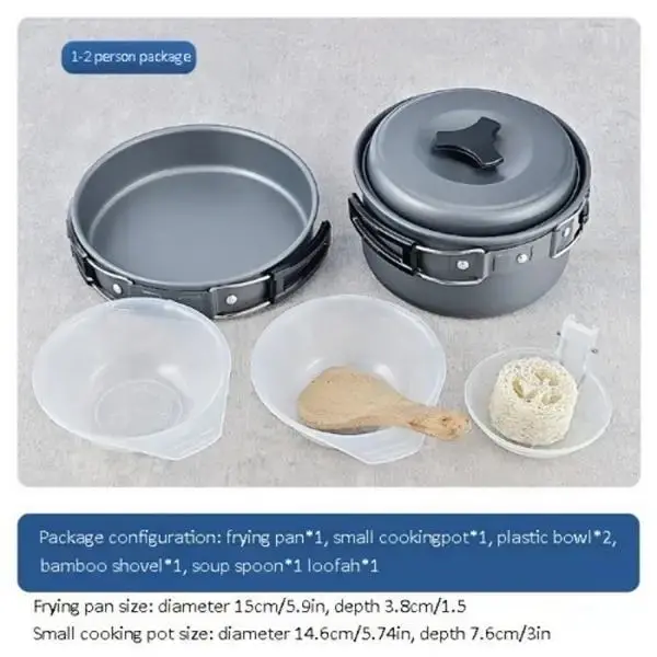 The RV Outdoor Camping Cookware Set is designed for1-3 persons, offering a comprehensive solution for outdoor cooking needs.This foldable picnic BBQ pot set includes essential cookware items, ensuring convenience and efficiency during camping trips.