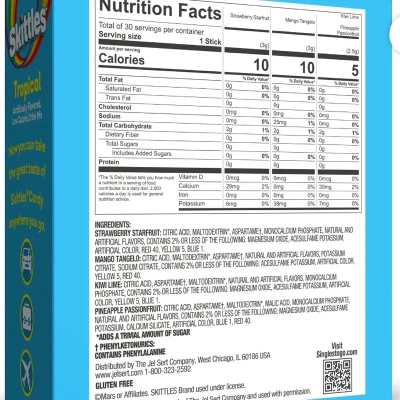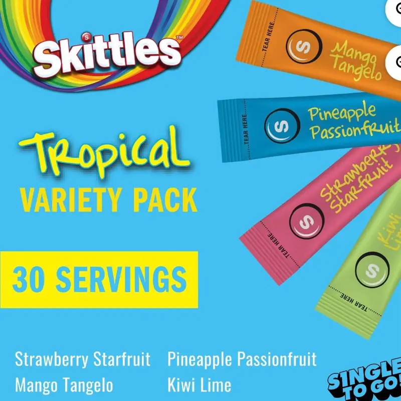 Skittles Zero Sugar Variety Pack Singles-to-Go Powdered Drink Mix, Tropical, 30 Count Packets