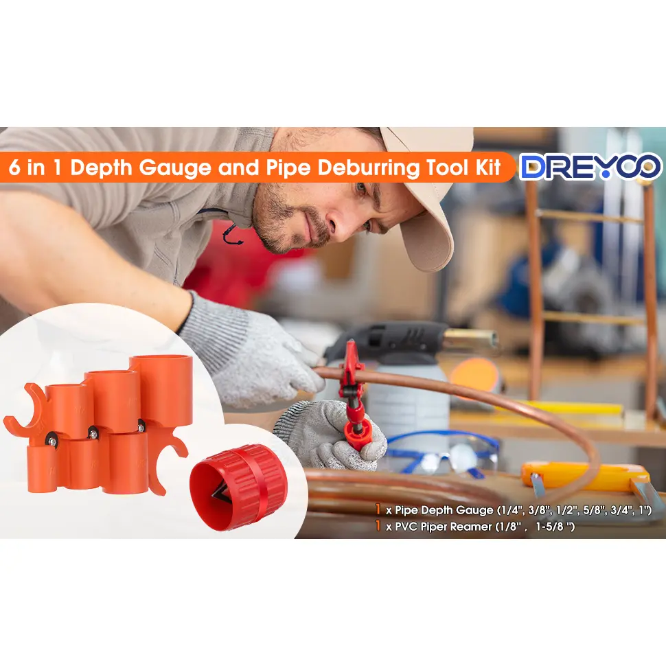 6 In 1 Depth Gauge Tool: this pipe deburring pipe and depth gauge tool has 6 sizes: 1/4", 3/8", 1/2", 5/8", 3/4", 1"Removal tool fits most brands of push fit fittings and valvesEasy to measure insertion depth and after the pipe is insertedIt is an essential cutting and fixed tool for home handymen and plumbersDeburring Function: the red pipe reamer tool is suitable for use on the inside and outside of the pipeThe deburring tool contains 6 metal blades in a tapered arrangementThis design can file the burrs on the inside and outside of the pipeIt is suitable for 1" to 5/8" pipesBoth clockwise and counterclockwise directions can deburr, which is convenient for pipe installationQuality Material: the measuring tool is made of strong plastic, which is not easily bent and deformedThe main body of the inner outer pipe reamer is also made of ABS, and the internal deburring blade is made of hardened alloy steel, which is sturdy and strongIdeal for reaming on copper, aluminum, brass and soft steel tubingEasy to Use: both tools are simple to useWhen using a push in fitting to connect a pipe, a simple measurement of the insertion depth can be made with a measuring tool.To use a deburring tool, simply aligning the pipe with the blade and rotate it clockwise or counterclockwise to remove most of the burrs inside and outside the pipePractical Tool Kit: our tool set kit includes a deburring tool as well as a depth measurement toolHighly compatible with any combination of copper, PEX, CPVC and PERT piping, easy to remove and replace, suitable for all types and sizes of piping, can be applied for domestic, plumbing applications or as a mechanic's tool in the workshops