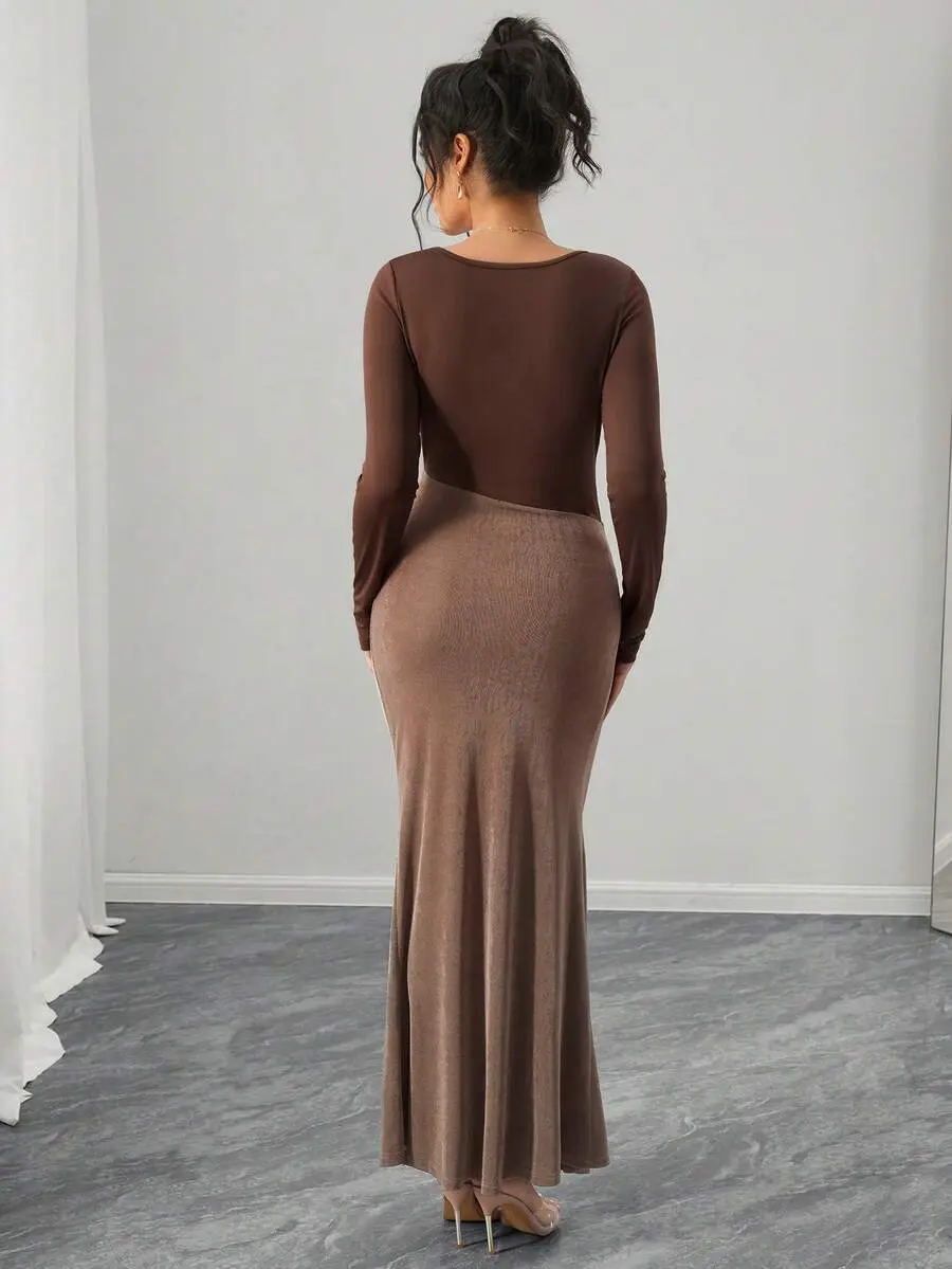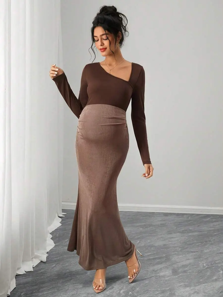 MISHELLA Elegant Maternity Party Solid Color Contrast Patchwork Fishtail Dress