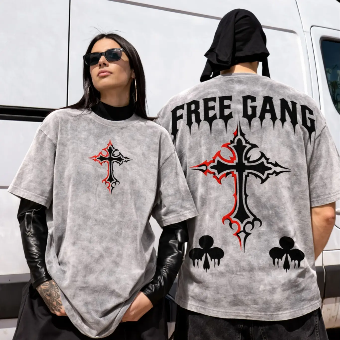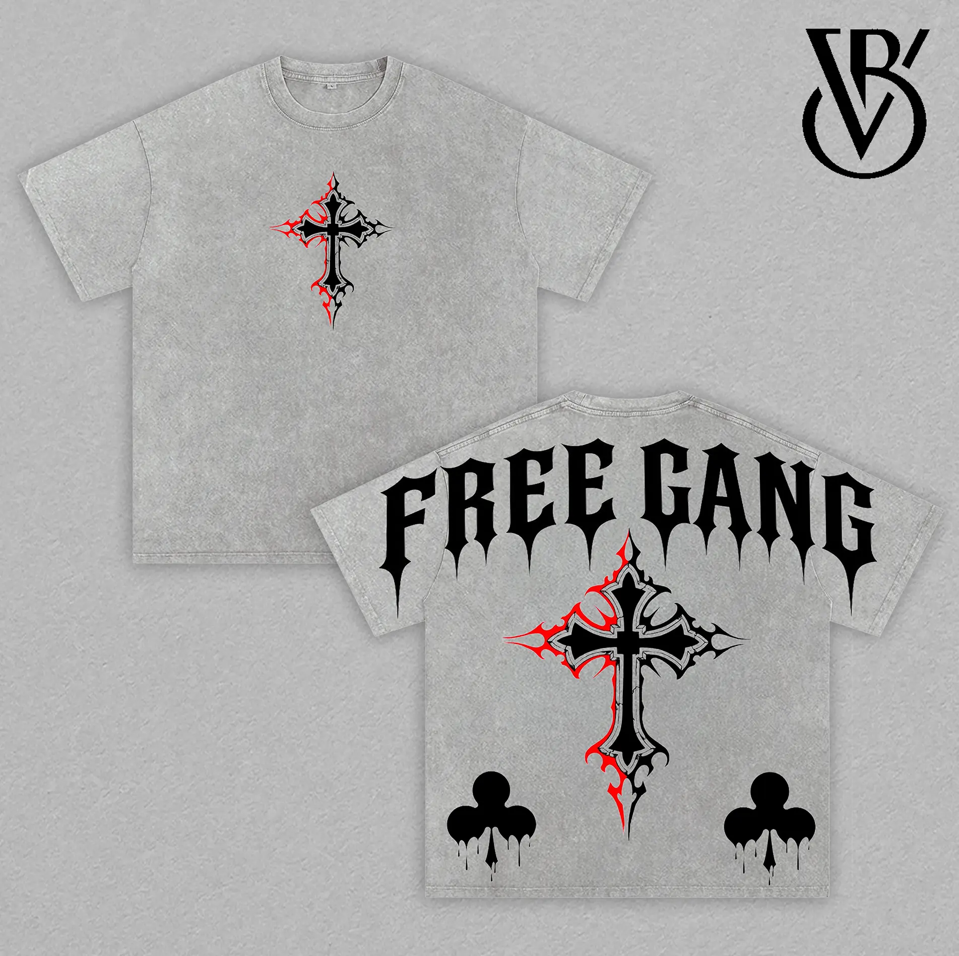 Free Gang Gothic Cross Vintage Washed T-Shirt – Oversized Boxy Fit Heavyweight Cotton Streetwear Tee, Dark Aesthetic Graphic Unisex Shirt