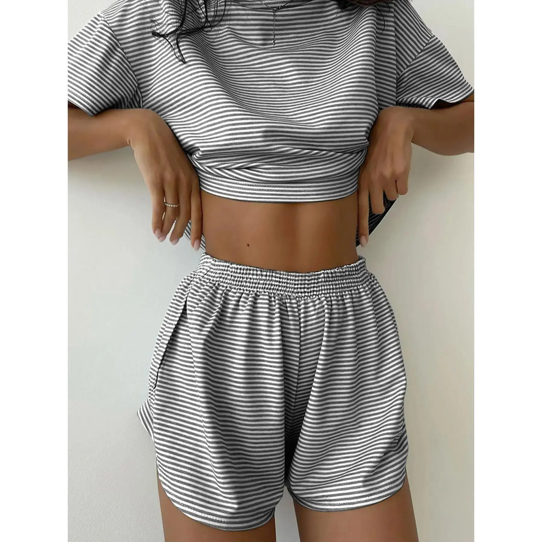 5. Women's Striped Print Drop Shoulder Tee & Wrap Split Shorts Pyjama Set, Casual Comfy Round Neck Short Sleeve T-shirt & Elastic Waist Shorts Pj Set, Summer Outfits