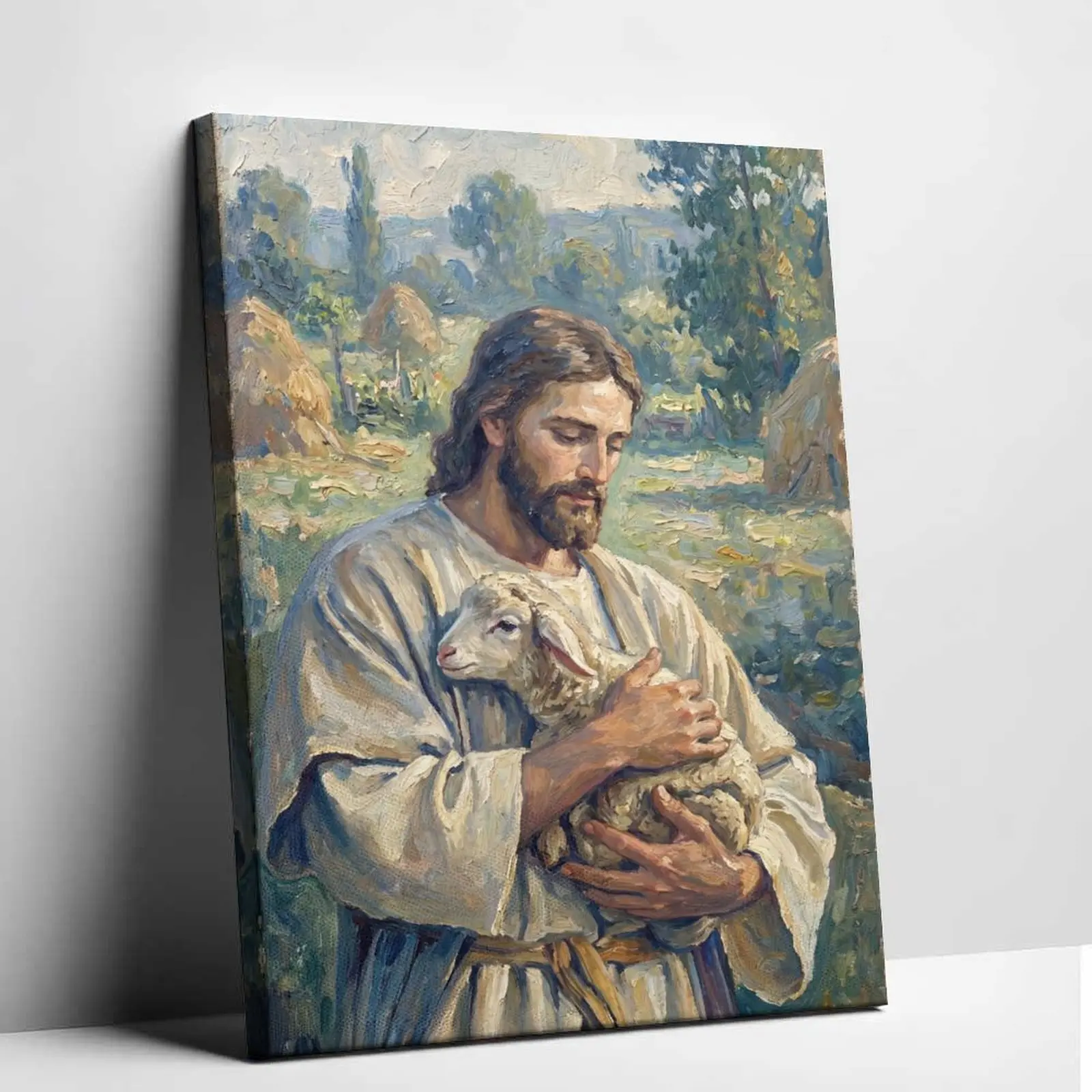 🎨 Suitable for both home and office settings, this canvas art enhances any room's ambiance. The design of Jesus with the Lost Lamb is a poignant symbol of love and redemption. It's a meaningful addition to your decor collection.