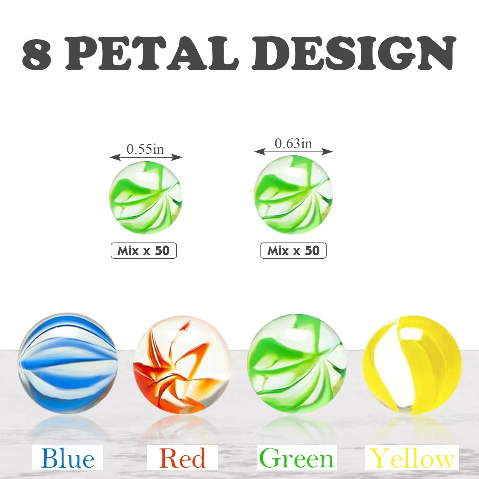 Crafted with precision, these marbles feature an eight-petal design. Made from superior glass, they come in red, green, yellow, and blue. Their compact size makes them easy to carry, perfect for on-the-go gaming. 🌟