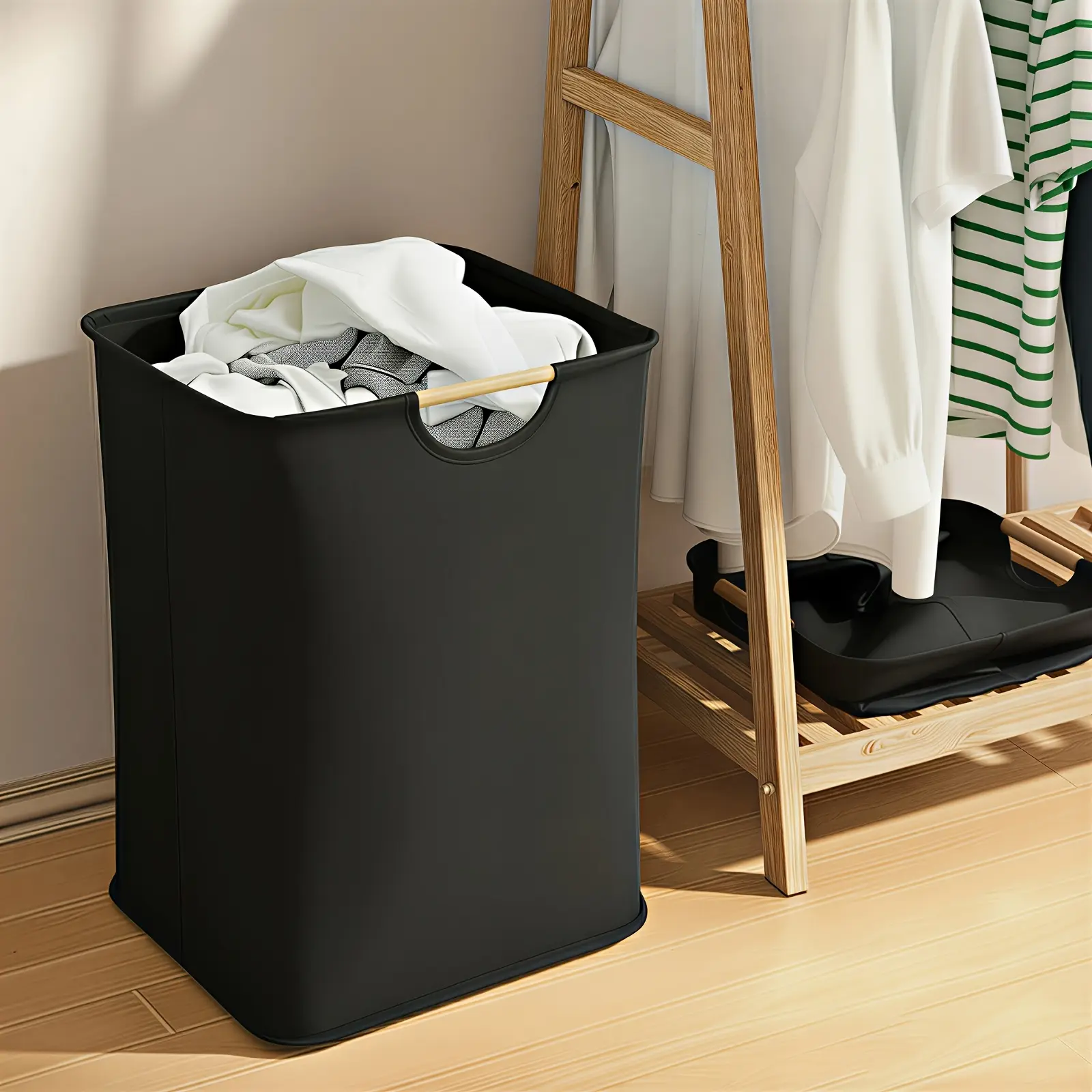 Large foldable laundry basket and storage container with wooden handle — durable laundry basket suitable for bathroom, bedroom, and laundry room — multifunctional, portable, space-saving foldable laundry basket, pure black