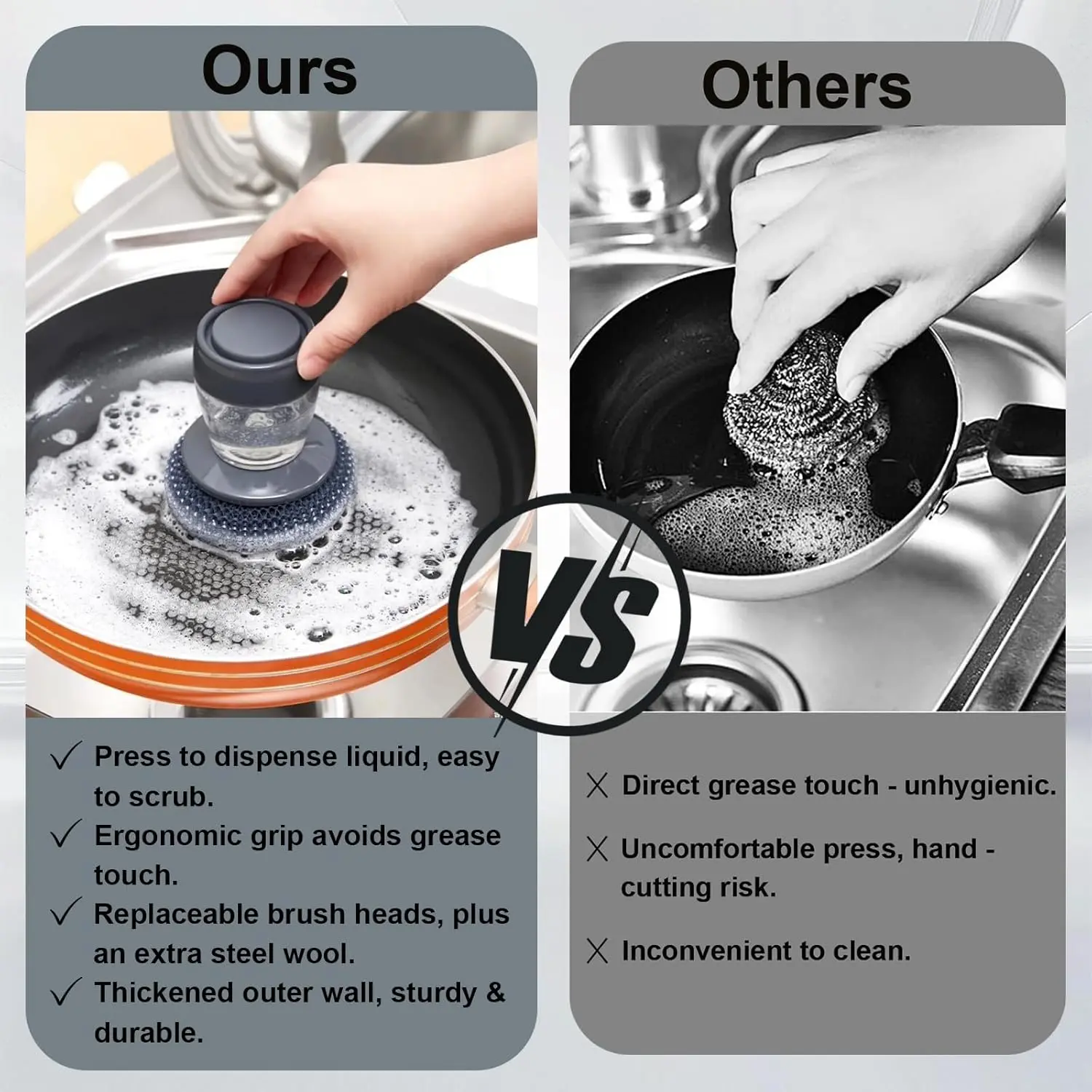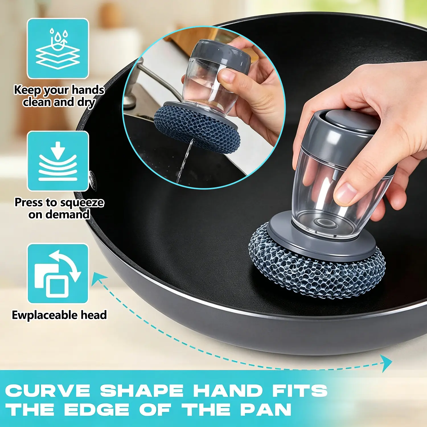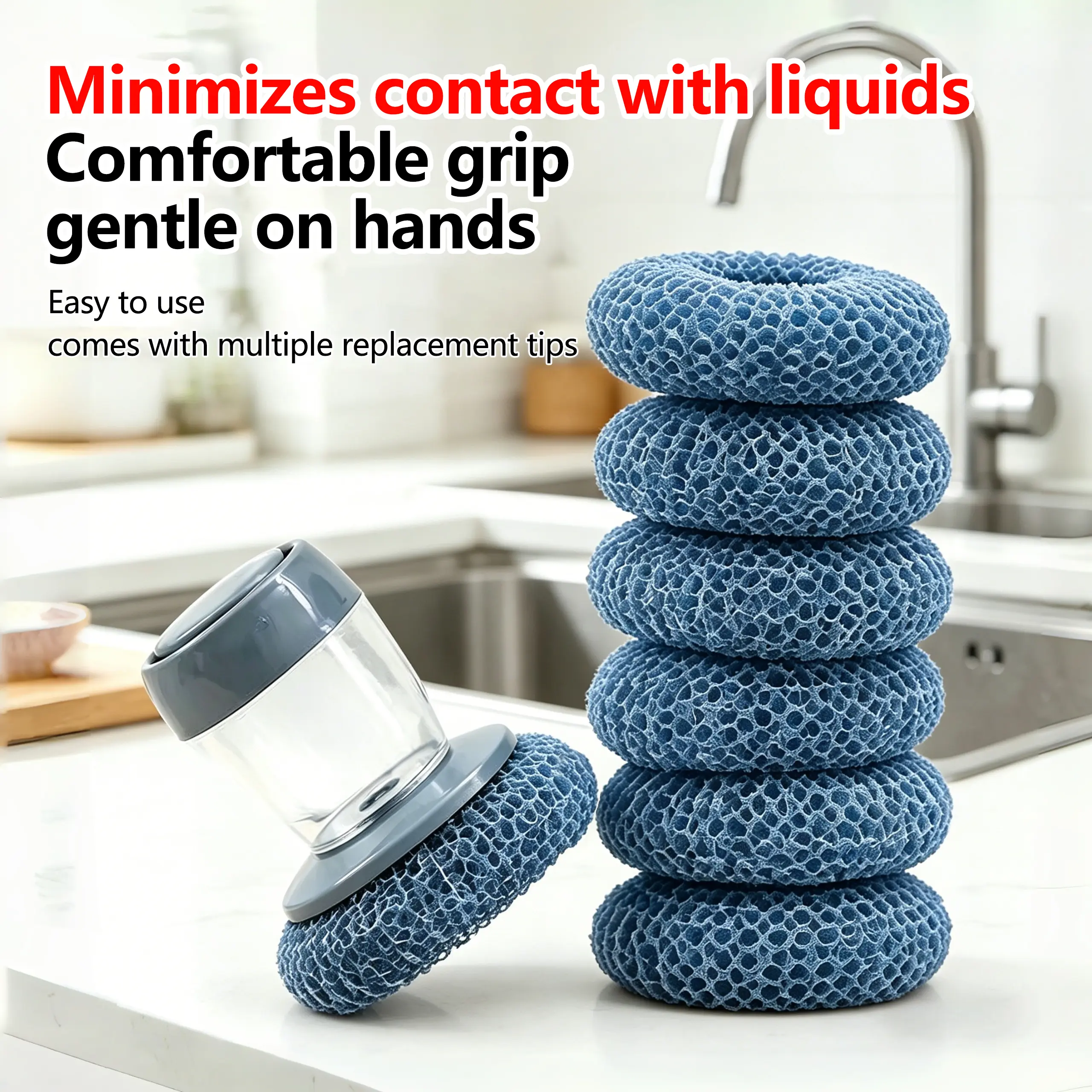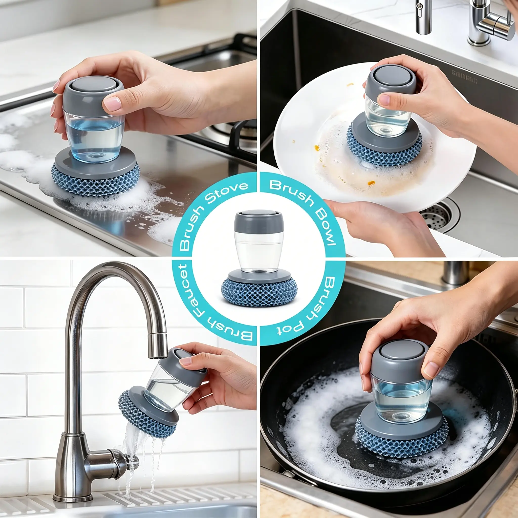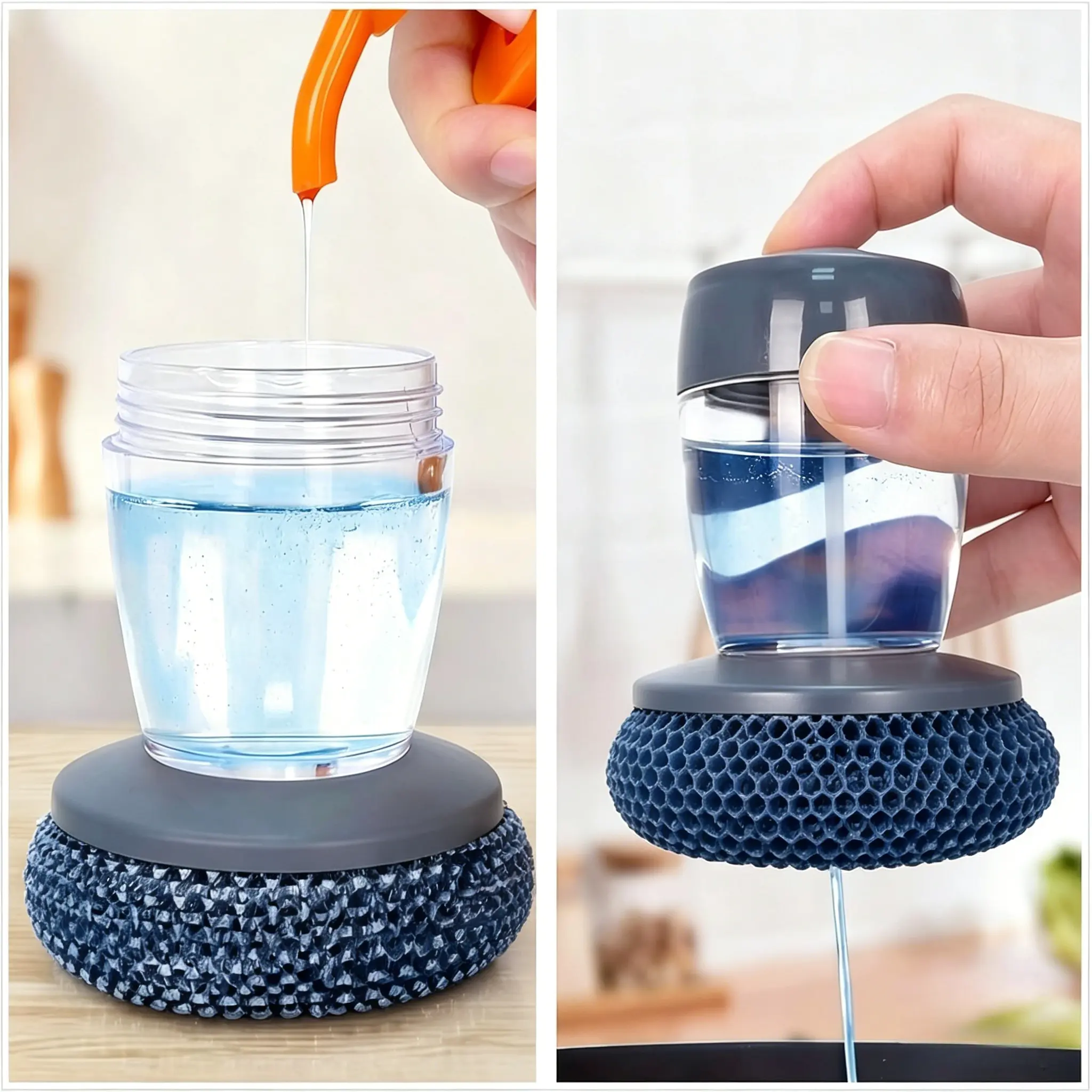3. Easy to refill and clean: The wide-mouth design allows for quick refilling of dish soap, and the brush head can be easily removed for thorough cleaning, preventing bacterial growth and ensuring hygienic safety during daily use.