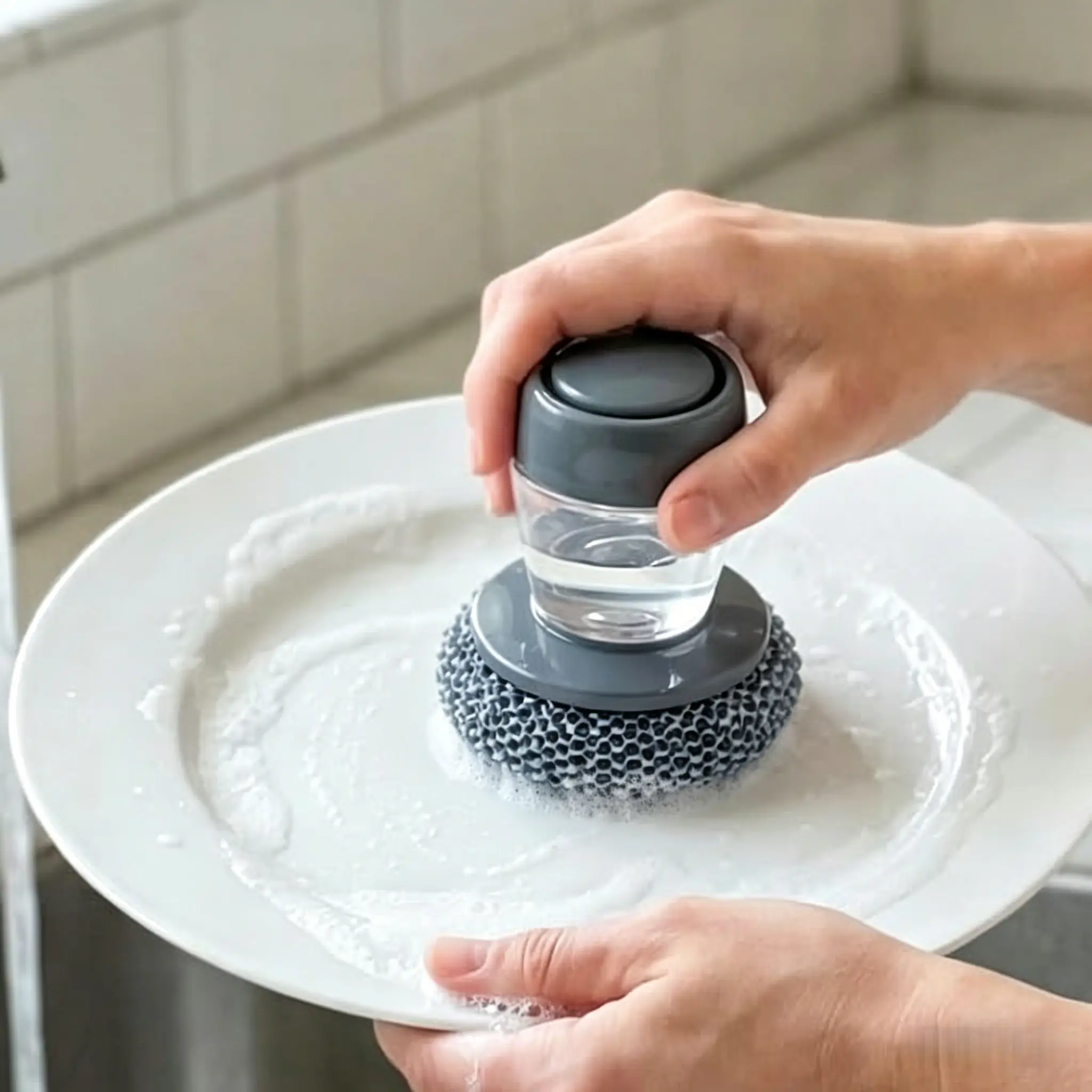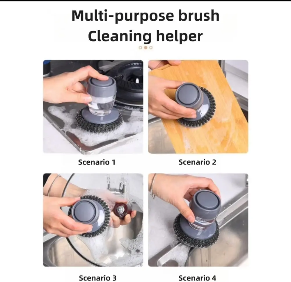This automatic soap-dispensing hand brush features a built-in soap reservoir that dispenses soap with a single press, eliminating the need to repeatedly dip the brush into cleaning solution. It is the ideal choice for efficiently cleaning pots, dishes, and sink surfaces.