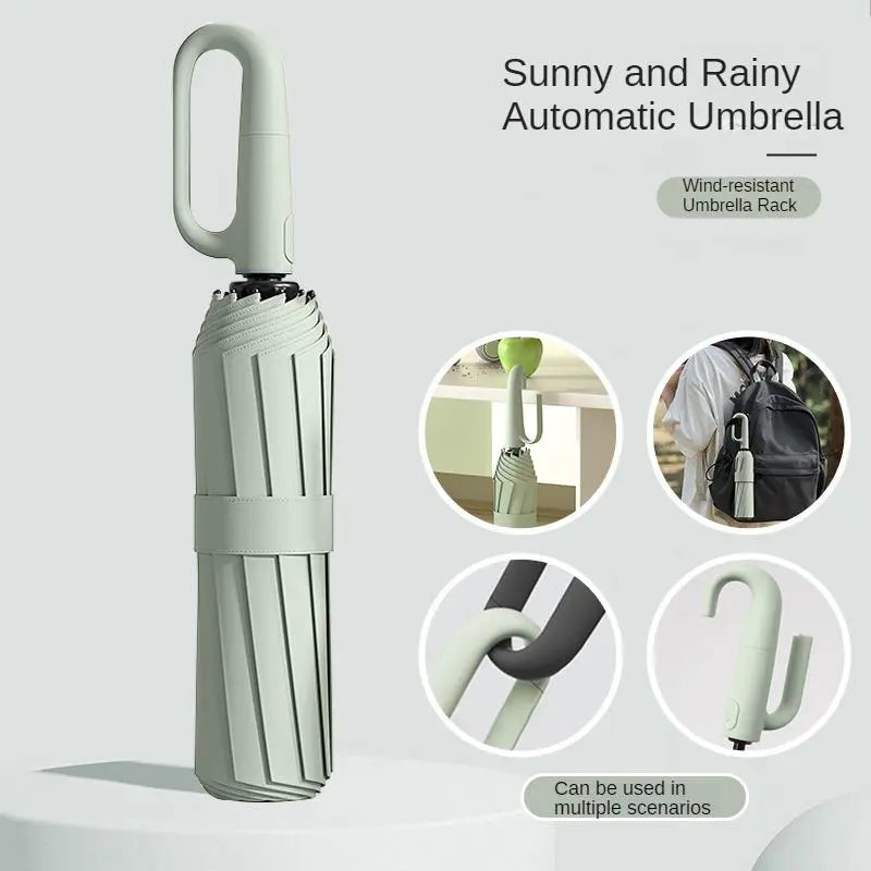 Green Foldable Rainproof Automatic Umbrella, 1 Count Compact Ring Buckle Windproof Reinforced Umbrella, Durable Innovative Sun-protection Folding Umbrella for Women, Pocket Umbrella, Wind Resistant Umbrella, UV Umbrella, Suitable for Rainy Days Outdoor