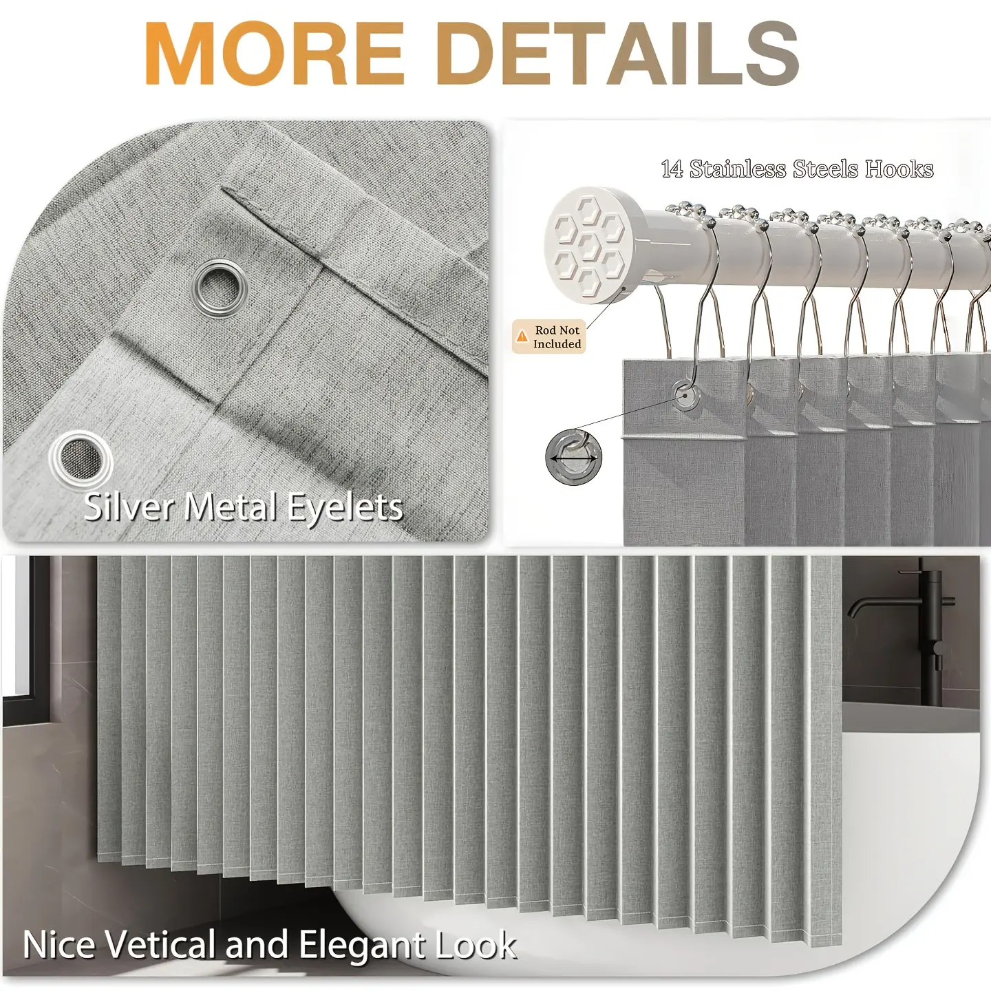 Made from waterproof, mildew-resistant fabric, it repels water and dries quickly to prevent mold growth, keeping your bathroom fresh and clean. The free tie-back strap allows you to keep the curtain open when not in use, while the neutral gray linen-like texture adds a modern touch to any décor. Durable, easy to clean, and built to last, this shower curtain is a must-have upgrade for your bathroom!