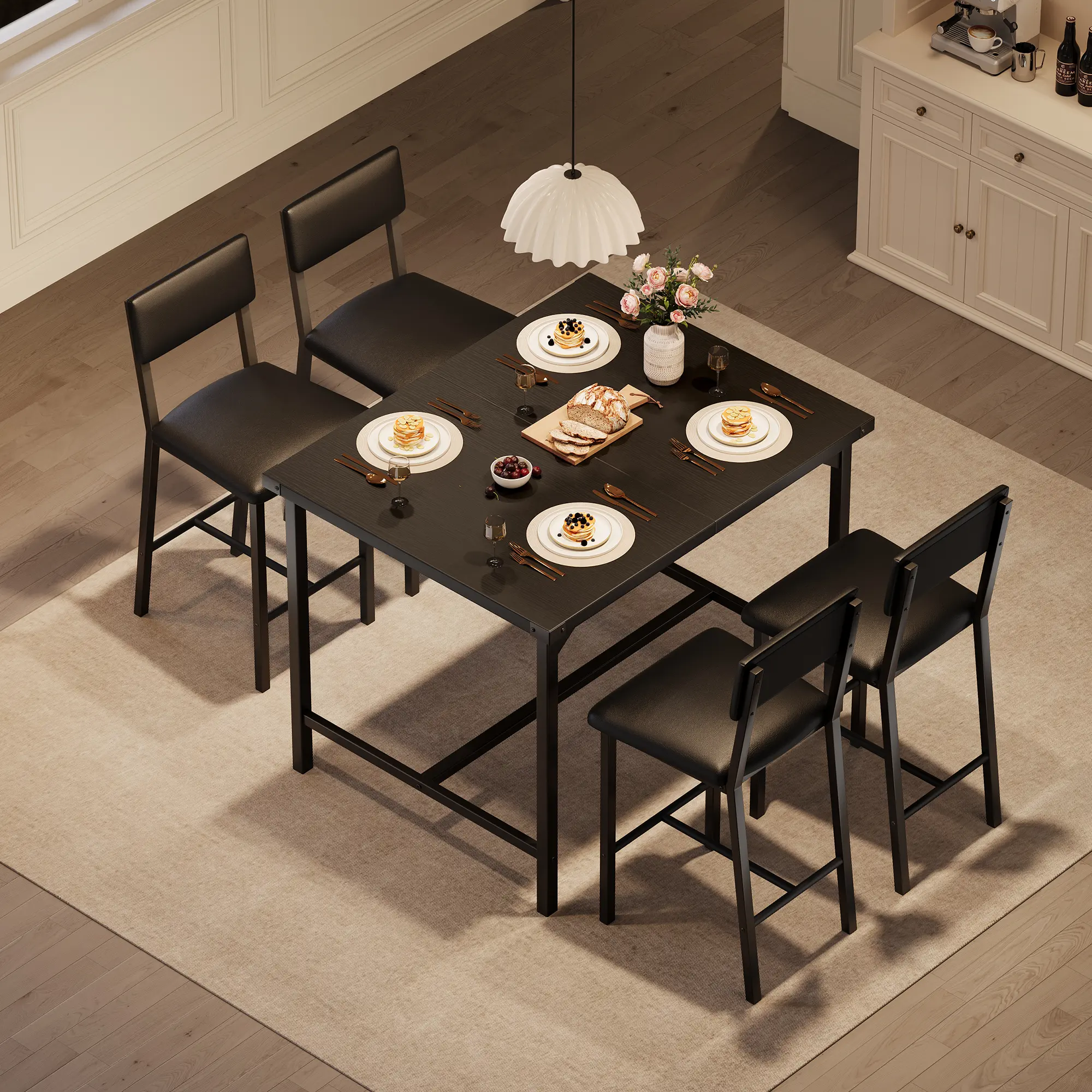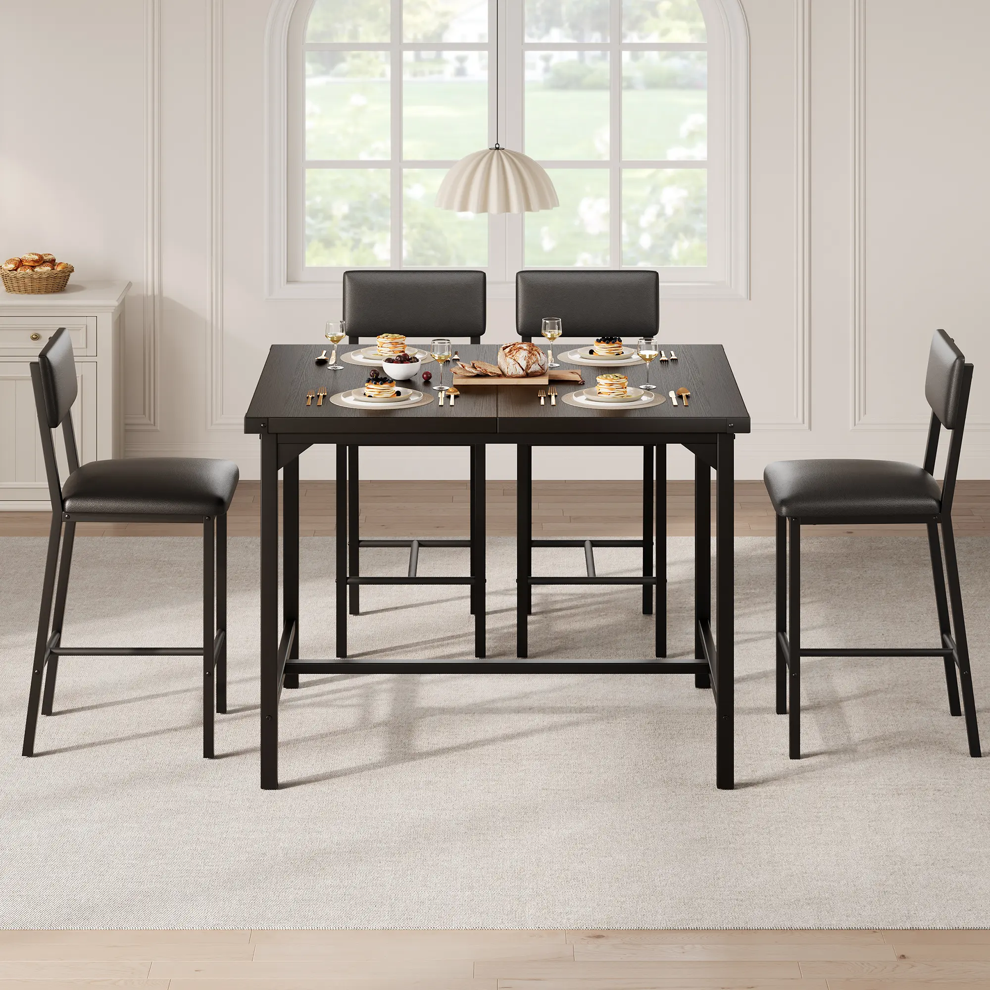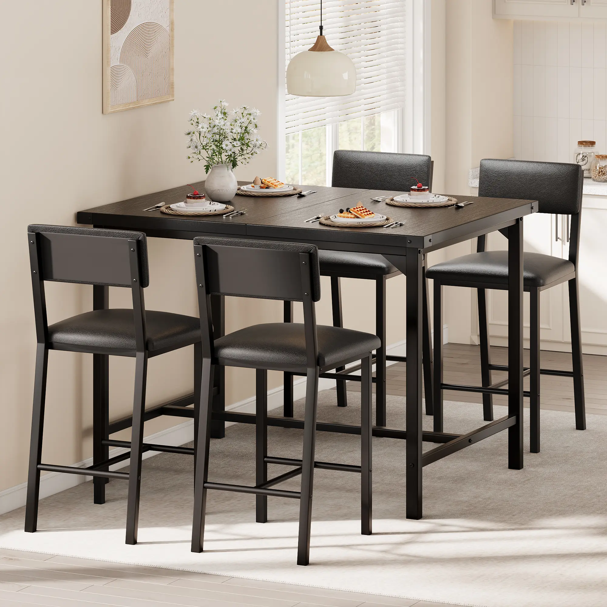 Metal Corner Guards: This 4-person dining set includes a bar-height table and 4 upholstered bar stools, perfect for sharing a meal or a drink with loved ones. Sturdy metal corner guards protect against everyday bumps, ensuring the table's durability and appearance remain intact. The modern design and beautiful wood grain finish add a touch of industrial chic that complements any home.