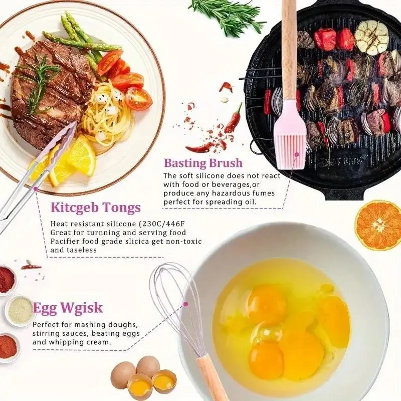 This set is made of food-grade silicone and reinforced with oak wood, with a heat resistance temperature up to 249°C. Heat-resistant silicone components prevent burns to hands while ensuring compatibility with nonstick cookware, avoiding scratches or damage to sensitive surfaces.