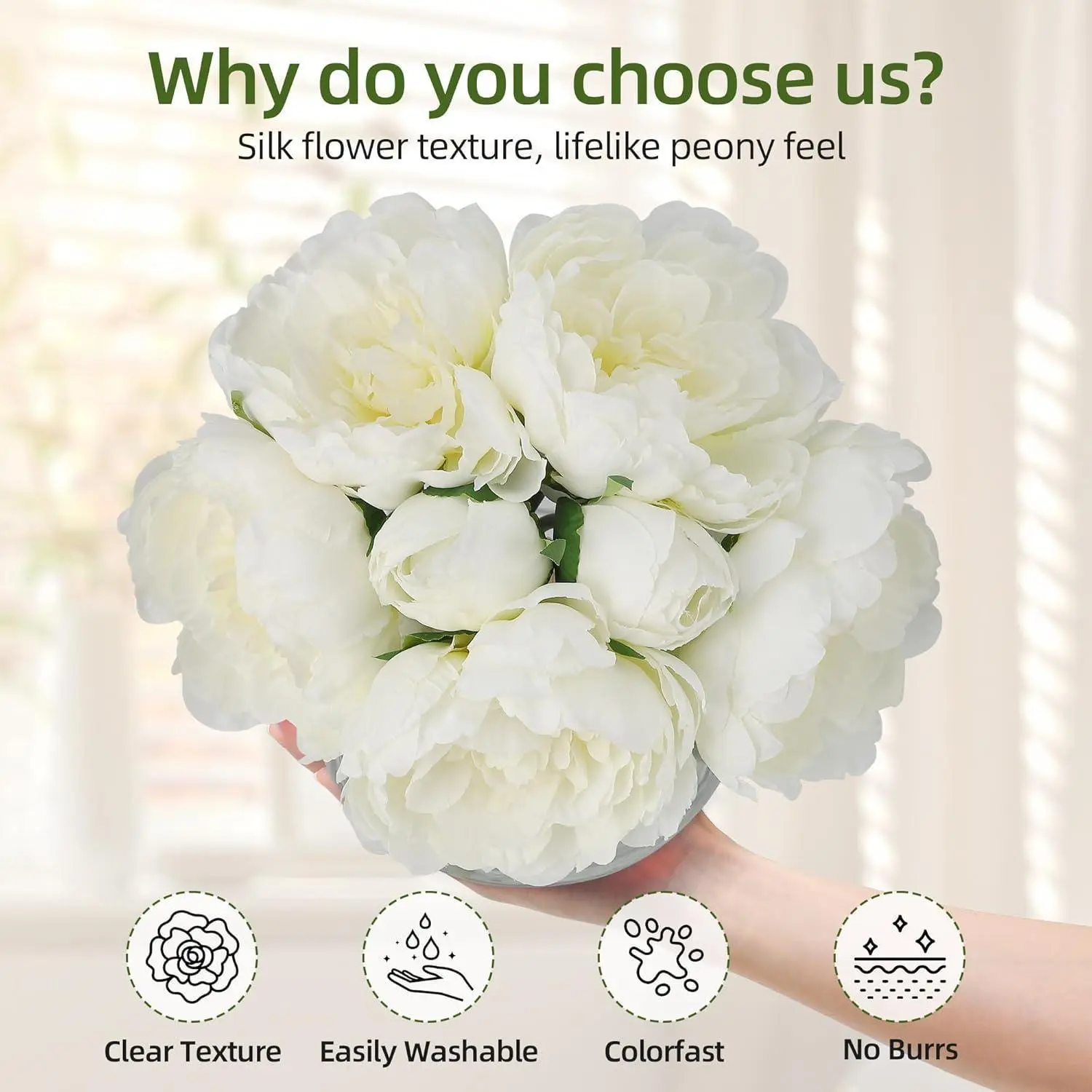 2.Premium Silk Flowers & Durable Materials Crafted from high-quality silk fabric using advanced molding techniques, these fake peonies offer a smooth, real-touch feel. Unlike fresh flowers, this artificial peony bouquet requires no watering or sunlight and stays vibrant and beautiful season after season.